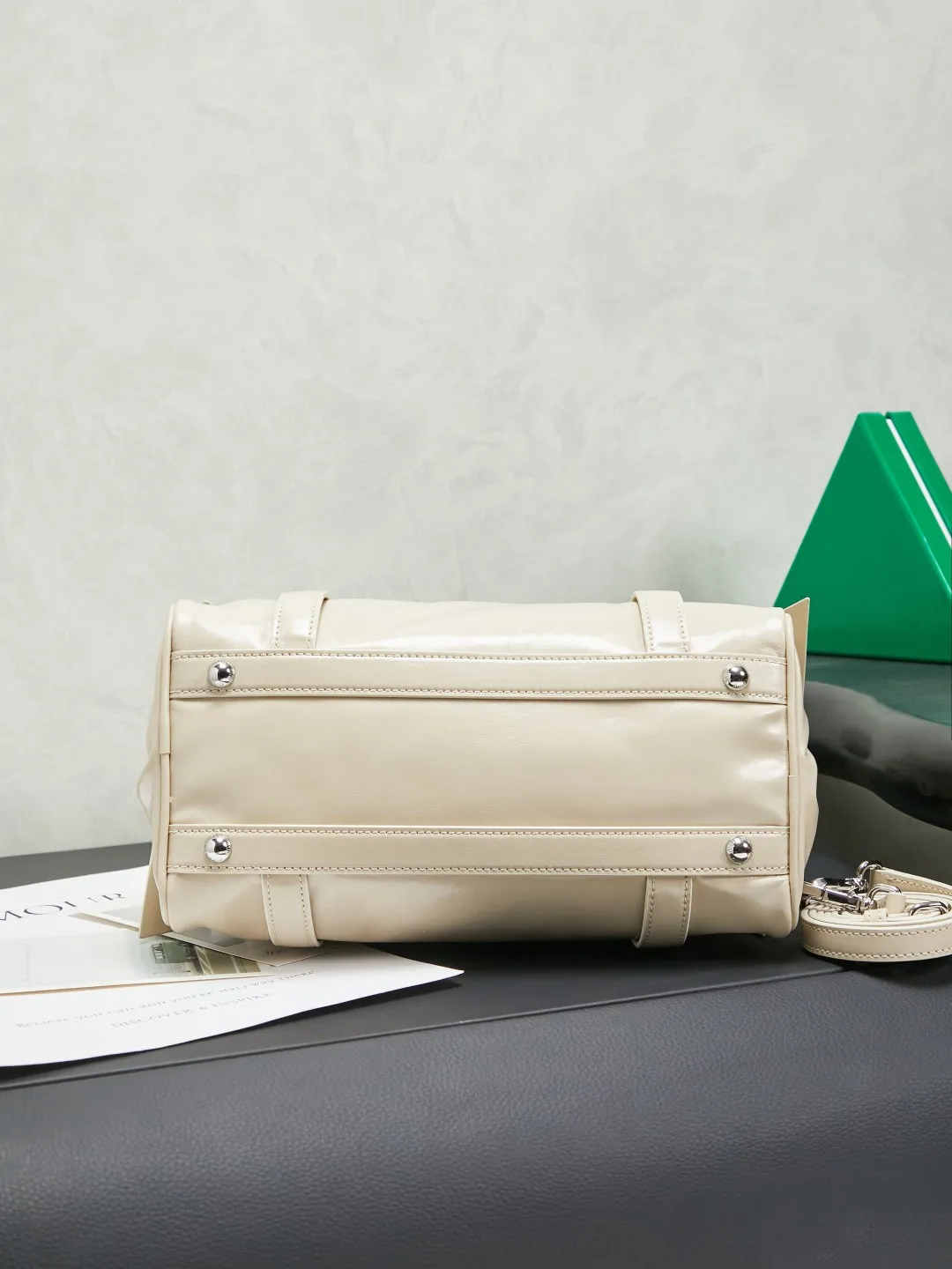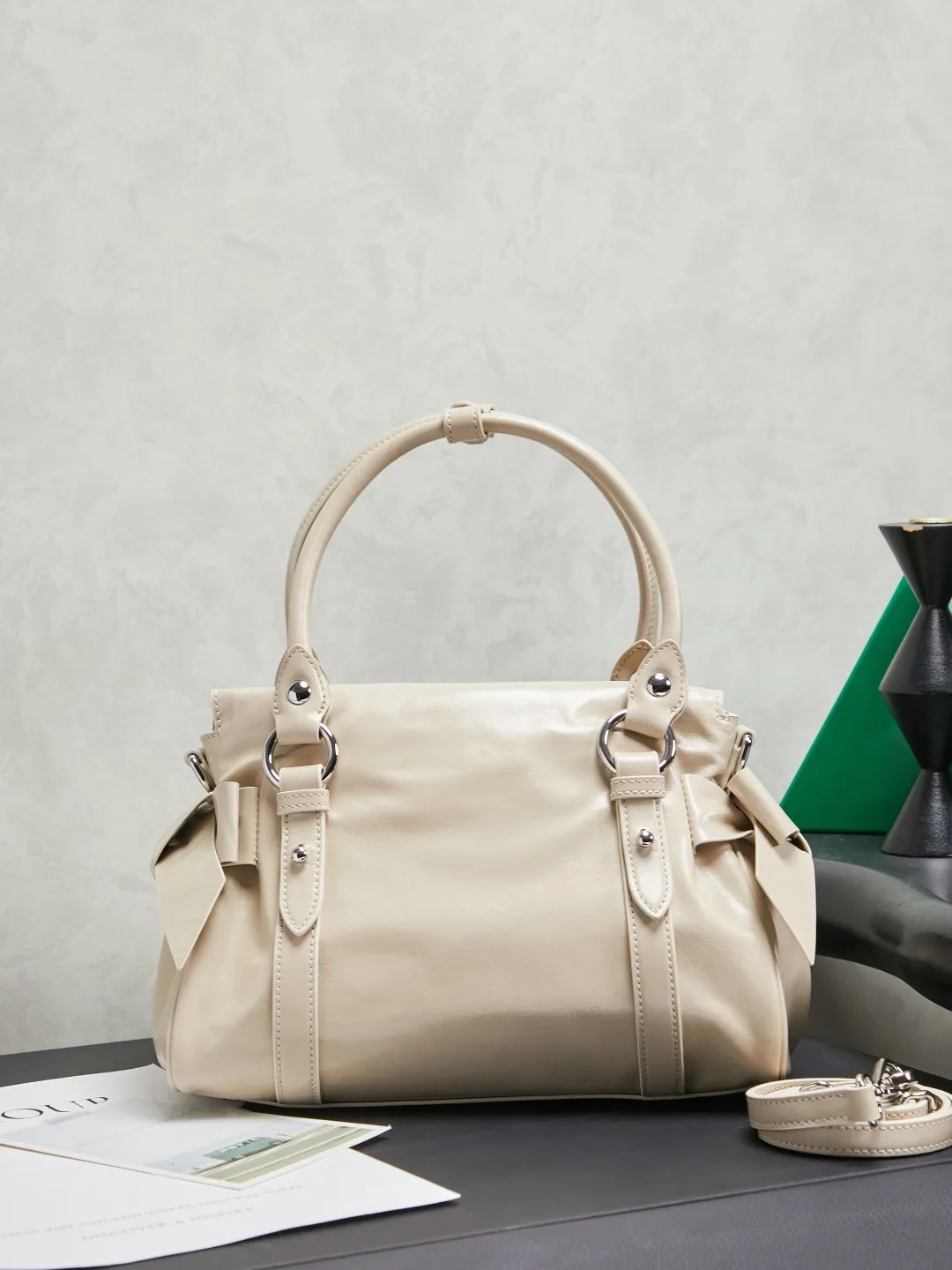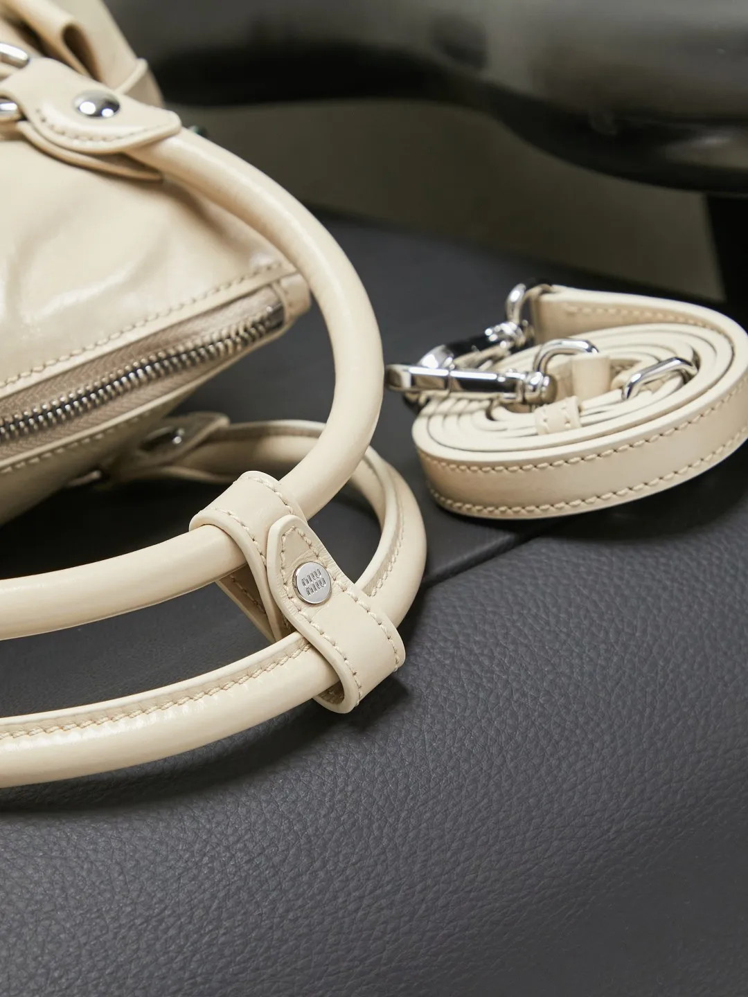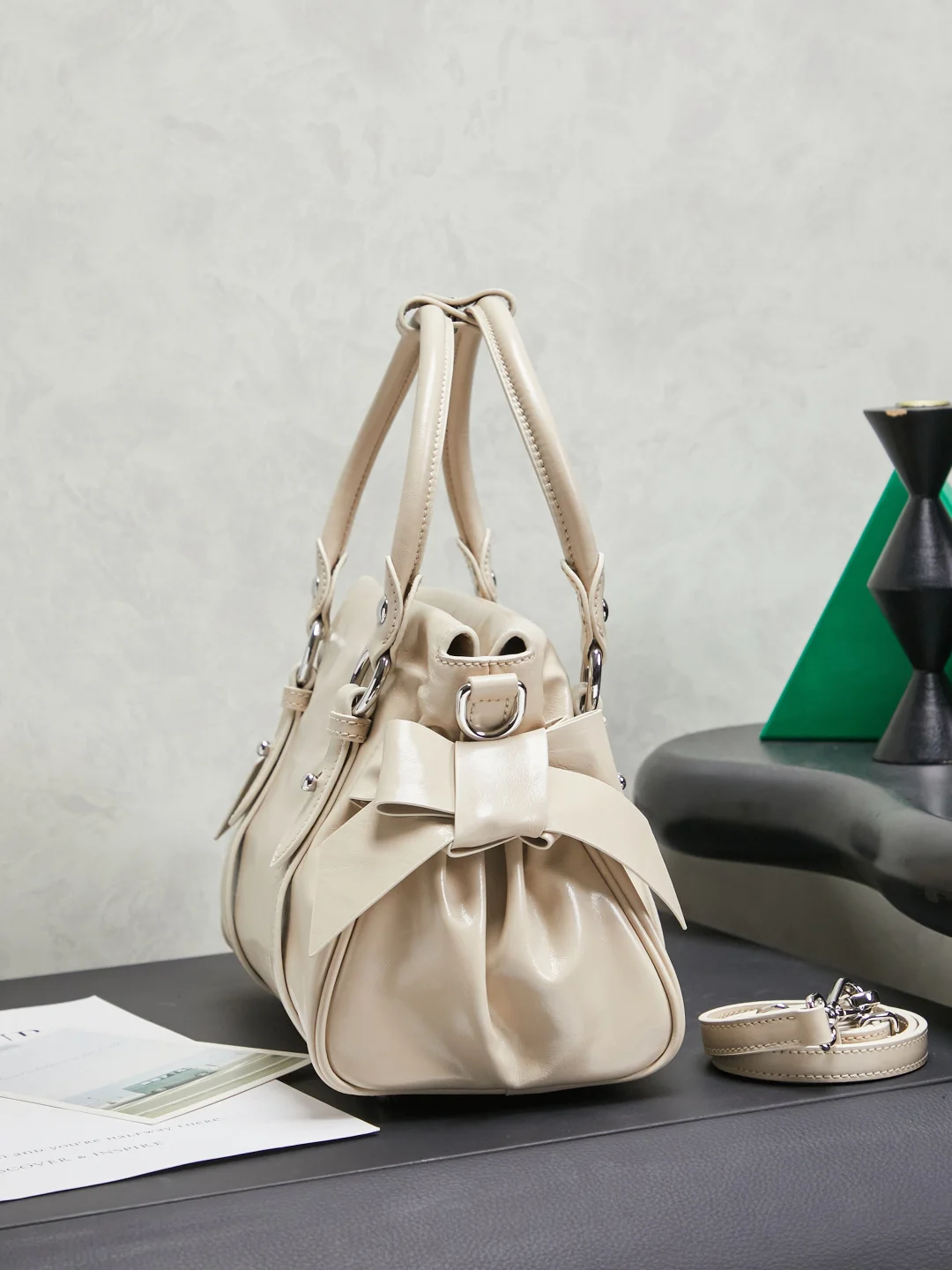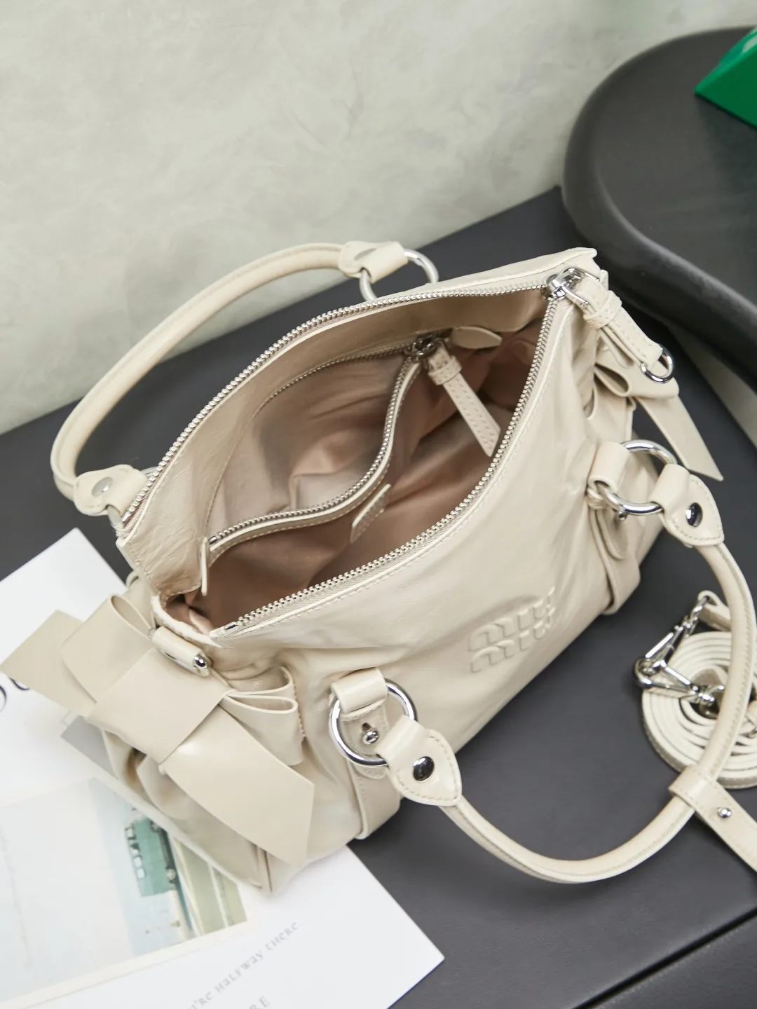 MIUMI 新品机车包手袋 型号5BA327 经典复刻Miu初代风格 复古油蜡皮 高级氛围感 甜酷风直接拉满 自带拉链与斜背肩带 包包拉链可以折进去适合多种风格造型 经典版型与趣味蝴蝶结结合 成就新型机车包