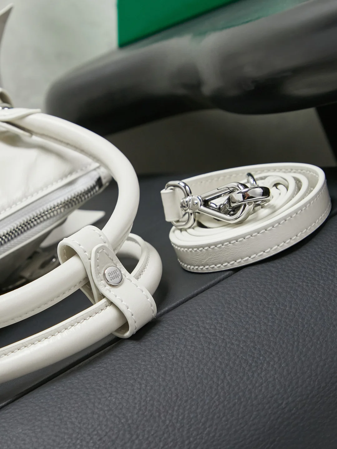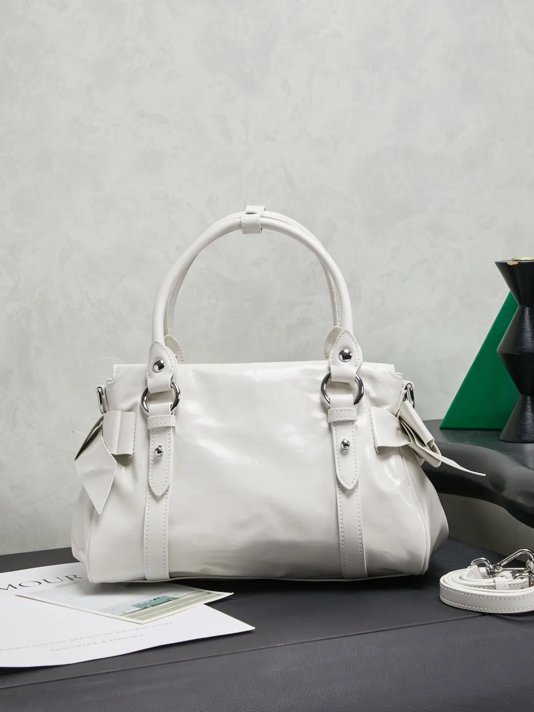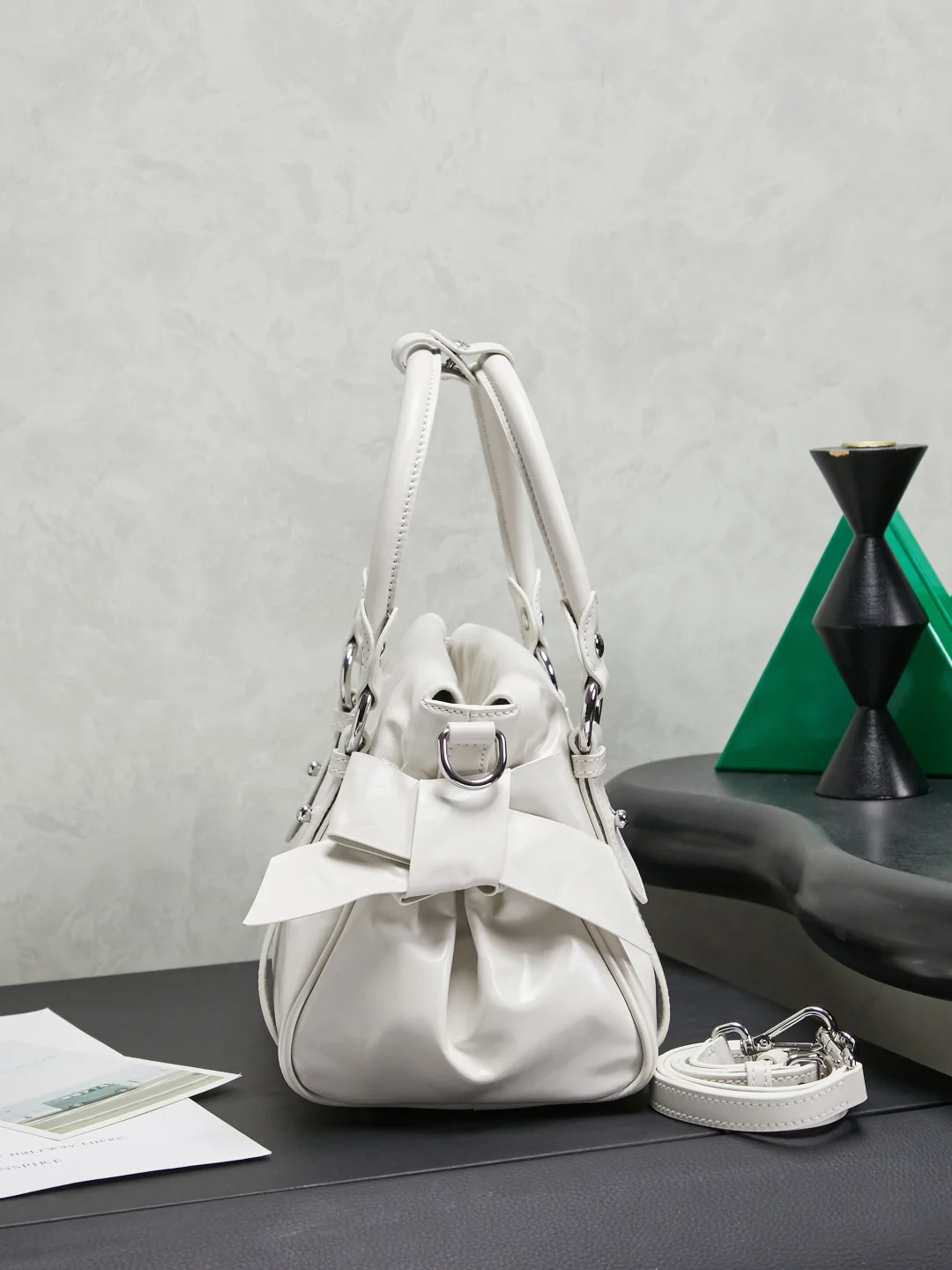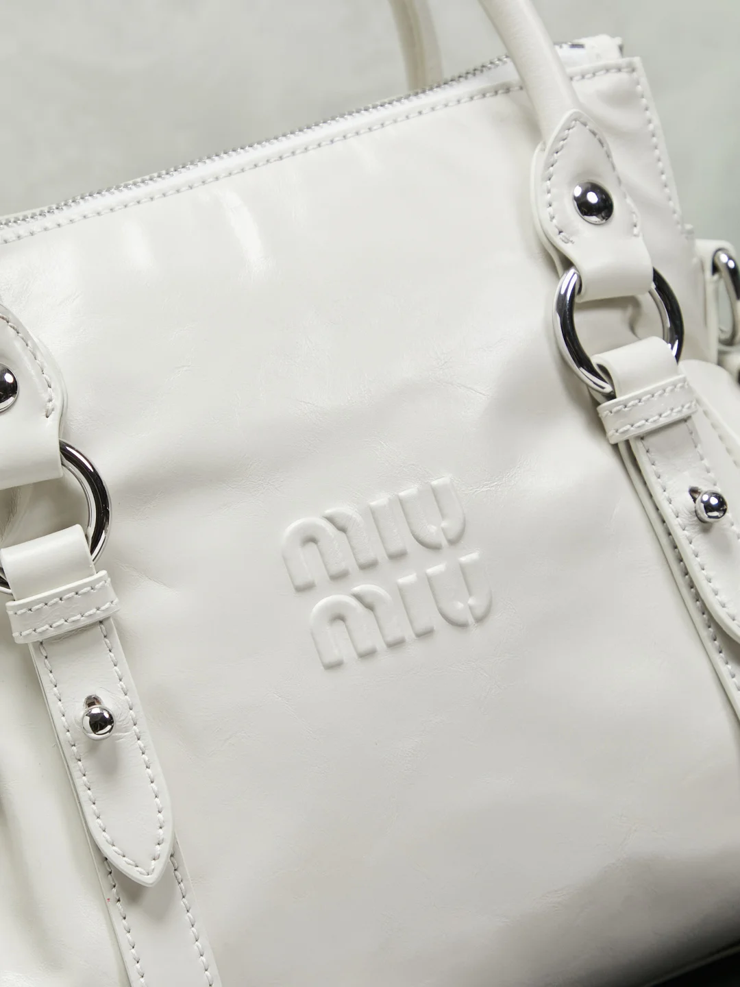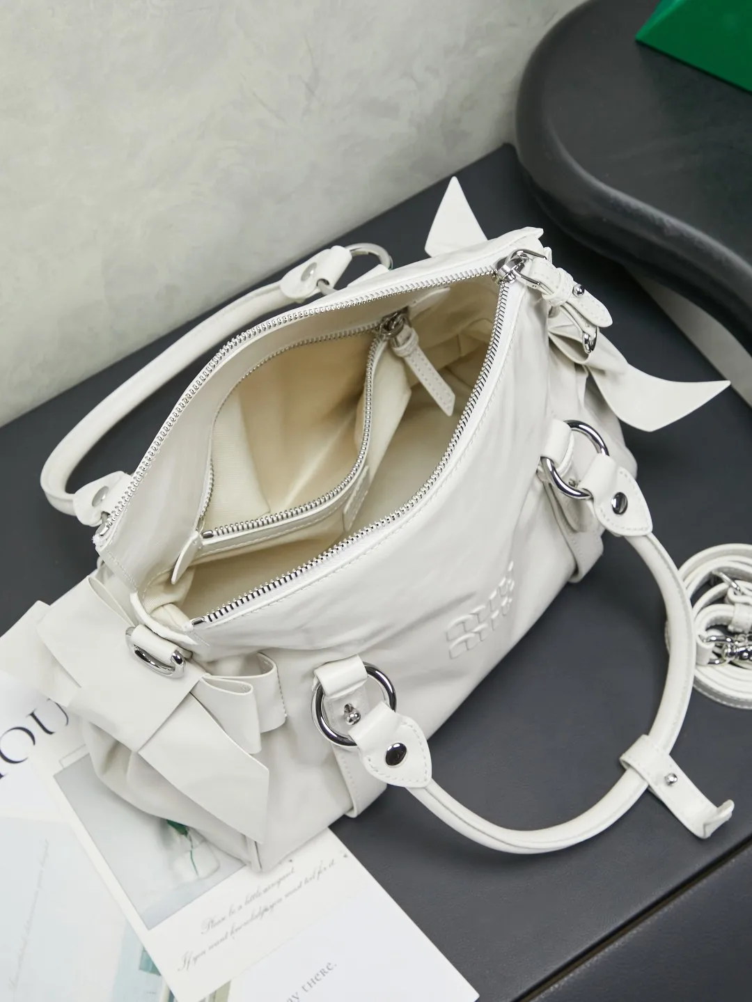 MIUMI 新品机车包手袋 型号5BA327 经典复刻Miu初代风格 复古油蜡皮 高级氛围感 甜酷风直接拉满 自带拉链与斜背肩带 包包拉链可以折进去适合多种风格造型 经典版型与趣味蝴蝶结结合 成就新型机车包