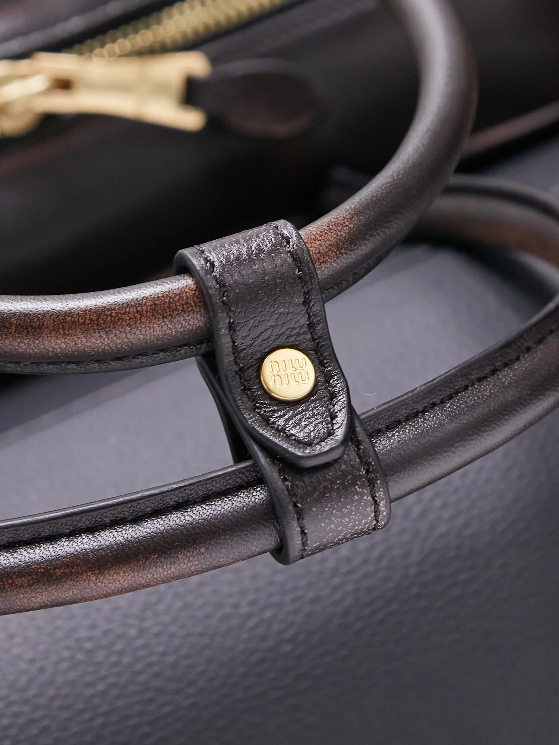 5BB117 MiuMiu新品保龄球包 采用顶级进口小羊皮 皮质光滑细腻柔软 棉质缎面衬里 这款包包很酷 定格精致的多功能设计 融合男装和女装素 随性慵懒 自然洒脱 充满个性 超大容量还很轻便 简约却不简单 各大时尚搏主几乎人手一个 尺寸 34X23X12cm 配原版包装