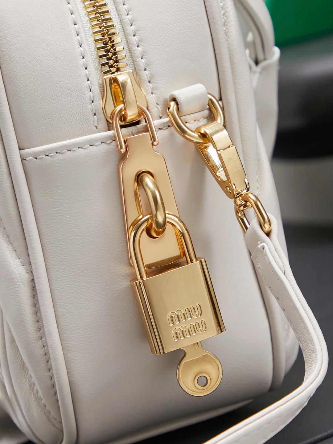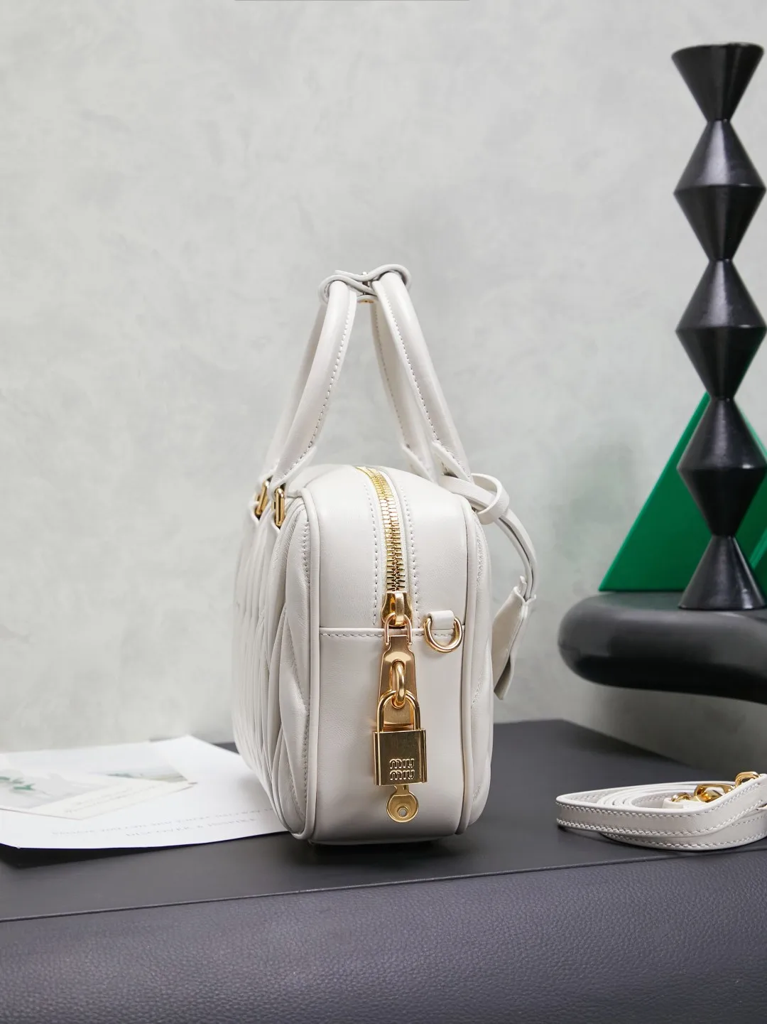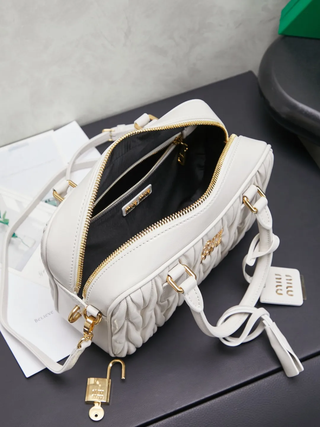 5BB124 MiuMiu新品too pretty保龄球手袋 采用进口小羊皮经典品牌标志性Matelasse纹理绣花 复古磨砂五金 保留了应有的俏皮感 包型整体硬挺有型 充满个性 可甜可盐 容量可光 各大时尚搏主几乎人手一个 火爆程度不亚于之前的MiuWander 大号尺寸 24X16X7.5CM