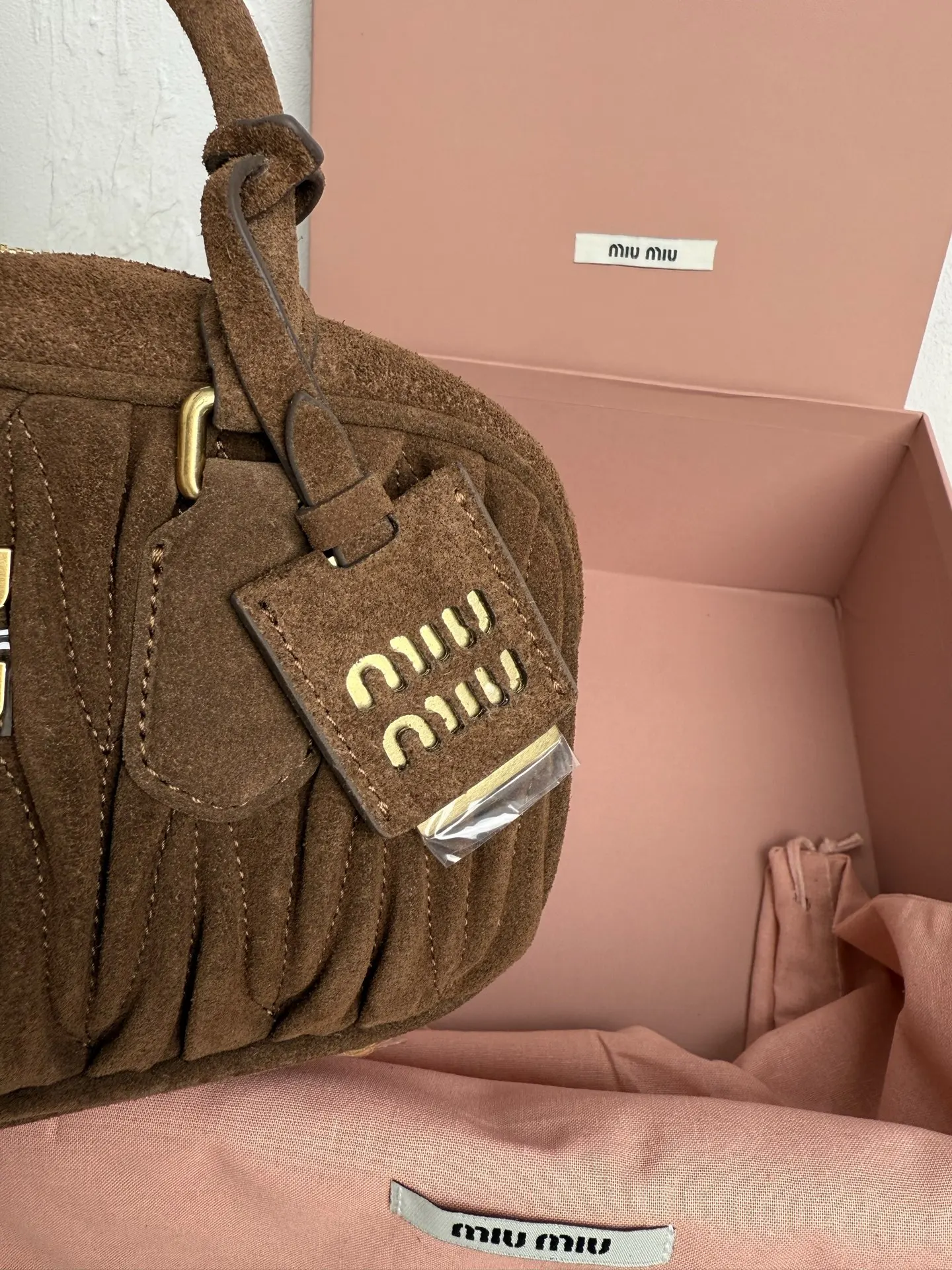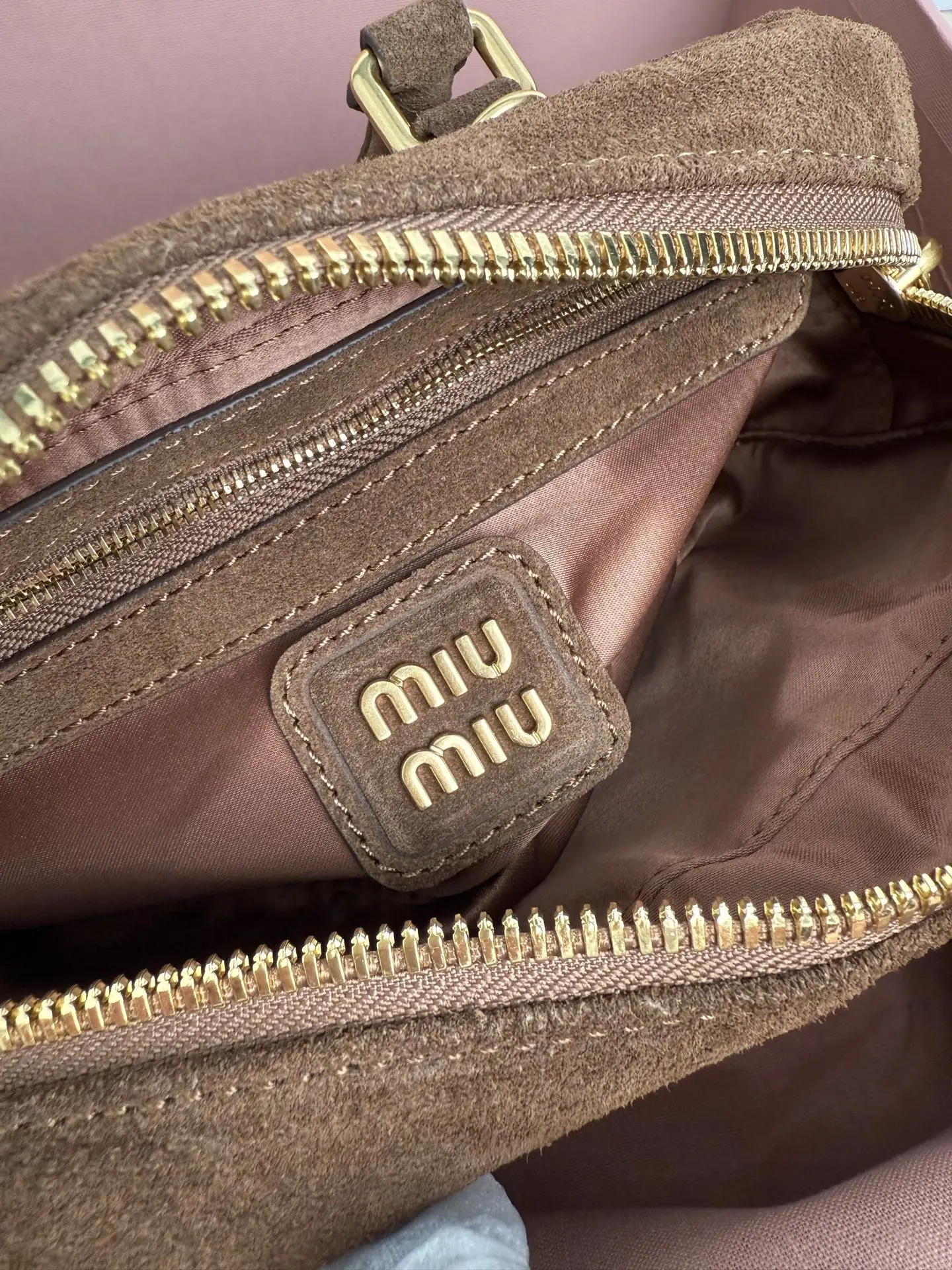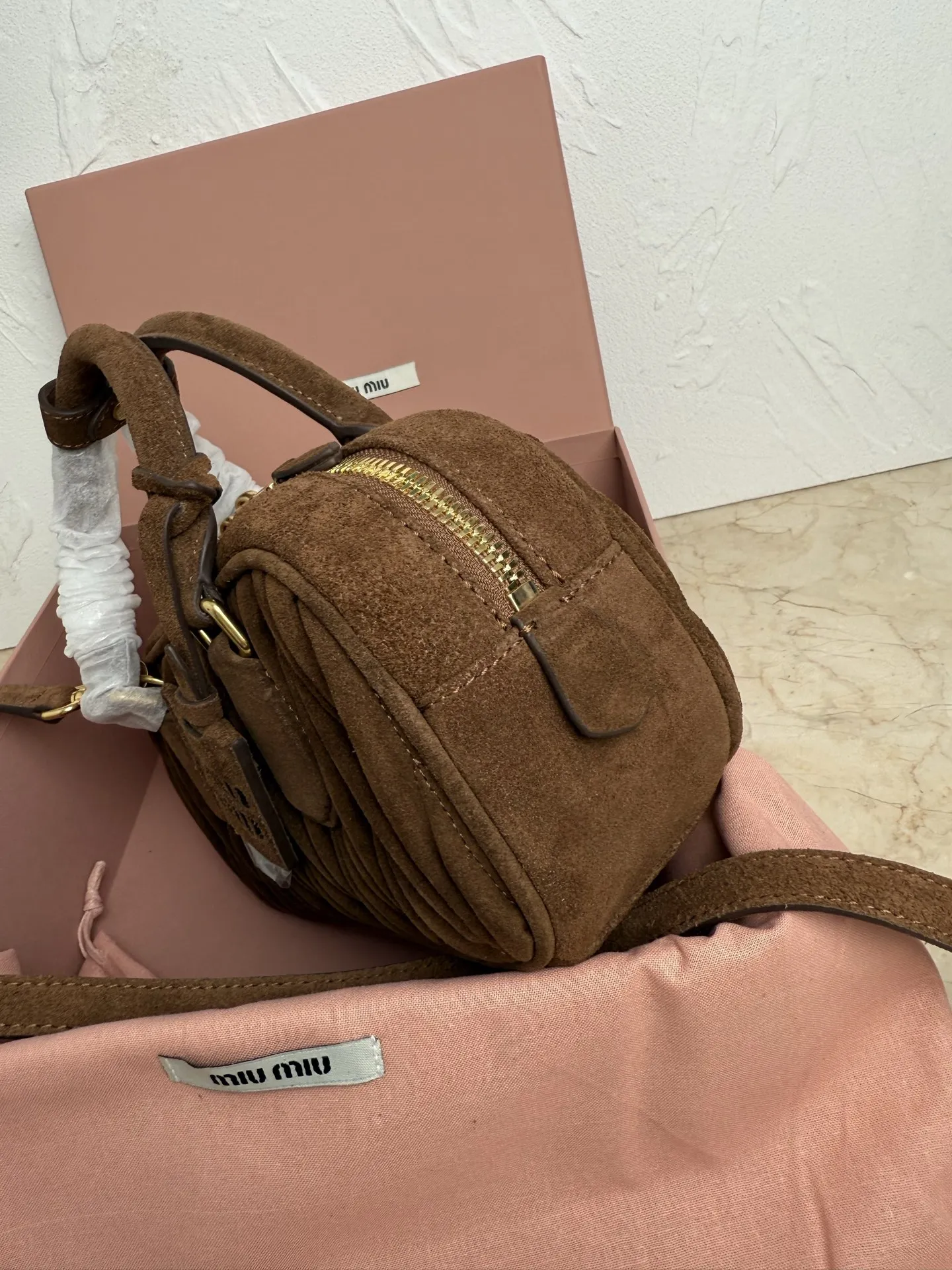 5BB142 Miu家新款保龄球包包 火爆这个秋冬的麂绒皮元素 顶级头层麂绒小牛皮 包身精致立体有型 正面刻字徽标与皮革颜色相呼应 可拆卸可调节皮革长肩带 全新帆布衬里 配拉链式口袋 众多明星网红同款