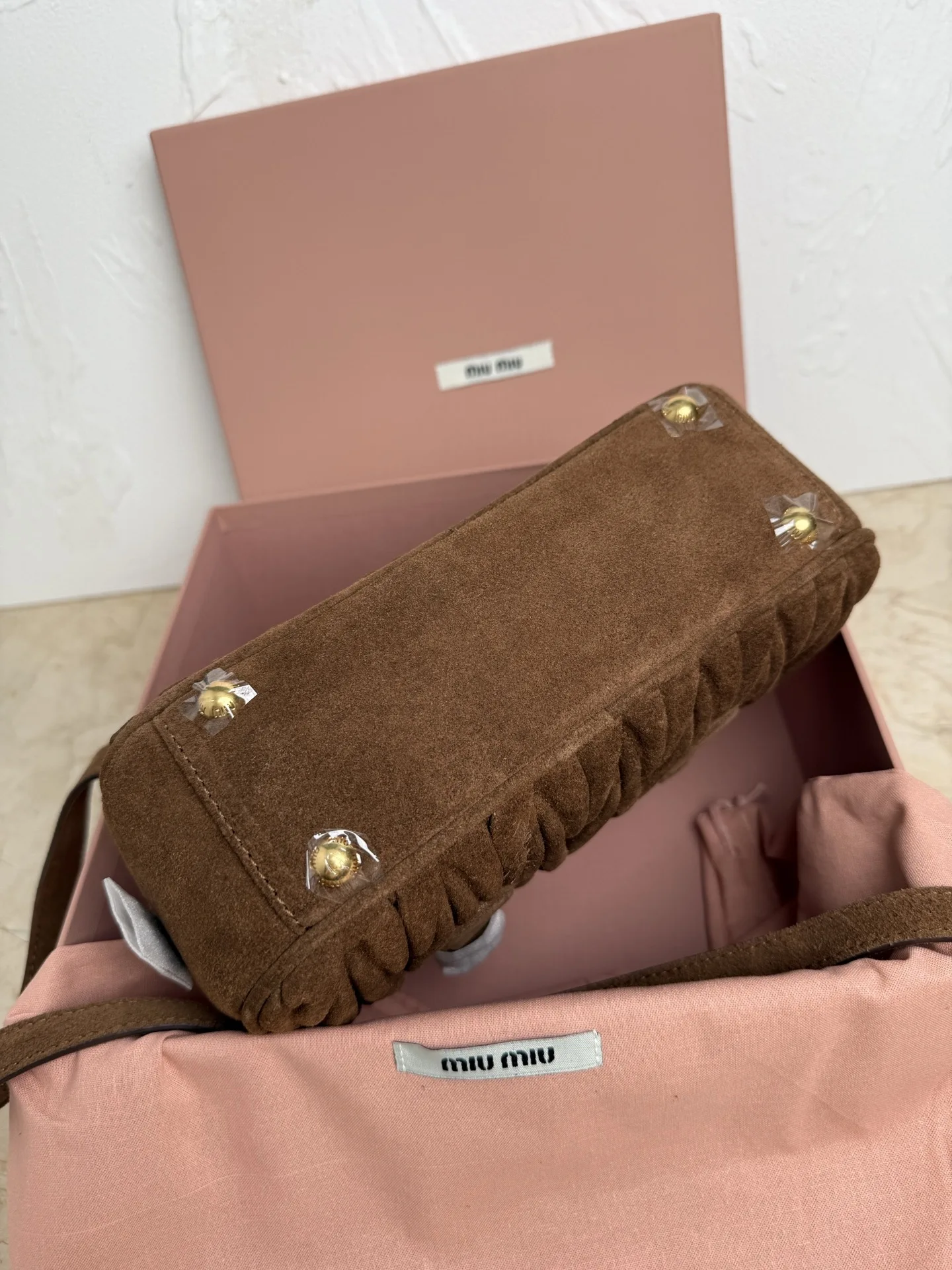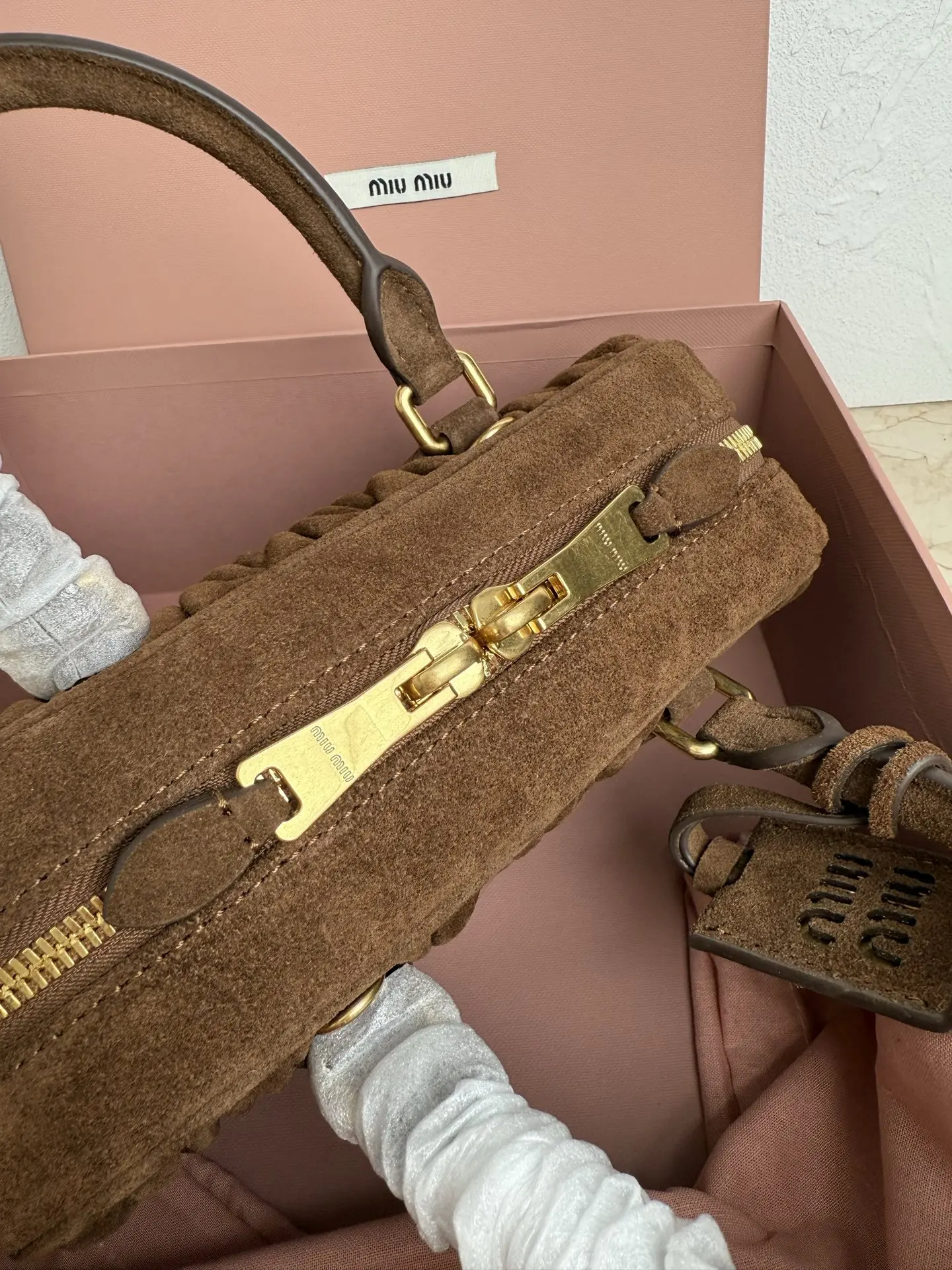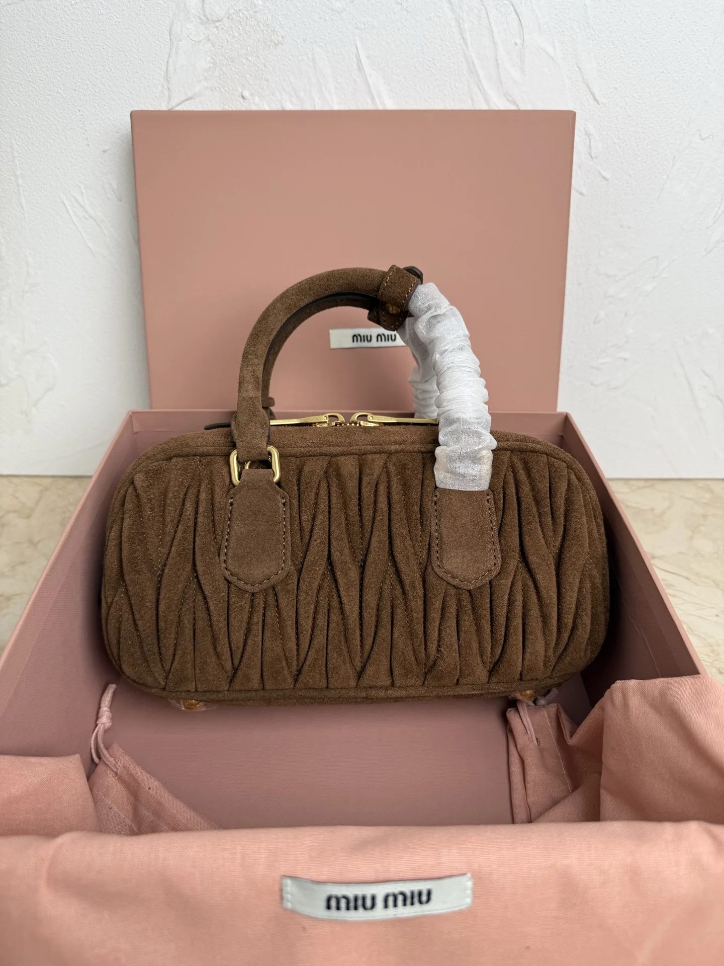 5BB142 Miu家新款保龄球包包 火爆这个秋冬的麂绒皮元素 顶级头层麂绒小牛皮 包身精致立体有型 正面刻字徽标与皮革颜色相呼应 可拆卸可调节皮革长肩带 全新帆布衬里 配拉链式口袋 众多明星网红同款