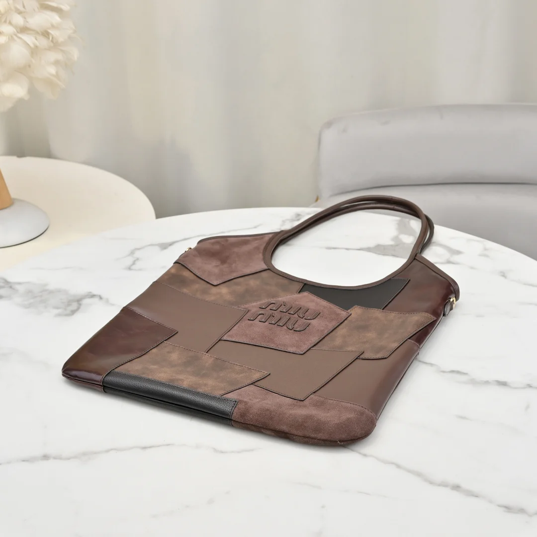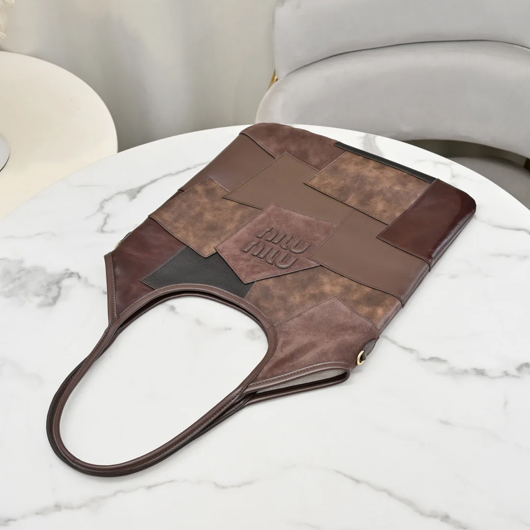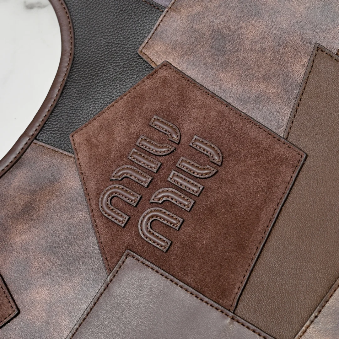 5BG231 Miu家新款伊势丹限定托特包 重手工制作 多种皮质拼接而成 大胆创新的设计完美诠释了 Miu不拘一格 潇洒随意包容的人生态度 今年绝对式 顶级进口小牛皮 质感高级 包身软而不塌 气质随性慵懒 容量超大 日常出街背它回头率百分百 手工缝制皮面Logo标志 内里全新麻布里 配拉链式口袋 尺寸35 X 40Cm