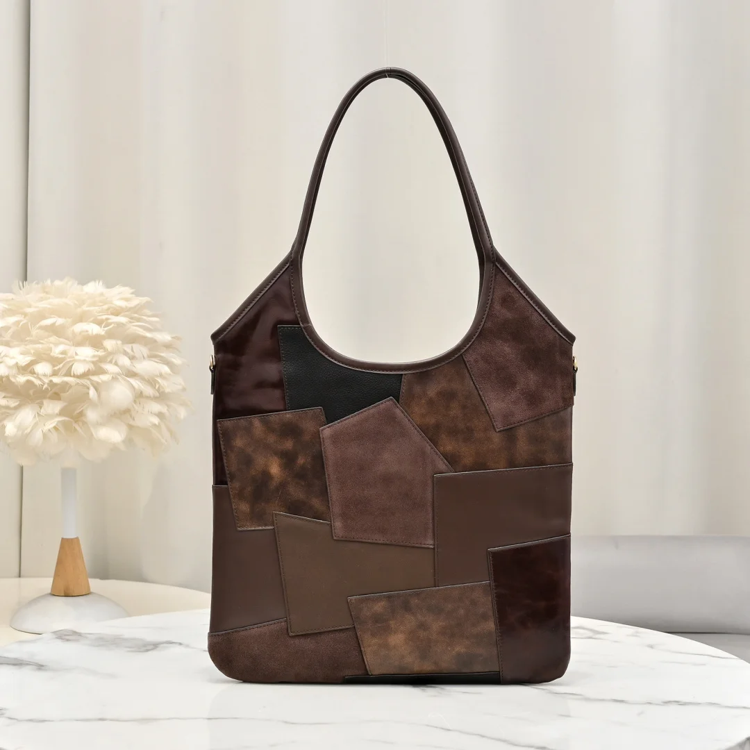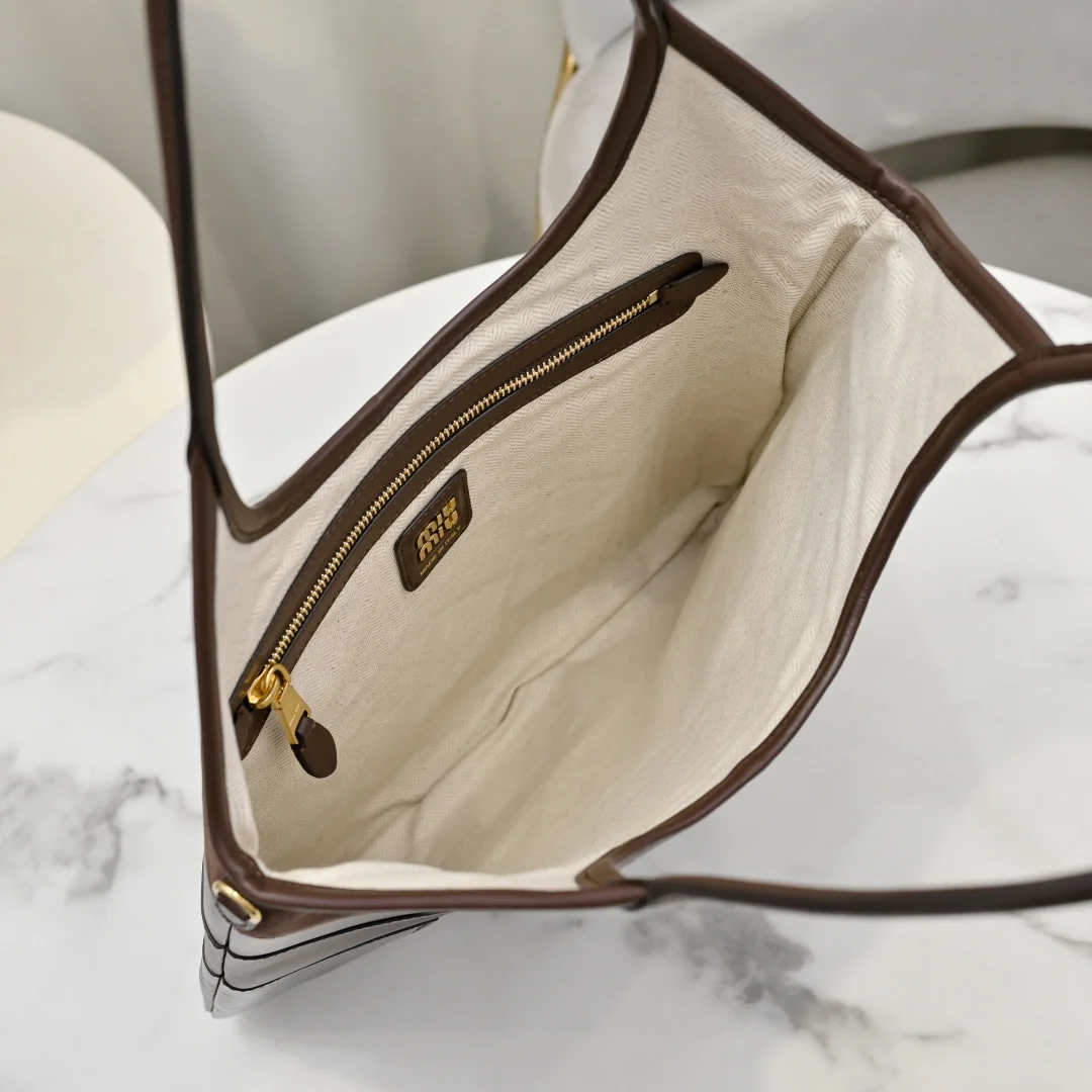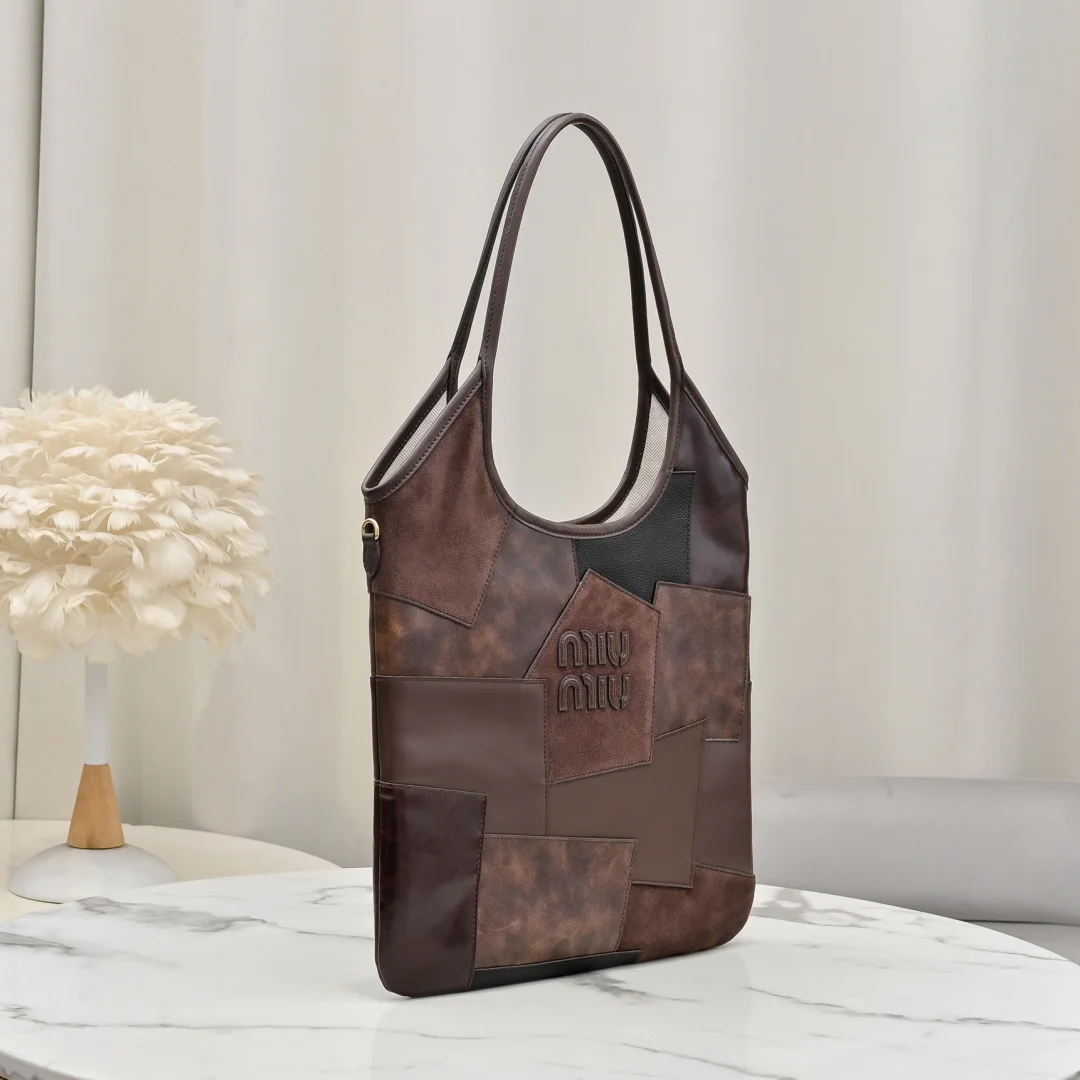 5BG231 Miu家新款伊势丹限定托特包 重手工制作 多种皮质拼接而成 大胆创新的设计完美诠释了 Miu不拘一格 潇洒随意包容的人生态度 今年绝对式 顶级进口小牛皮 质感高级 包身软而不塌 气质随性慵懒 容量超大 日常出街背它回头率百分百 手工缝制皮面Logo标志 内里全新麻布里 配拉链式口袋 尺寸35 X 40Cm