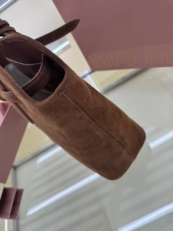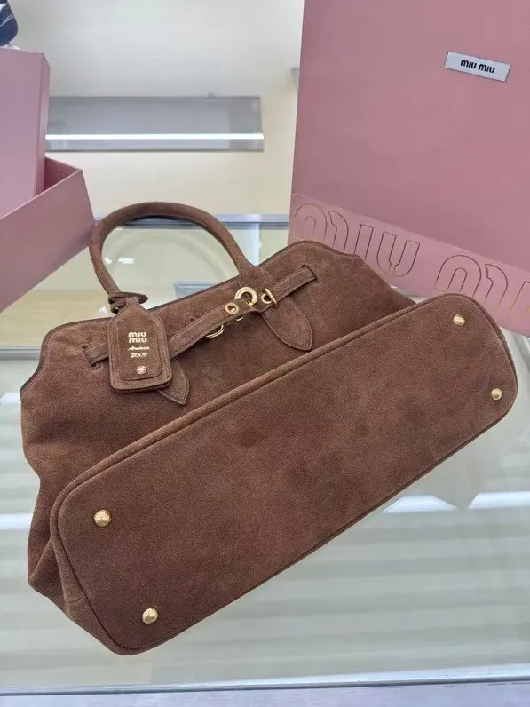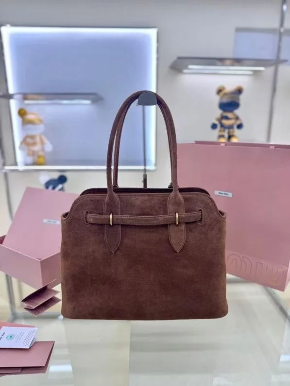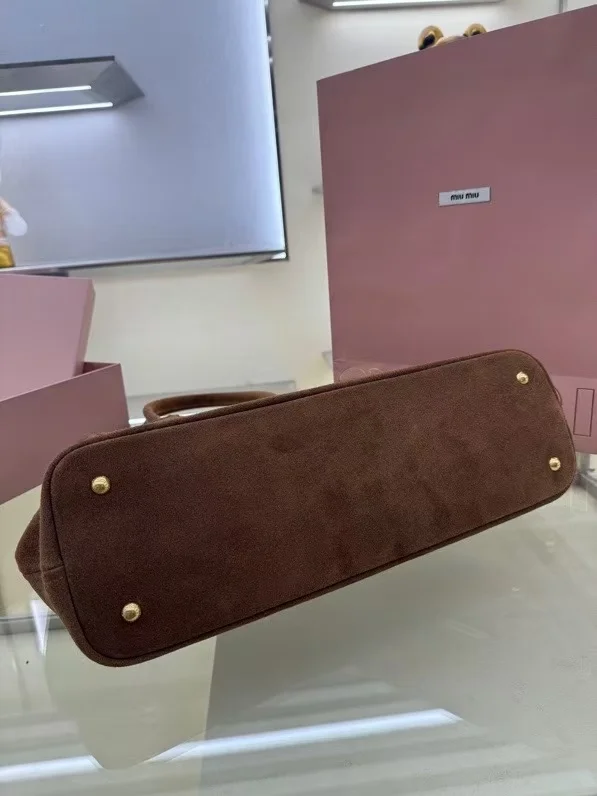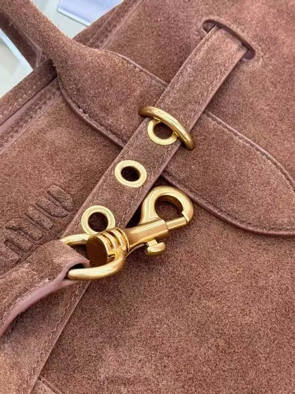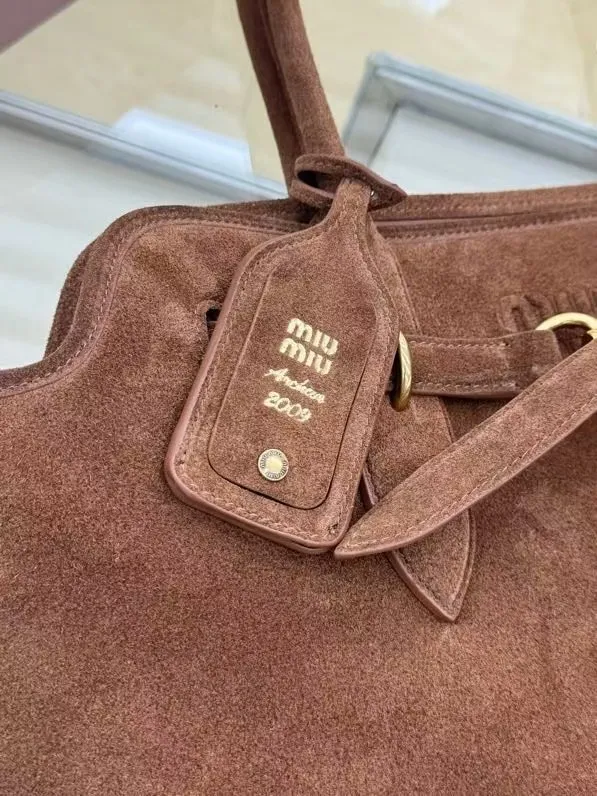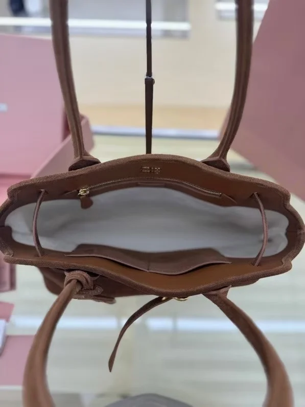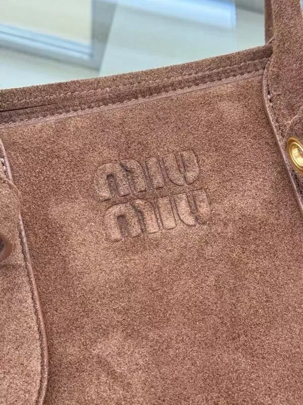 M家鹿绒棕 5BG291 新品爆款中古托特包 采用今年爆火的麂皮材质 皮质柔软高级 这款aventure nappa皮革手袋灵感源自miu典藏设计 结构经过调整 变得更加轻便 焕发全新个性 饰以压花字母徽标 增添标志性元素 复古金色五金配件 亚麻混纺衬里 配拉链口袋和贴袋 长手腕适合用作手提或单肩 尺寸 31 x 40 x 13cm