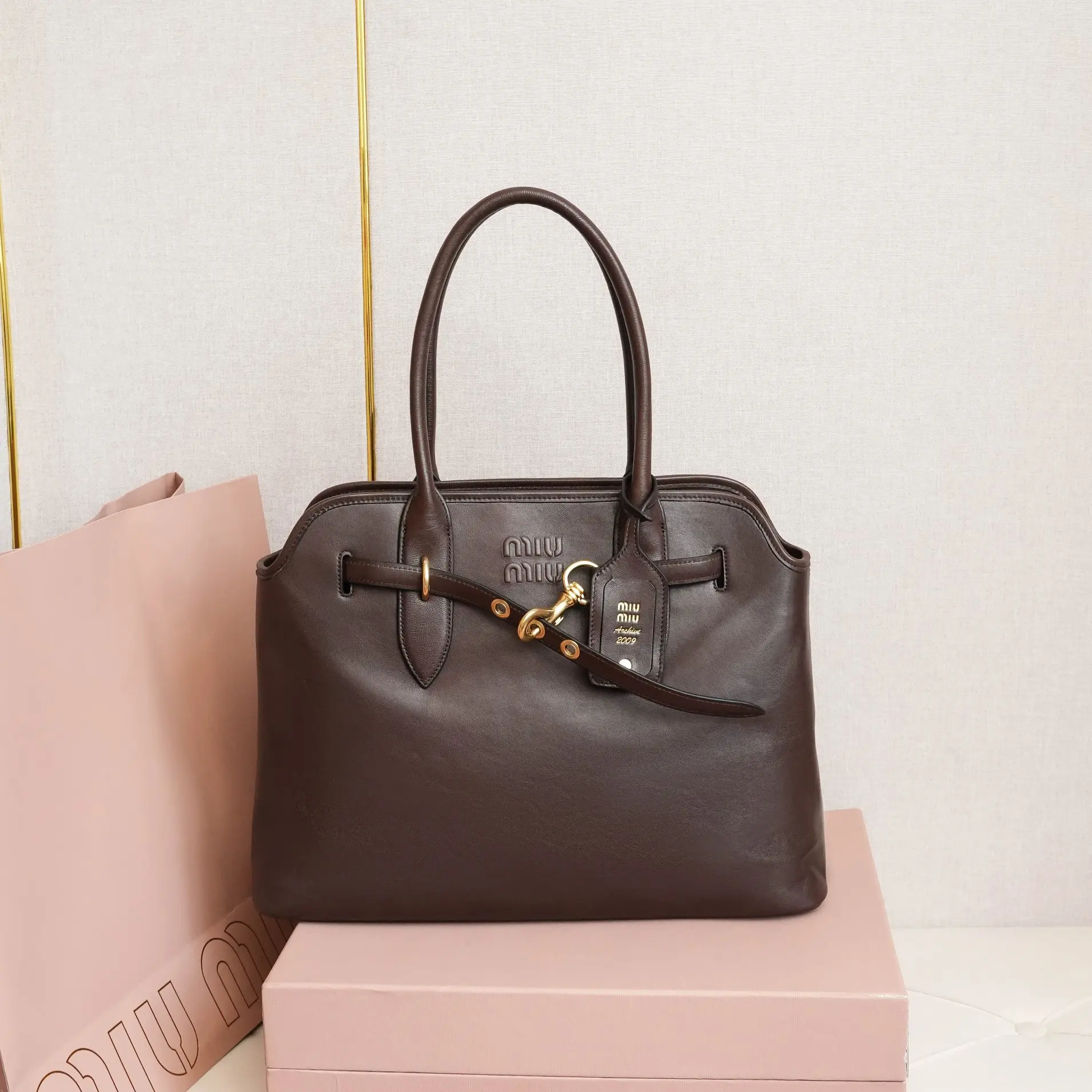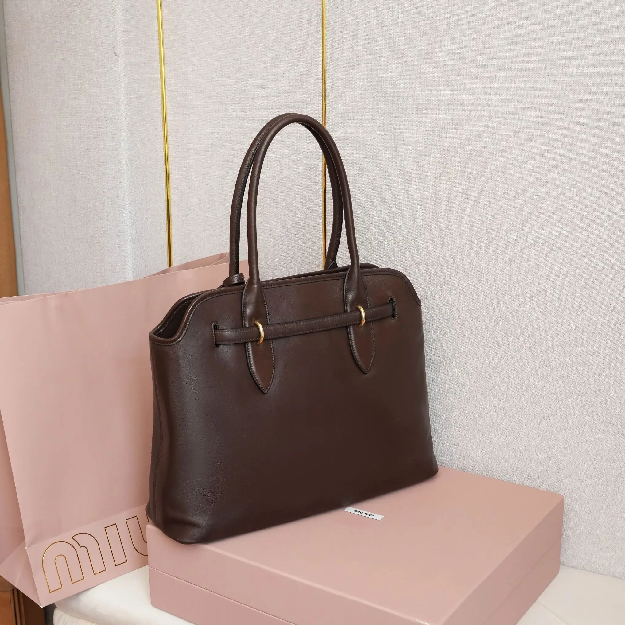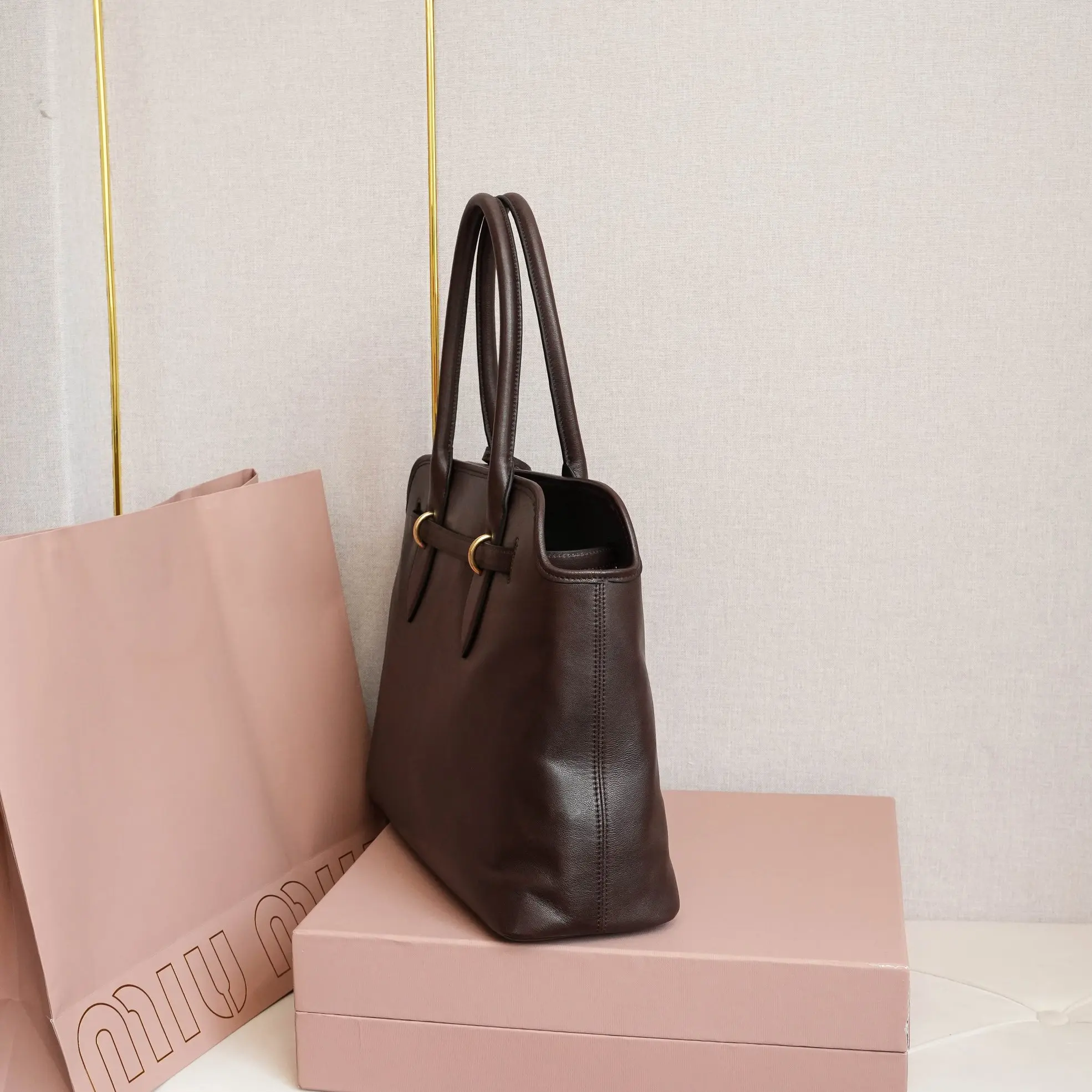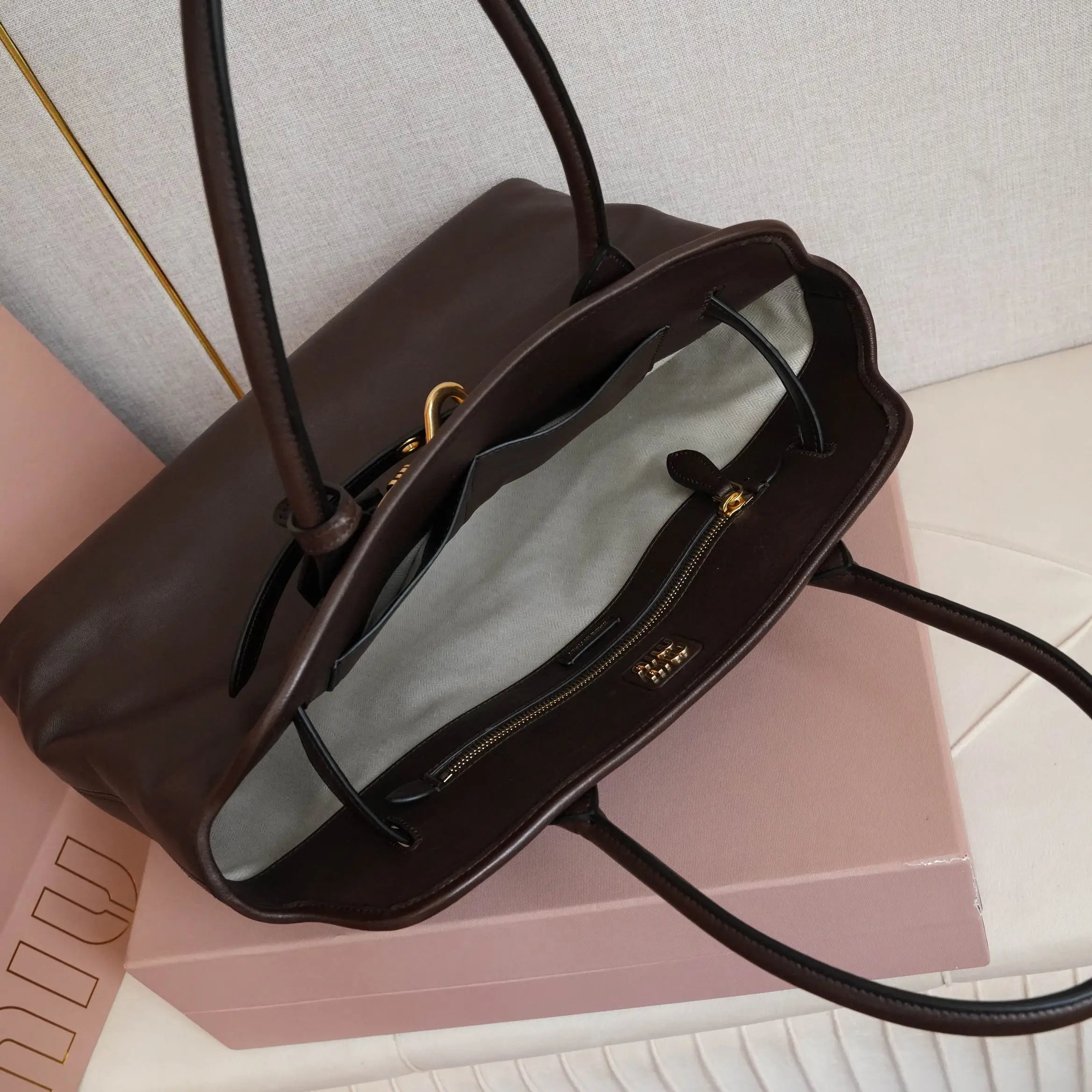 5BG291新品中古托特包 采用全新柔脂羊皮 皮质柔软高级 这款aventure nappa皮革手袋灵感源自miu典藏设计 结构经过调整 变得更加轻便 焕发全新个性 饰以压花字母徽标 增添标志性素 复古金色五金配件 亚麻混纺衬里 配拉链口袋和贴袋 长手腕适合用作手提或单肩 尺寸 31x40x13cm 配原版包装