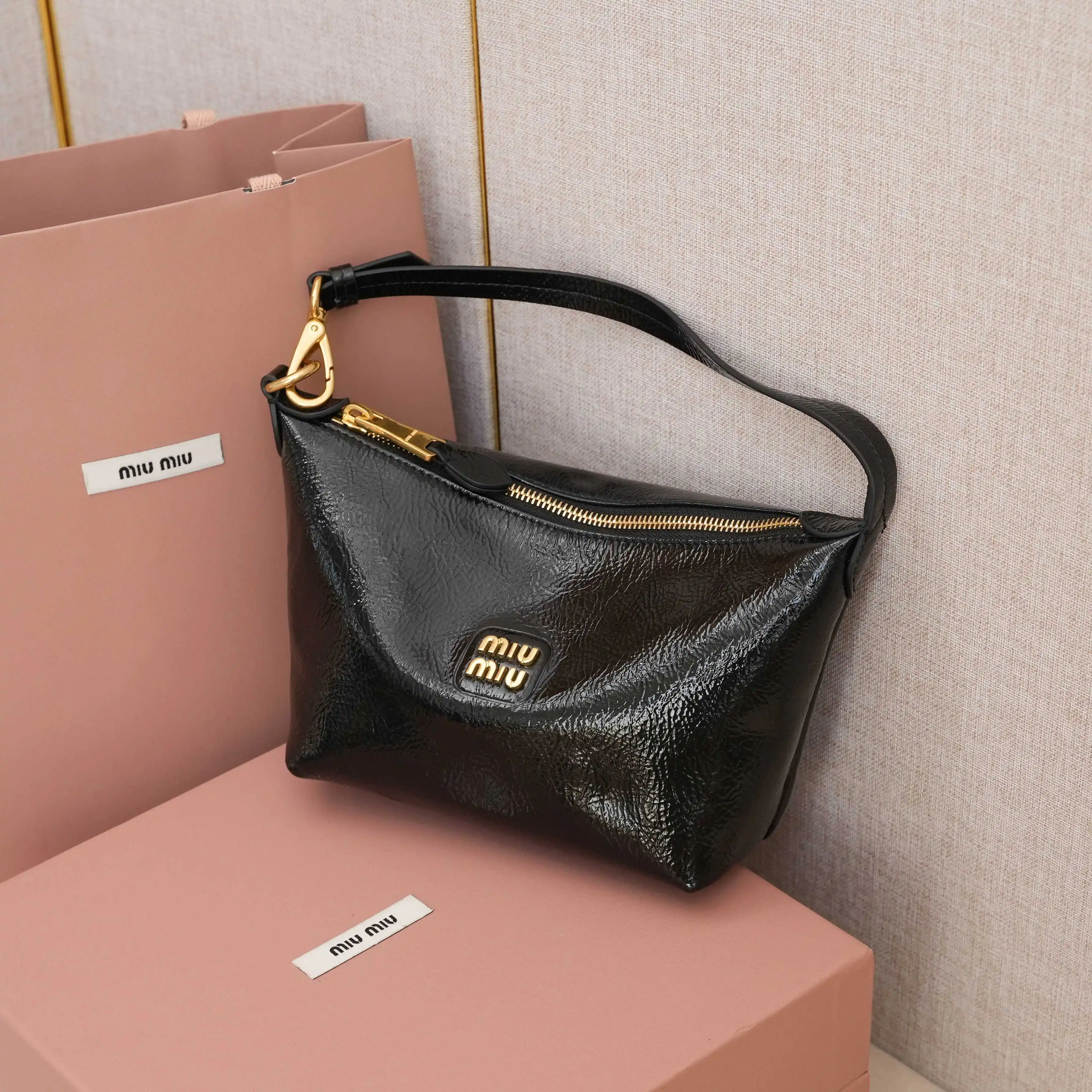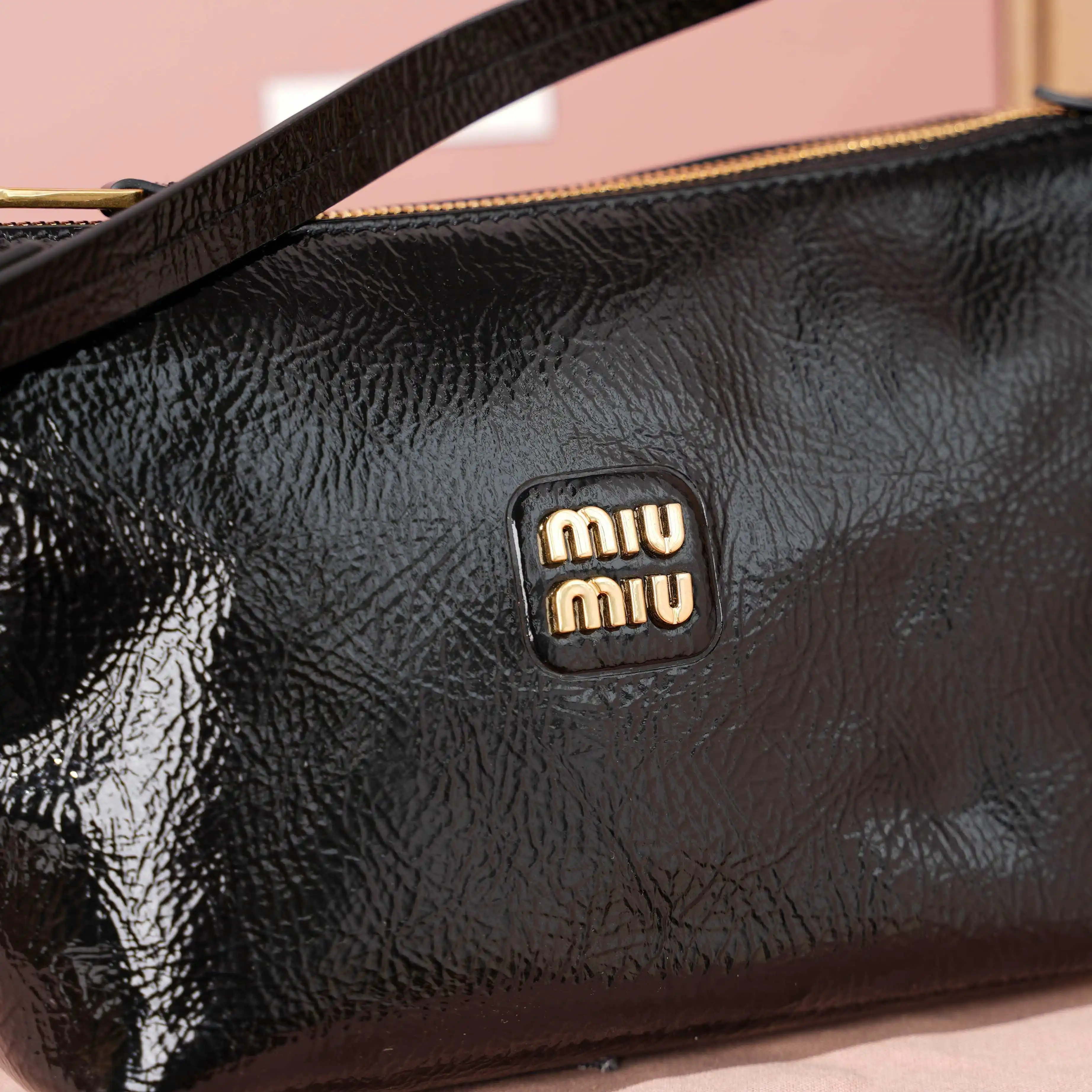 5NE841 新品油蜡漆皮饭盒包 独特的冰裂纹理 正面标志性 Miu金额logo 棉布内里 超轻 容量大 怎么搭都好看 一年四季都适用 尺寸 底长19cm 开口宽25.5cm 高14cm 底部宽10cm