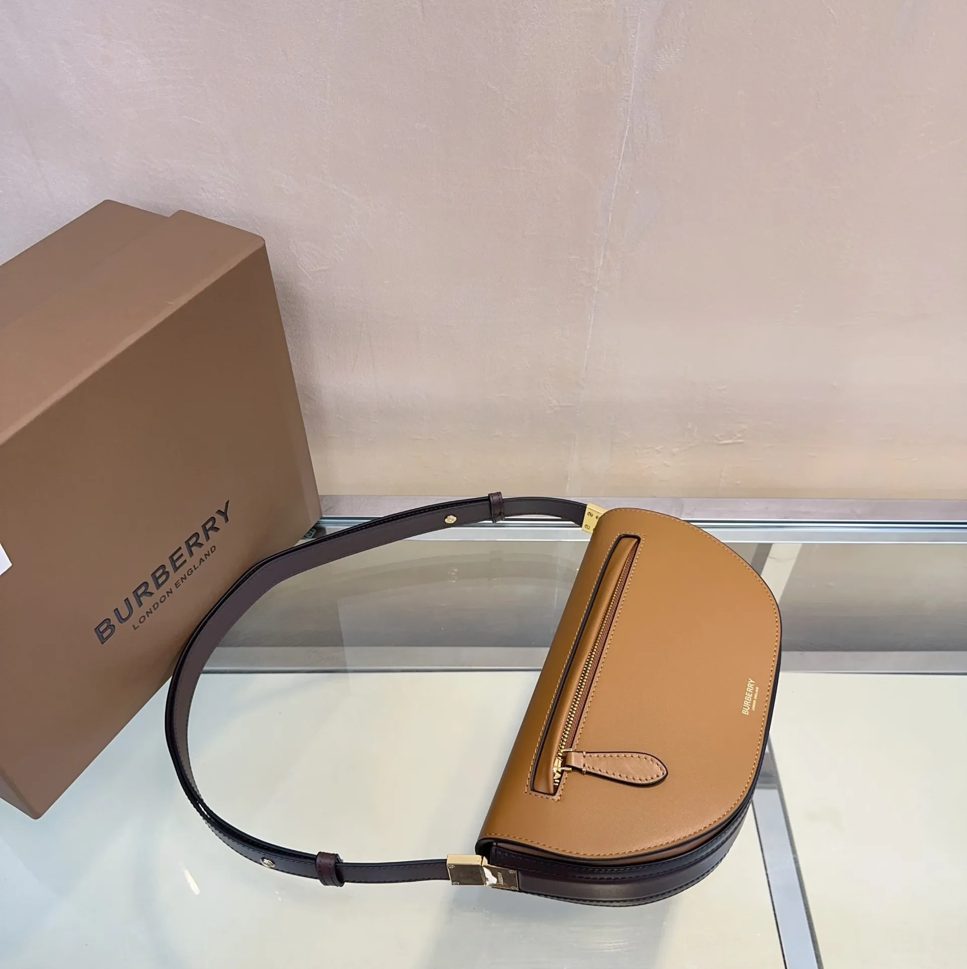 顶级 B家最新时装秀款肩背包 采用纤巧立挺的版型设计 精选两种色调的光滑意大利鞣制皮革打造 弧形曲线的设计灵感源自品牌时装秀场馆伦敦奥林匹亚展览中心 搭配镀金配件 设有外插袋和拉链口袋方便拿取物品 26 x 5.5 x 15cm型号717165