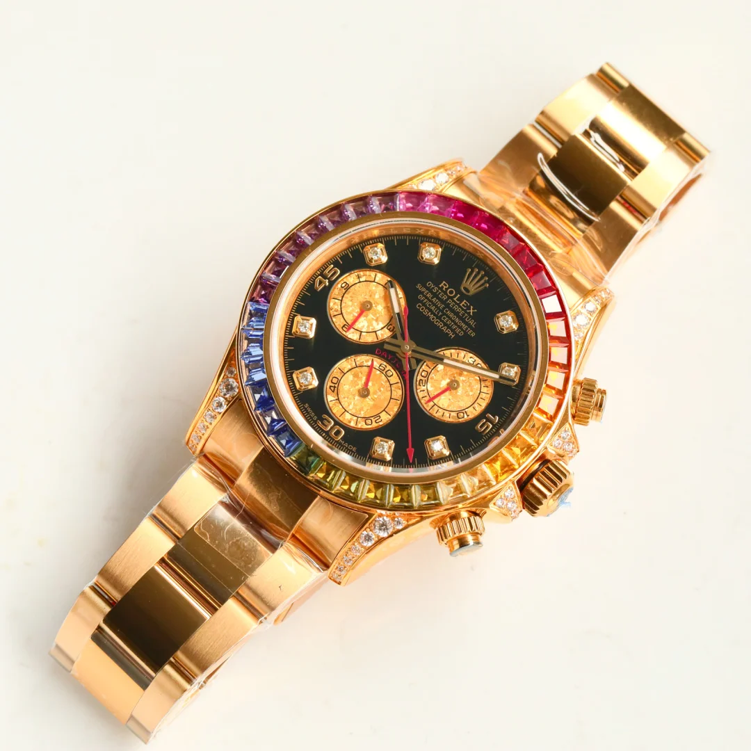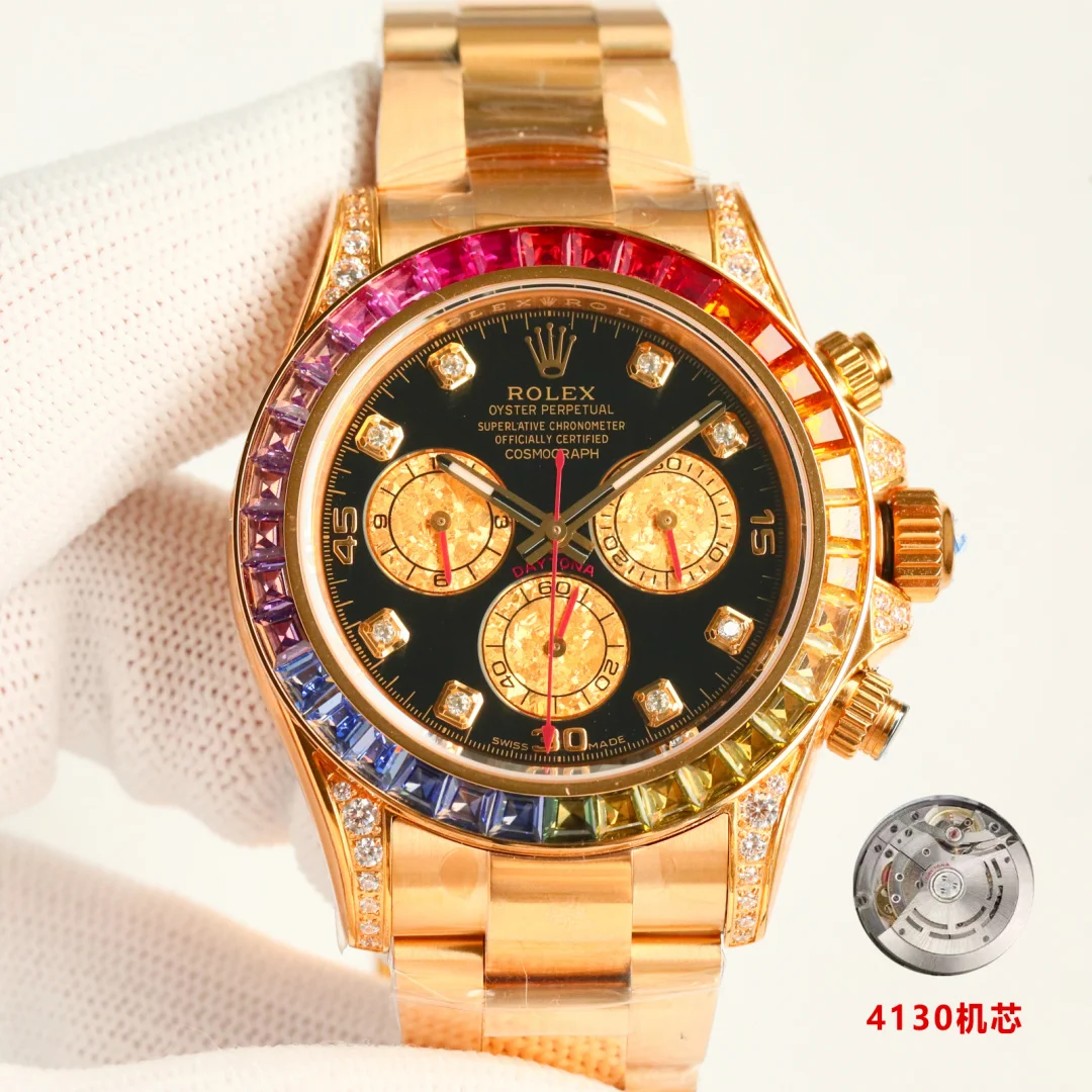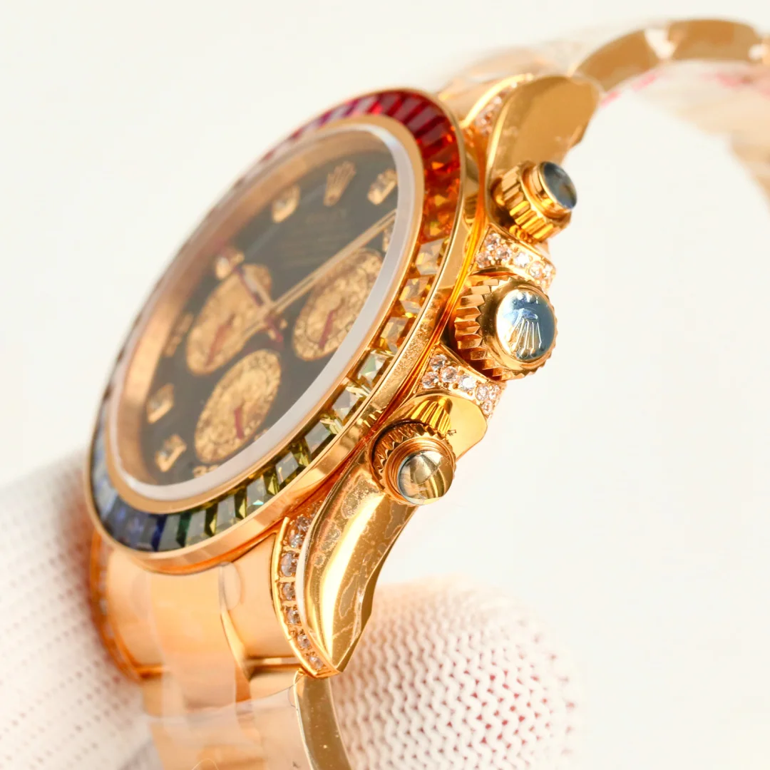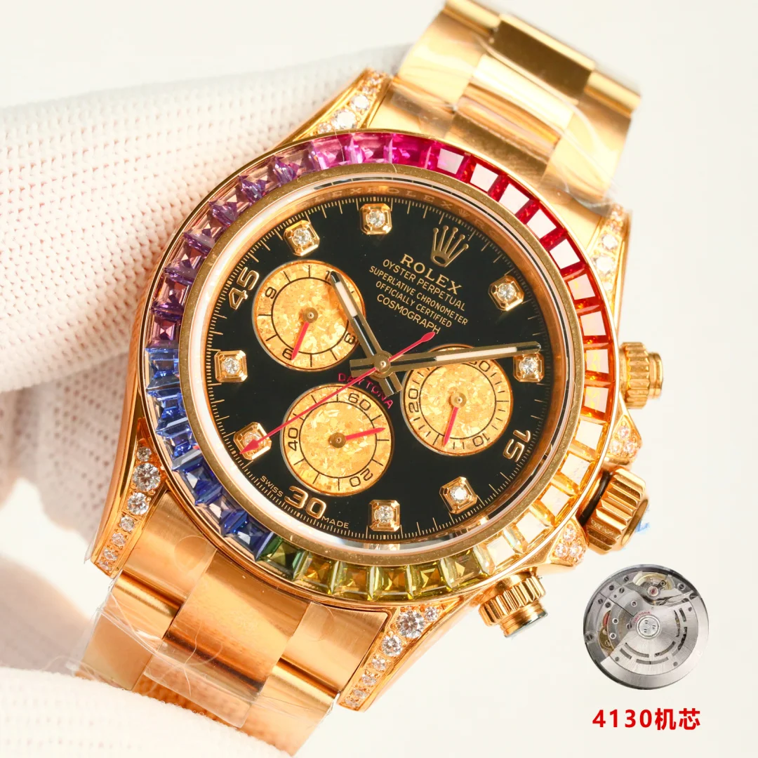 白钢和黄金劳力士 ROLEX 迪通拿系列 最新力作 升级真闪耀铂金小眼 彩虹迪- 厚度12.18mm 非市场假贝壳眼 真铂金眼灯光下效果更佳闪耀 搭载一体4130机械计时机芯 真储能达到72小时 外圈镶嵌彩虹渐变色蓝宝石 代替了经典的测速外圈 表耳及表冠护肩镶嵌56颗圆形切割钻石每一道工序精制 表扣细节处理完美无瑕 精致奢华全面升级
