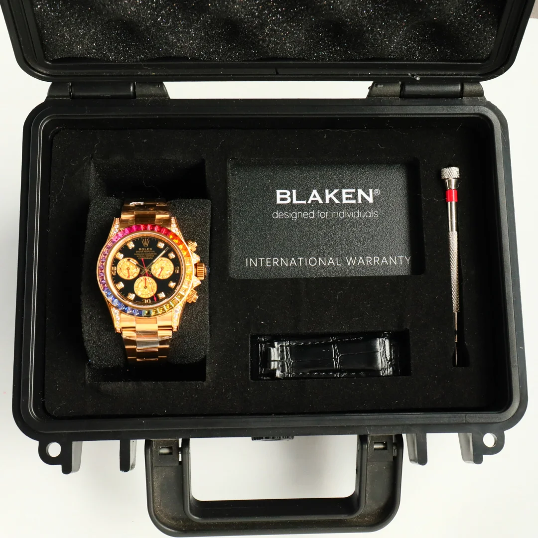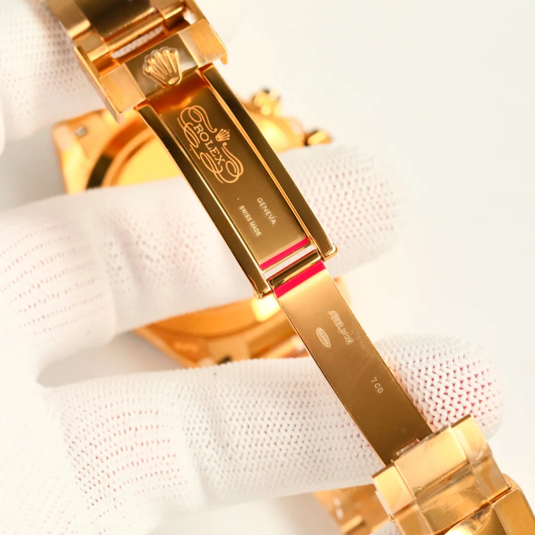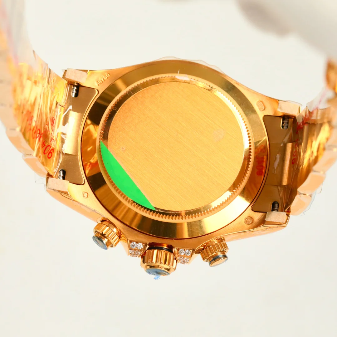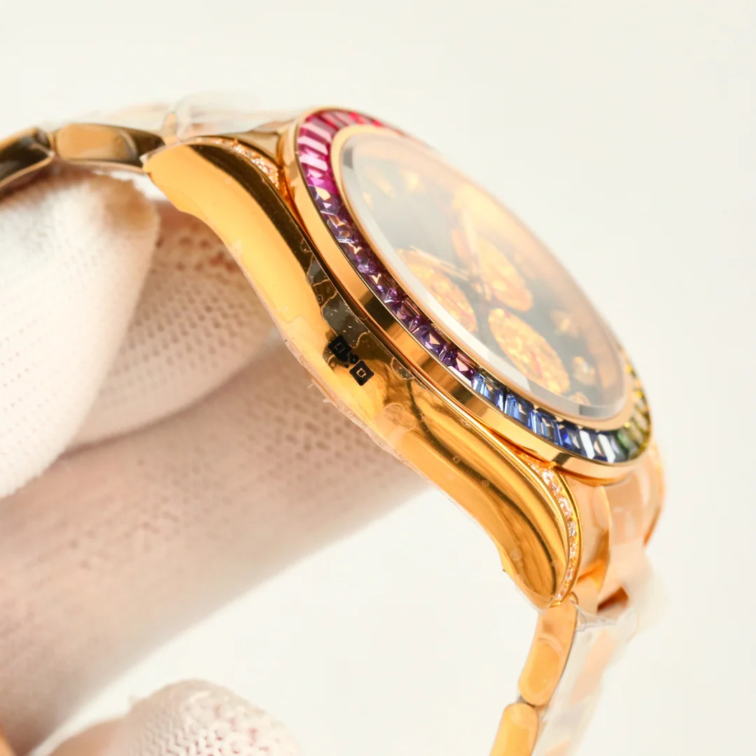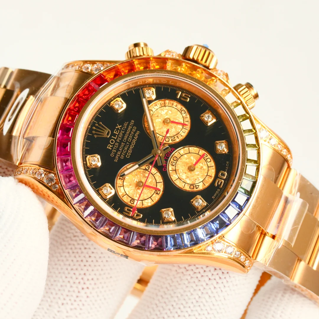 白钢和黄金劳力士 ROLEX 迪通拿系列 最新力作 升级真闪耀铂金小眼 彩虹迪- 厚度12.18mm 非市场假贝壳眼 真铂金眼灯光下效果更佳闪耀 搭载一体4130机械计时机芯 真储能达到72小时 外圈镶嵌彩虹渐变色蓝宝石 代替了经典的测速外圈 表耳及表冠护肩镶嵌56颗圆形切割钻石每一道工序精制 表扣细节处理完美无瑕 精致奢华全面升级
