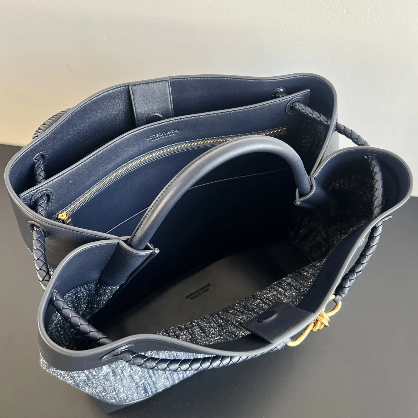 BV新品 Andiamo丹尼牛仔布786194 毛圈牛仔布拼接 非常高级 在人群中一定是最特别的包包 搭配编织肩带和标志性的扭结金扣 随性又显贵气 巨能装 通勤装备全搞定肩带可灵动切换 百搭百变随心所欲 毫不费力松弛时髦感 牛仔控必入尺寸 42x35x18