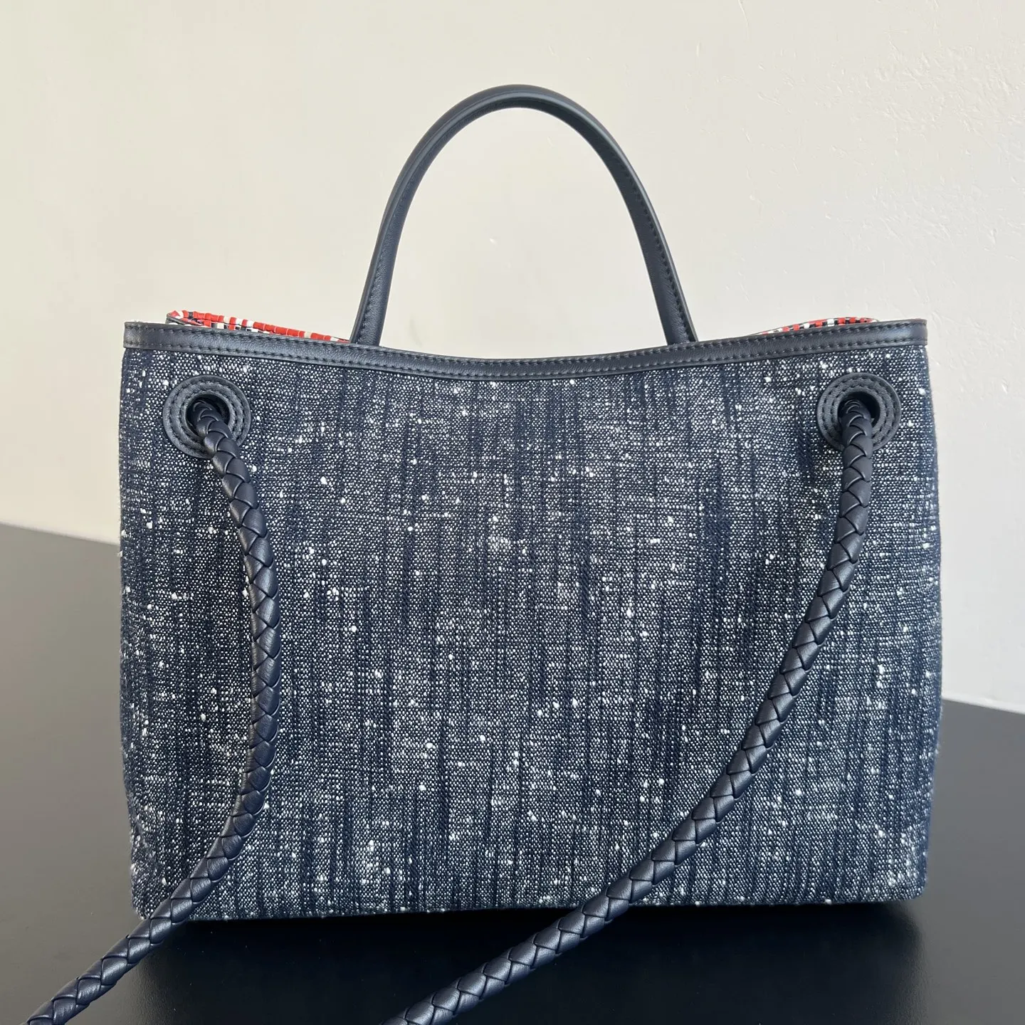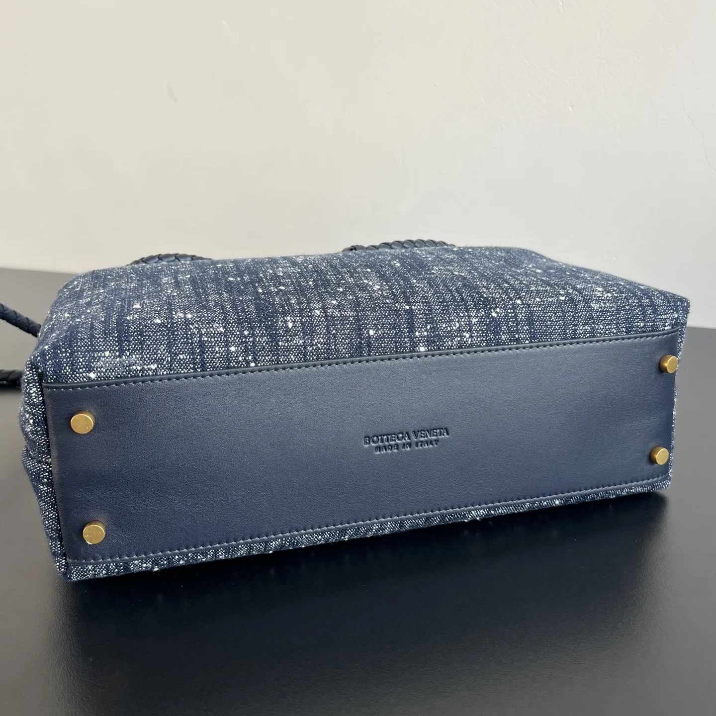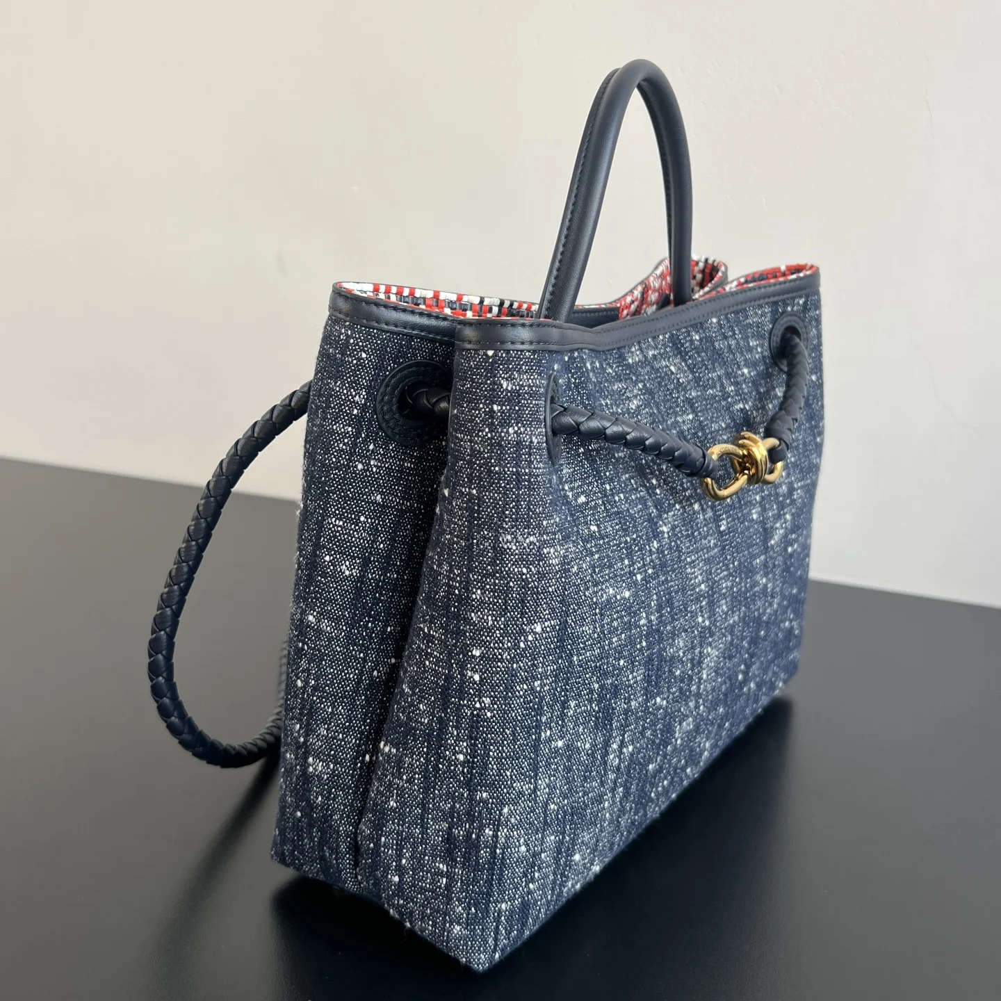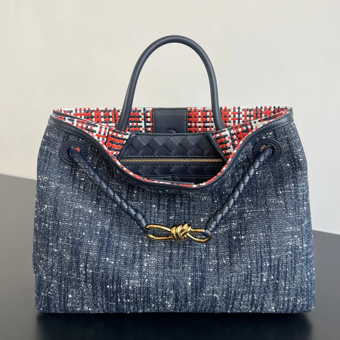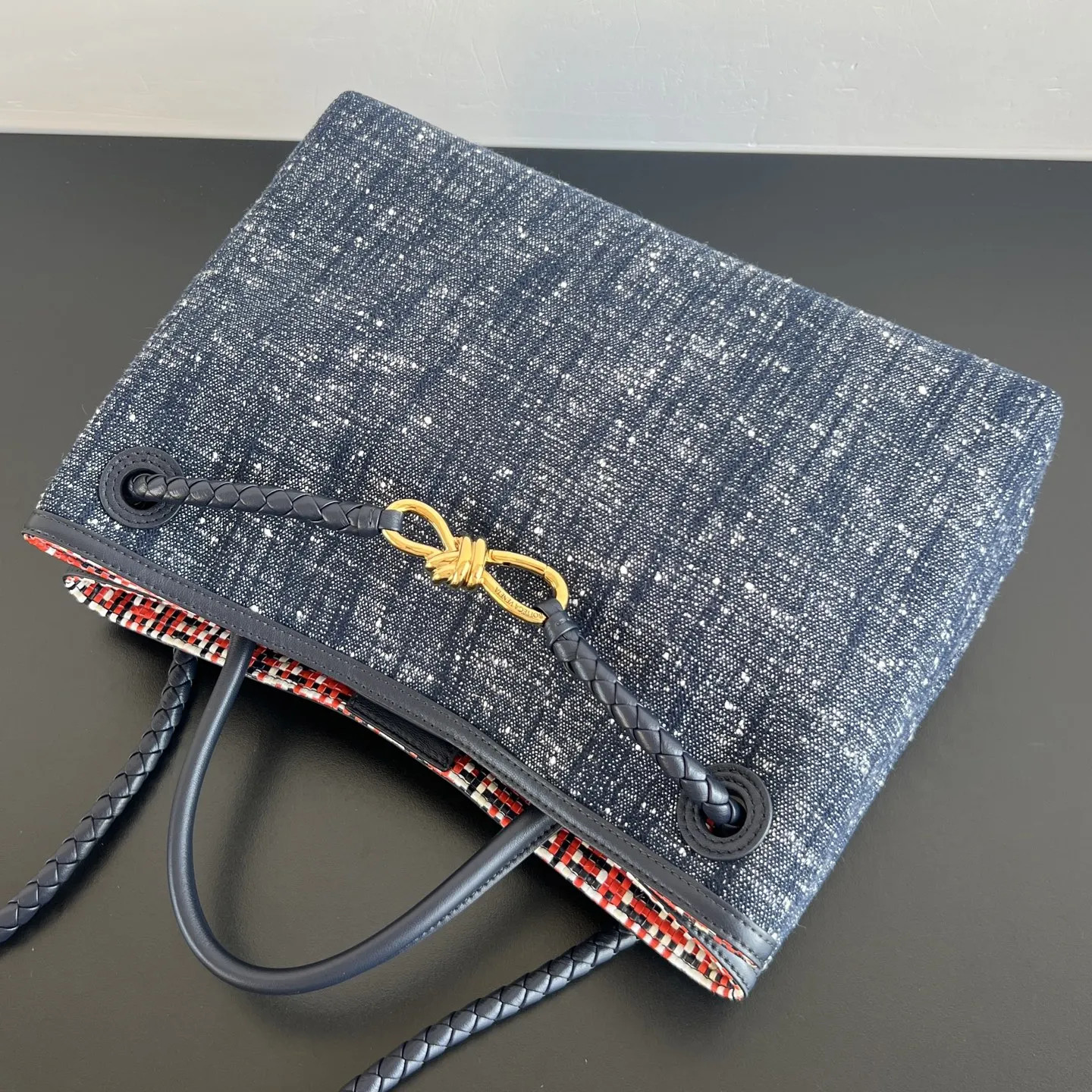 BV新品 Andiamo丹尼牛仔布836381 毛圈牛仔布自带复古做旧感 搭配编织皮肩带和标志性的扭结金扣 随性又不失精致度包口的维希格纹内衬是点睛小细节 颜色俏皮时髦 空间充足 容量王者实锤 同轴编织肩带任意切换背法 百搭百变随心所欲 毫不费力松弛时髦感 牛仔控必入 尺寸 35x25x11