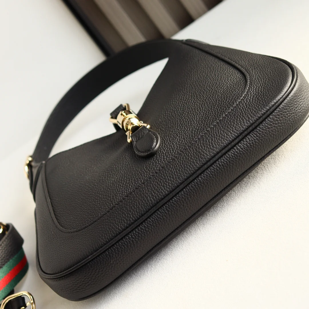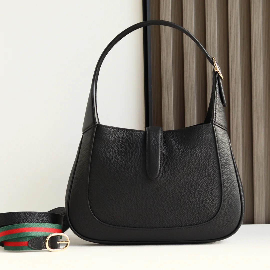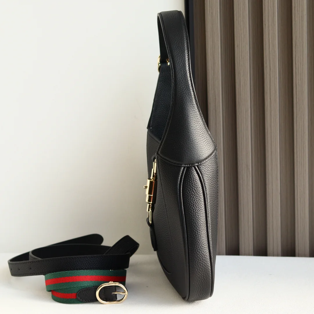 2024秋冬系列焕新演绎Gucci Jackie 1961系列肩背包 采用精细古驰安可拉红(Rosso Ancora)皮革制作 搭配全新浅金色调推入式锁扣开合 彰显品牌经典手袋的精湛工艺 新月造型和流畅廓形这款小号肩背包搭配皮革肩带 另附红绿织带肩带 成就多样穿搭选择
