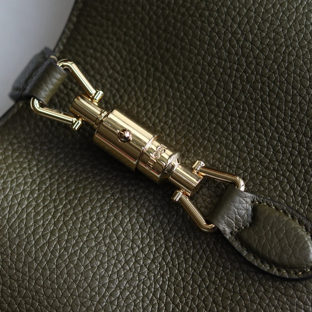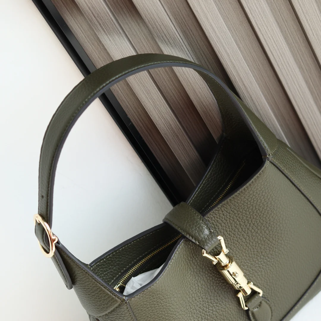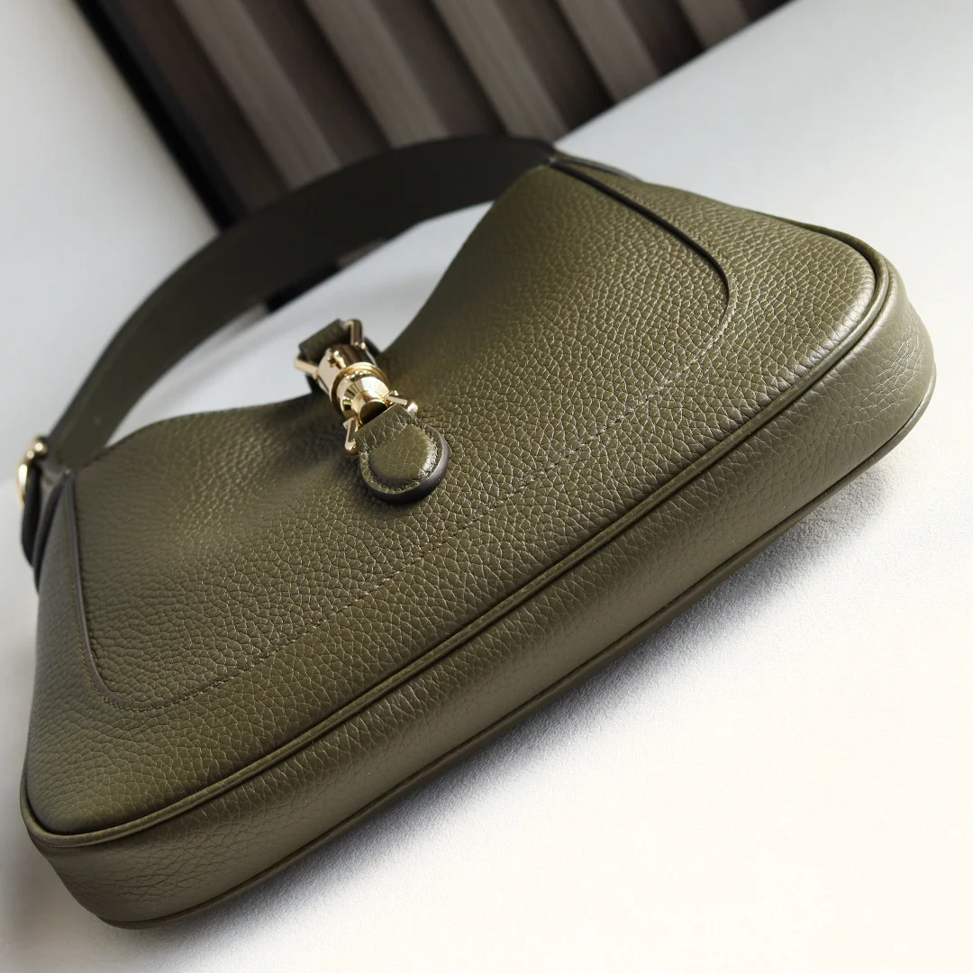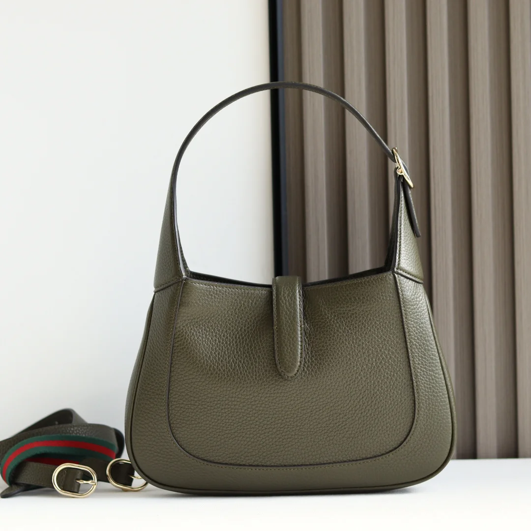 2024秋冬系列焕新演绎Gucci Jackie 1961系列肩背包 采用精细古驰安可拉红(Rosso Ancora)皮革制作 搭配全新浅金色调推入式锁扣开合 彰显品牌经典手袋的精湛工艺 新月造型和流畅廓形这款小号肩背包搭配皮革肩带 另附红绿织带肩带 成就多样穿搭选择