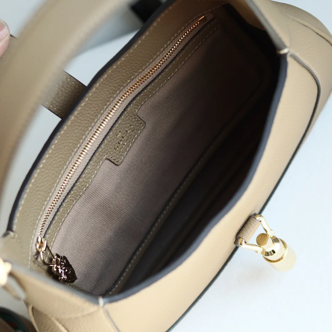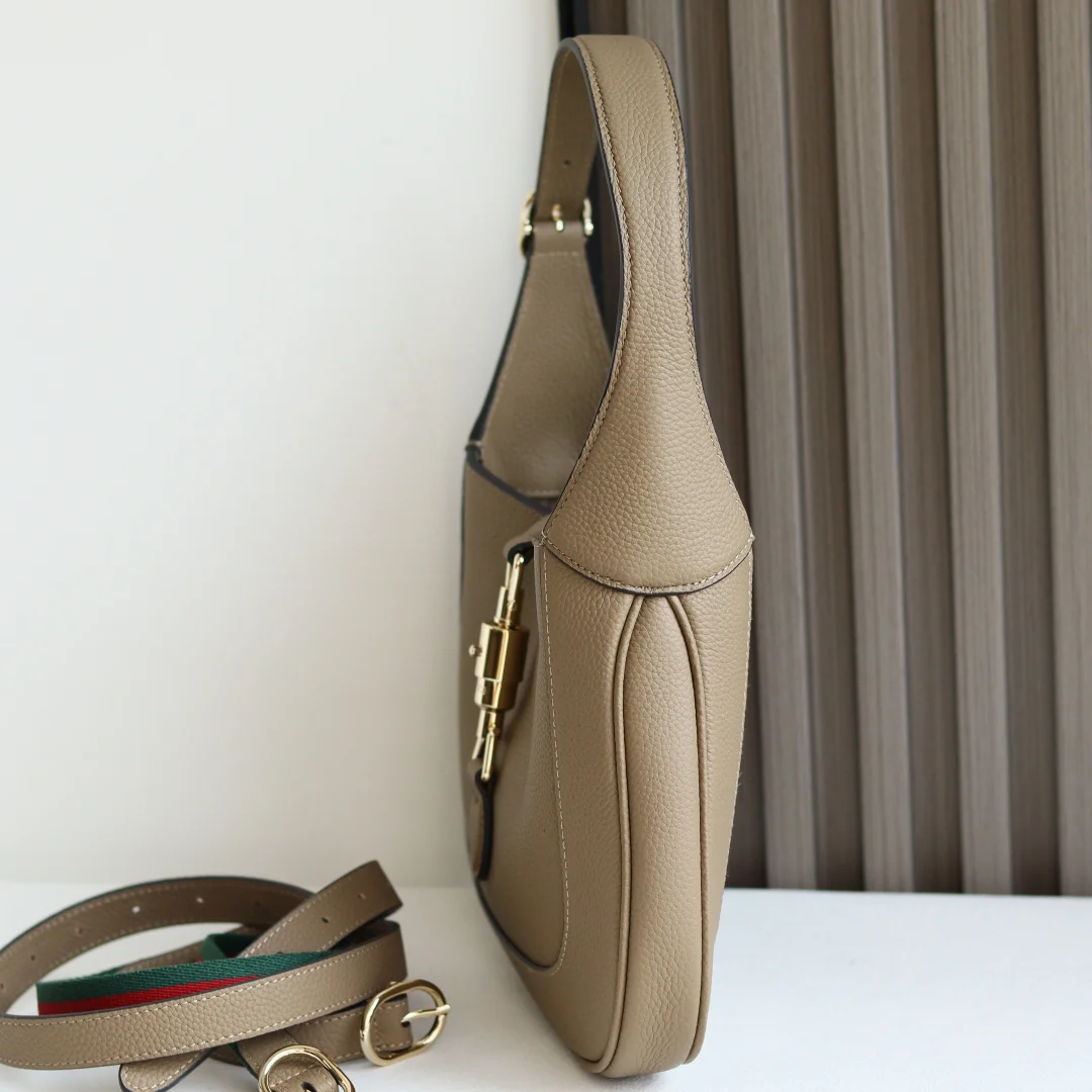 2024秋冬系列焕新演绎Gucci Jackie 1961系列肩背包 采用精细古驰安可拉红(Rosso Ancora)皮革制作 搭配全新浅金色调推入式锁扣开合 彰显品牌经典手袋的精湛工艺 新月造型和流畅廓形这款小号肩背包搭配皮革肩带 另附红绿织带肩带 成就多样穿搭选择