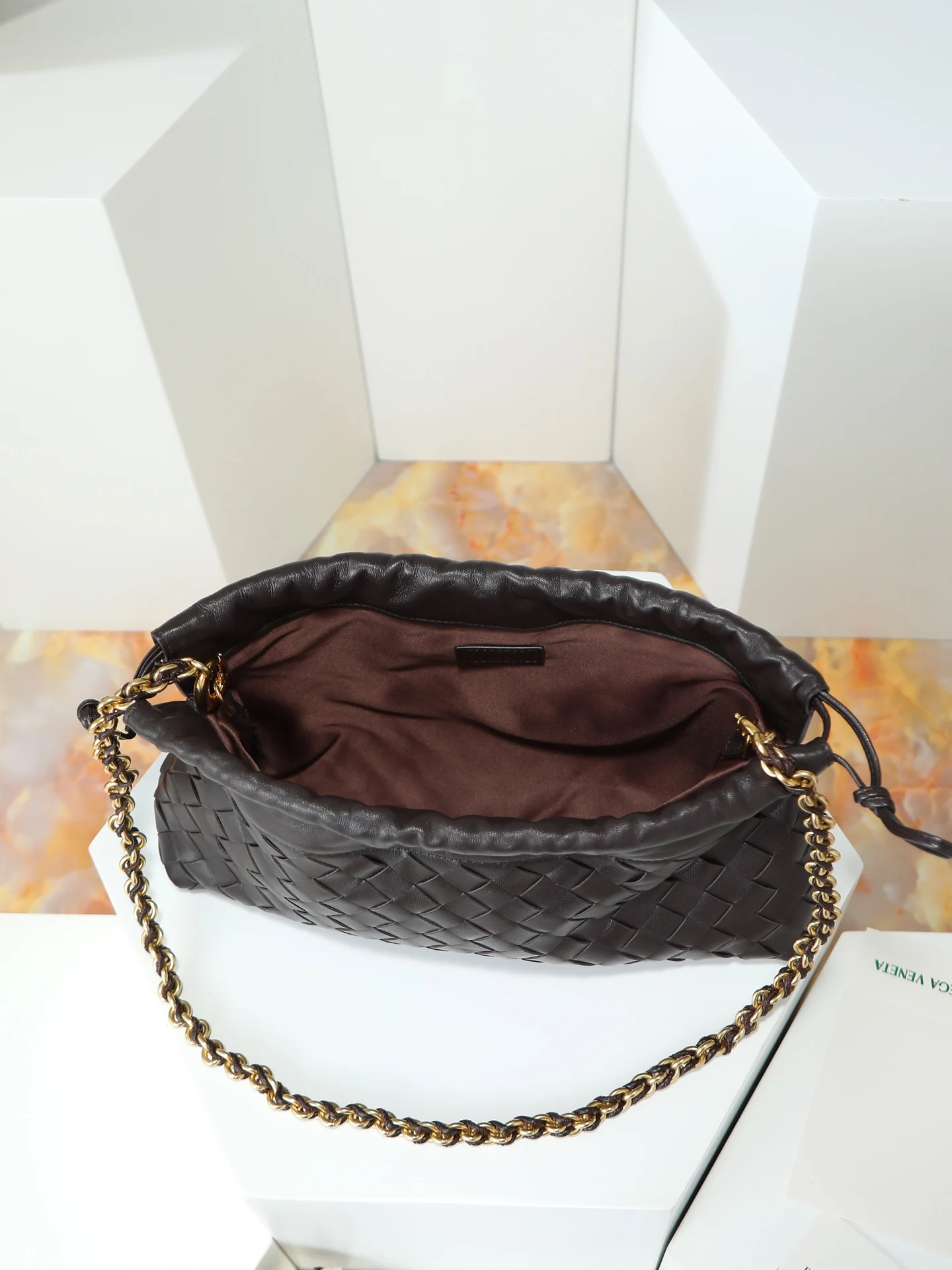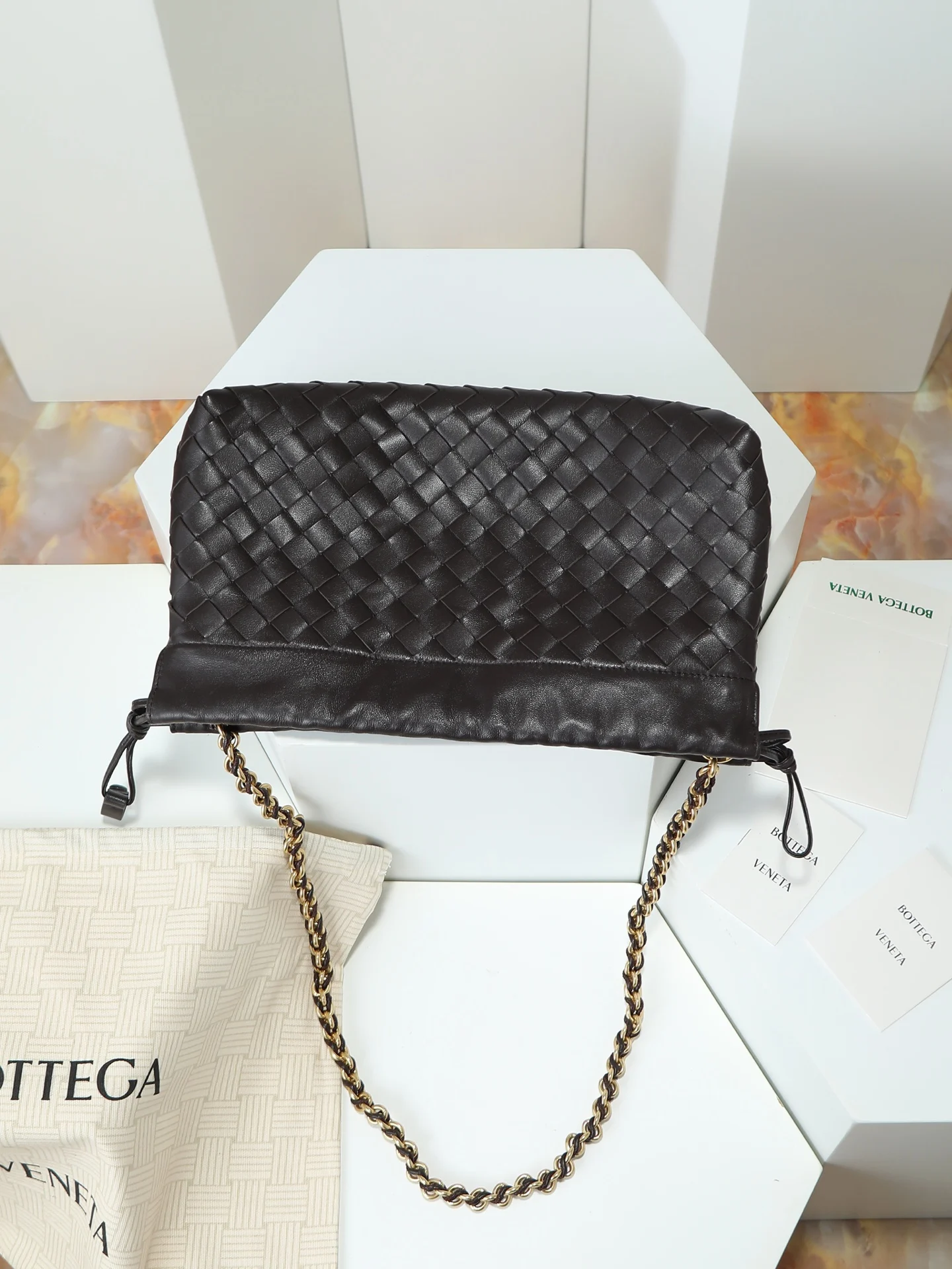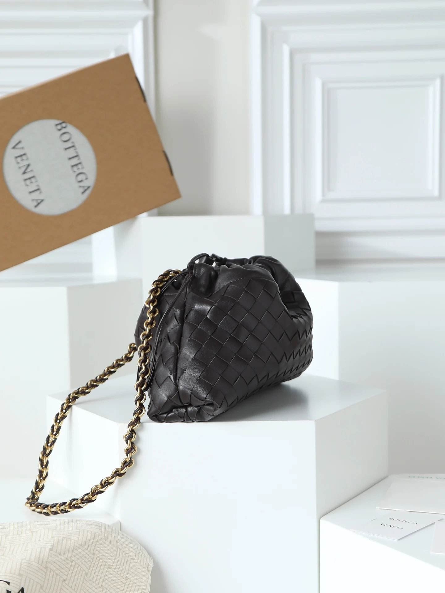 BOTTEGA VENETA 2025新品女士Dustbag Notte手拿包 一经上市就很受欢迎的Dustbag出了链条款 手拿式背法让人回忆起经典包型Pouch 轻盈优雅 保留的抽绳设计可以让作为去使用 链条较长一些 很适合喜欢解放双手斜挎背的姐妹们 不论是哪种背法 都可以依据场合和当日的心情更换背法可以让整体穿搭更添时尚感 在包身上也做了加宽 正逢梅雨季节 天气炎热 内可以轻松容纳小型雨伞和水杯 内里是尼龙材质 背起来轻巧舒适 非常适合夏季使用