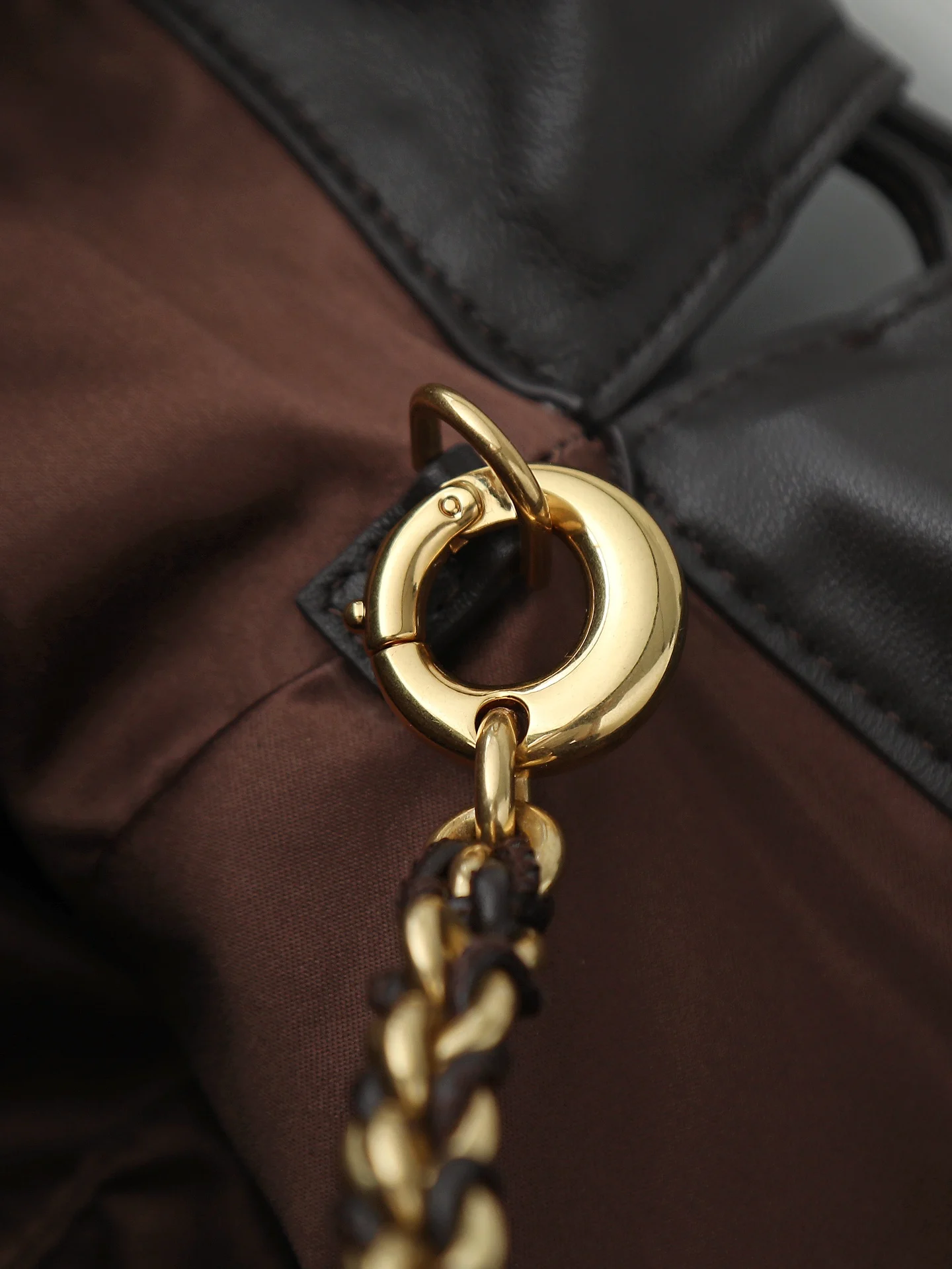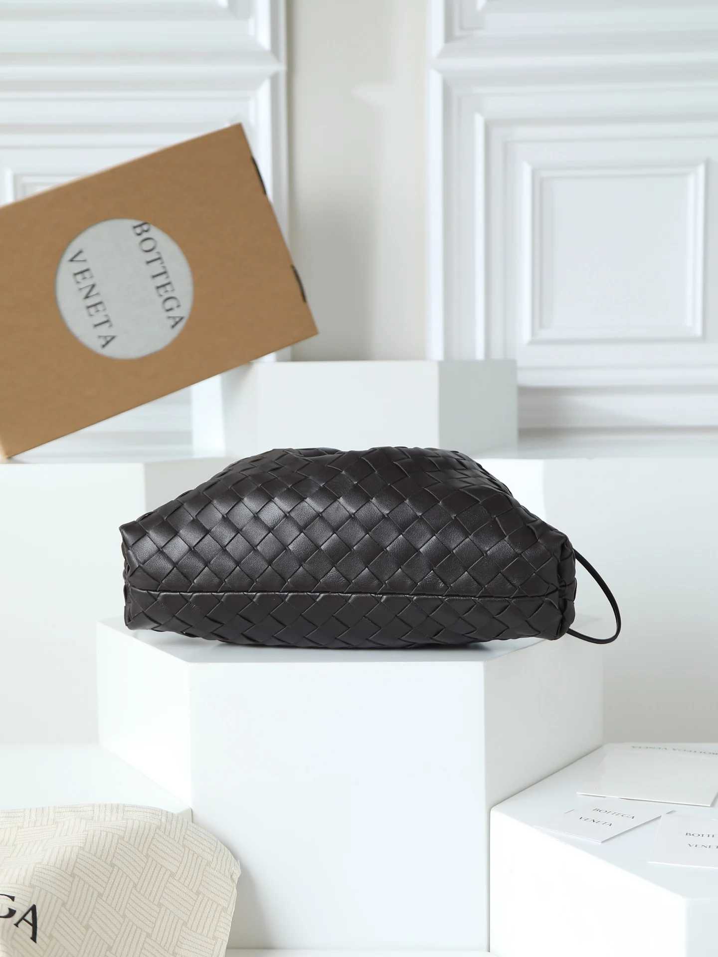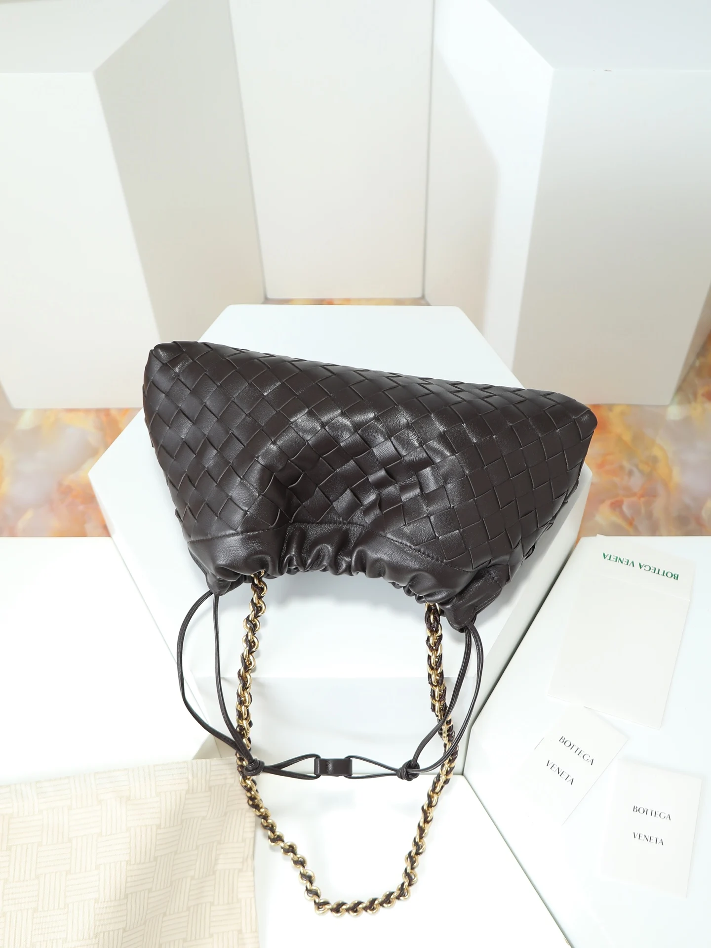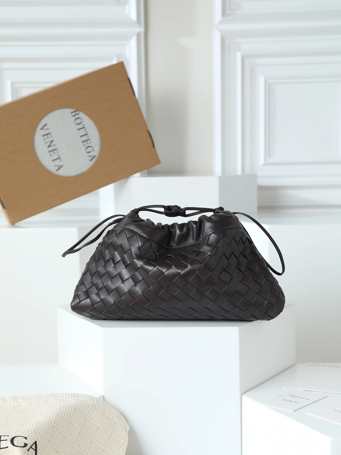 BOTTEGA VENETA 2025新品女士Dustbag Notte手拿包 一经上市就很受欢迎的Dustbag出了链条款 手拿式背法让人回忆起经典包型Pouch 轻盈优雅 保留的抽绳设计可以让作为去使用 链条较长一些 很适合喜欢解放双手斜挎背的姐妹们 不论是哪种背法 都可以依据场合和当日的心情更换背法可以让整体穿搭更添时尚感 在包身上也做了加宽 正逢梅雨季节 天气炎热 内可以轻松容纳小型雨伞和水杯 内里是尼龙材质 背起来轻巧舒适 非常适合夏季使用