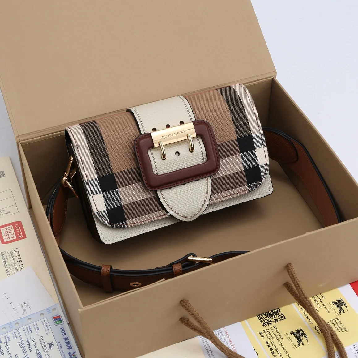 原单 B家THE BUCKLE - HOUSE 格纹拼皮革搭扣包,本款单品为小号款式 可以存放零 卡片 手机和美妆用品 适合日常使用 随附两条肩背带 可用作斜背包 肩背包或手拿包 编号 89013 尺寸:19.5 -12 -5cm 85483050