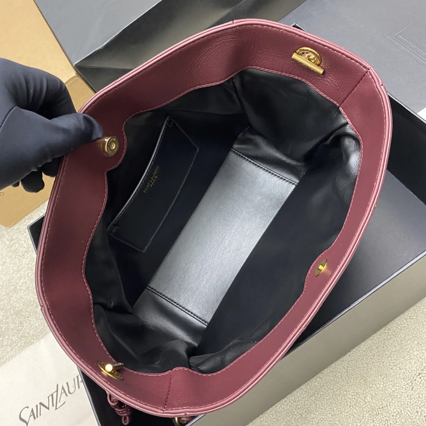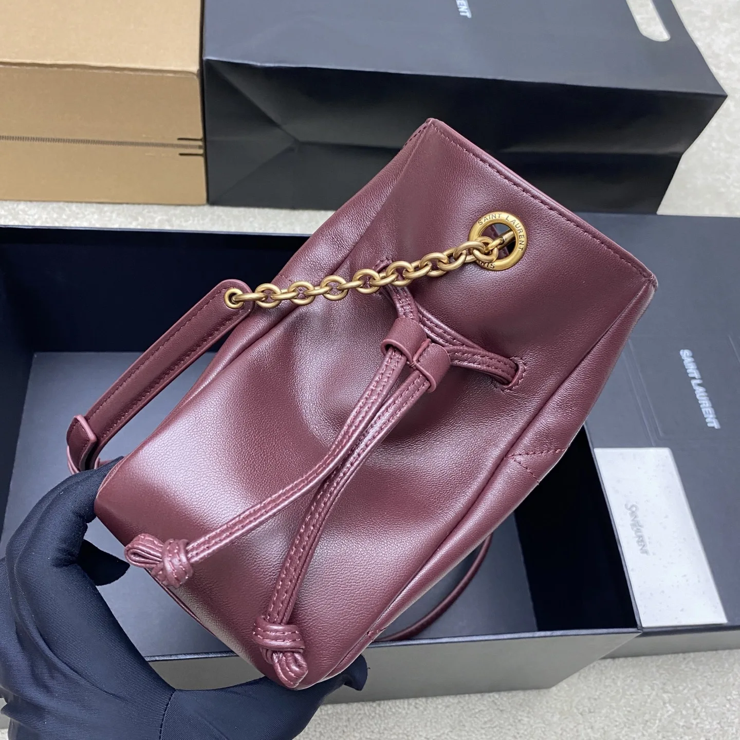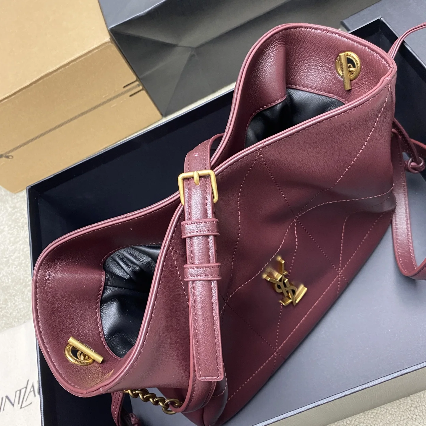枣红羊皮/古金YSL 最新斜跨福袋小号出货了 福袋新尺寸好可爱 一起来种草吧 小巧可爱容量也是很OK哦 而且还很优雅 是有设计在线 且贵气满满的实用型tote 我觉得比22bag好看耶 这是可以说的吗