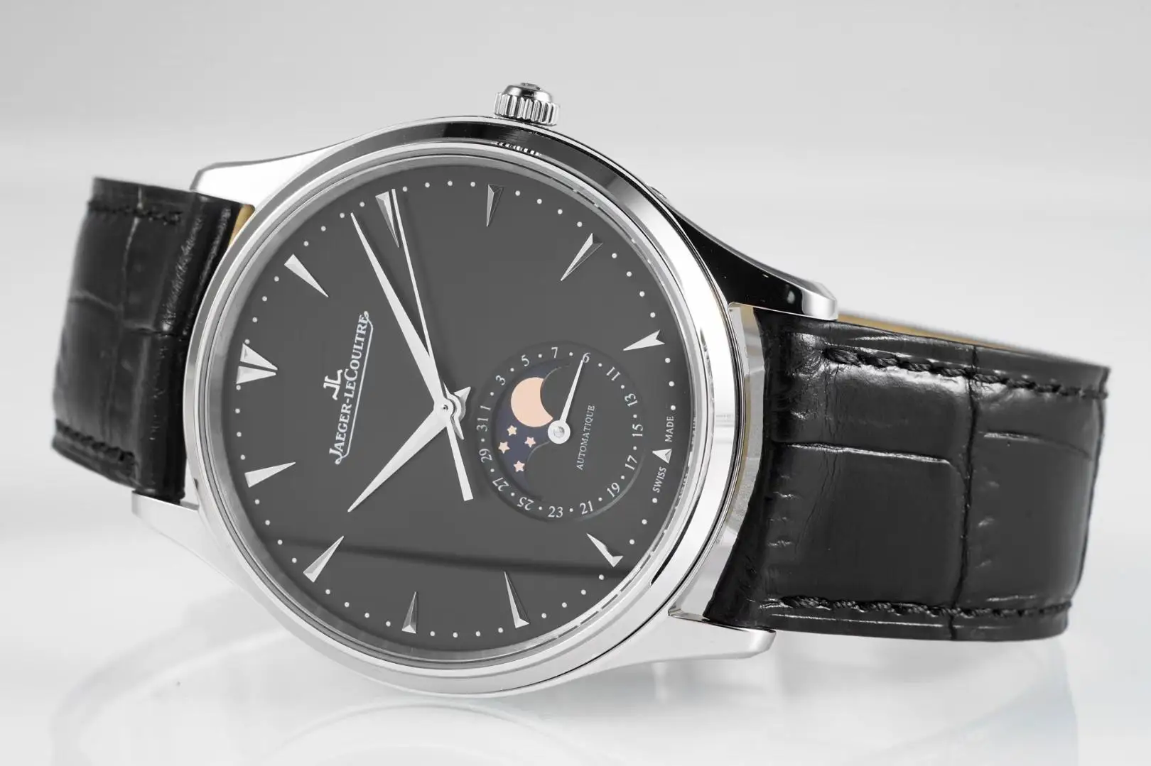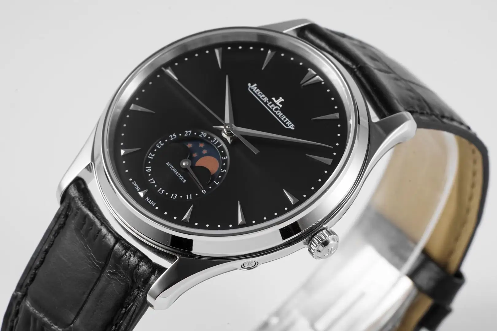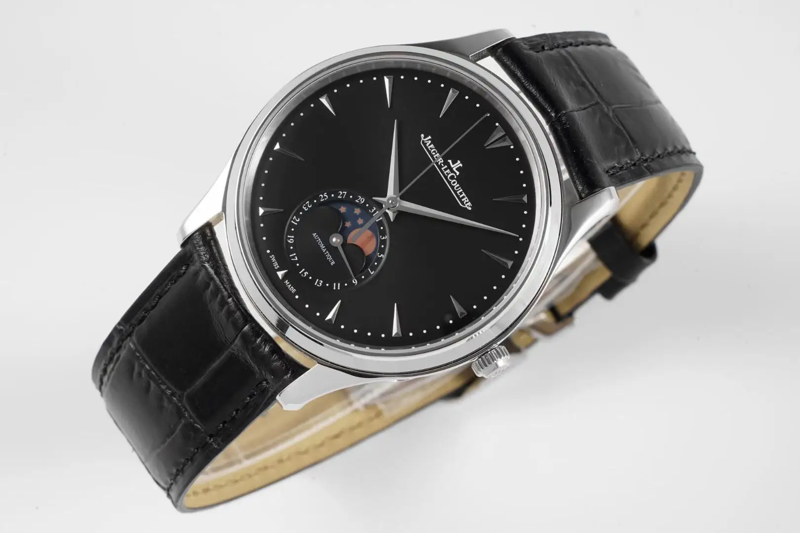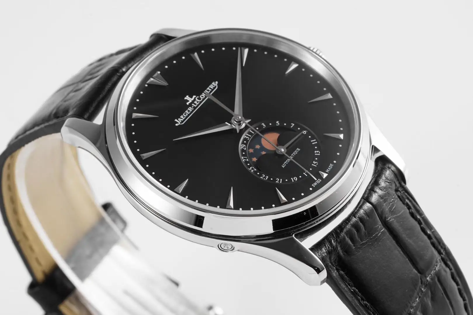 精品 积家月相大师系列 表壳直径39mmX9.9mm与原装同步 六点钟的子盘拥有阳历阴历 月相 双期显示 月相一月转一圈 功能和正品一致 技术突破 采用9015改积家自产Cal.925/1机芯 功能百分百同步原装自产机芯 走时稳定 表扣升级 加量不加价