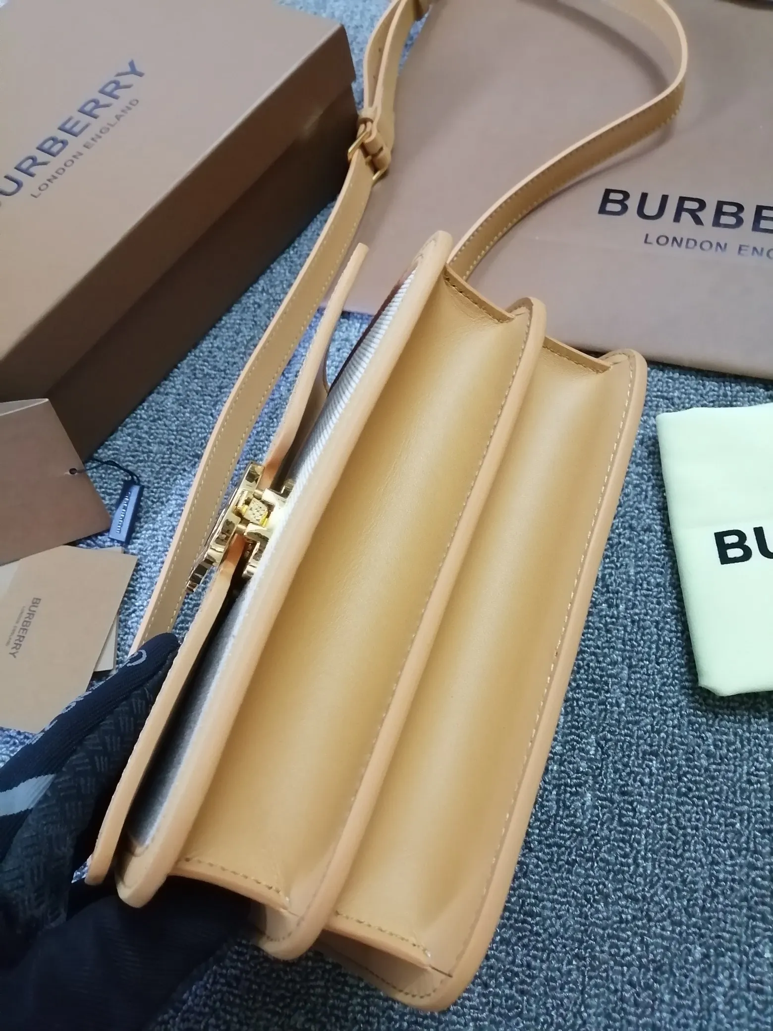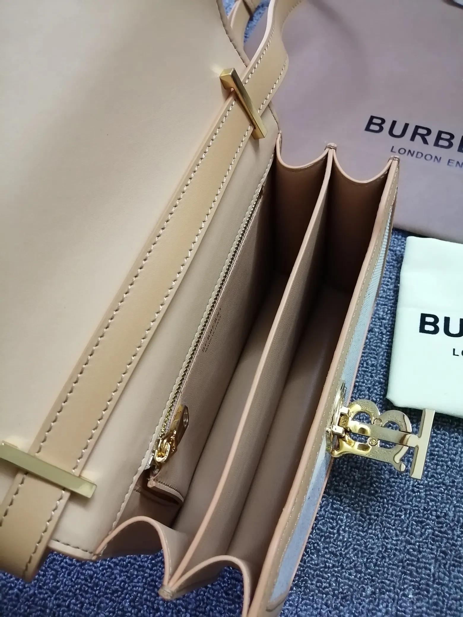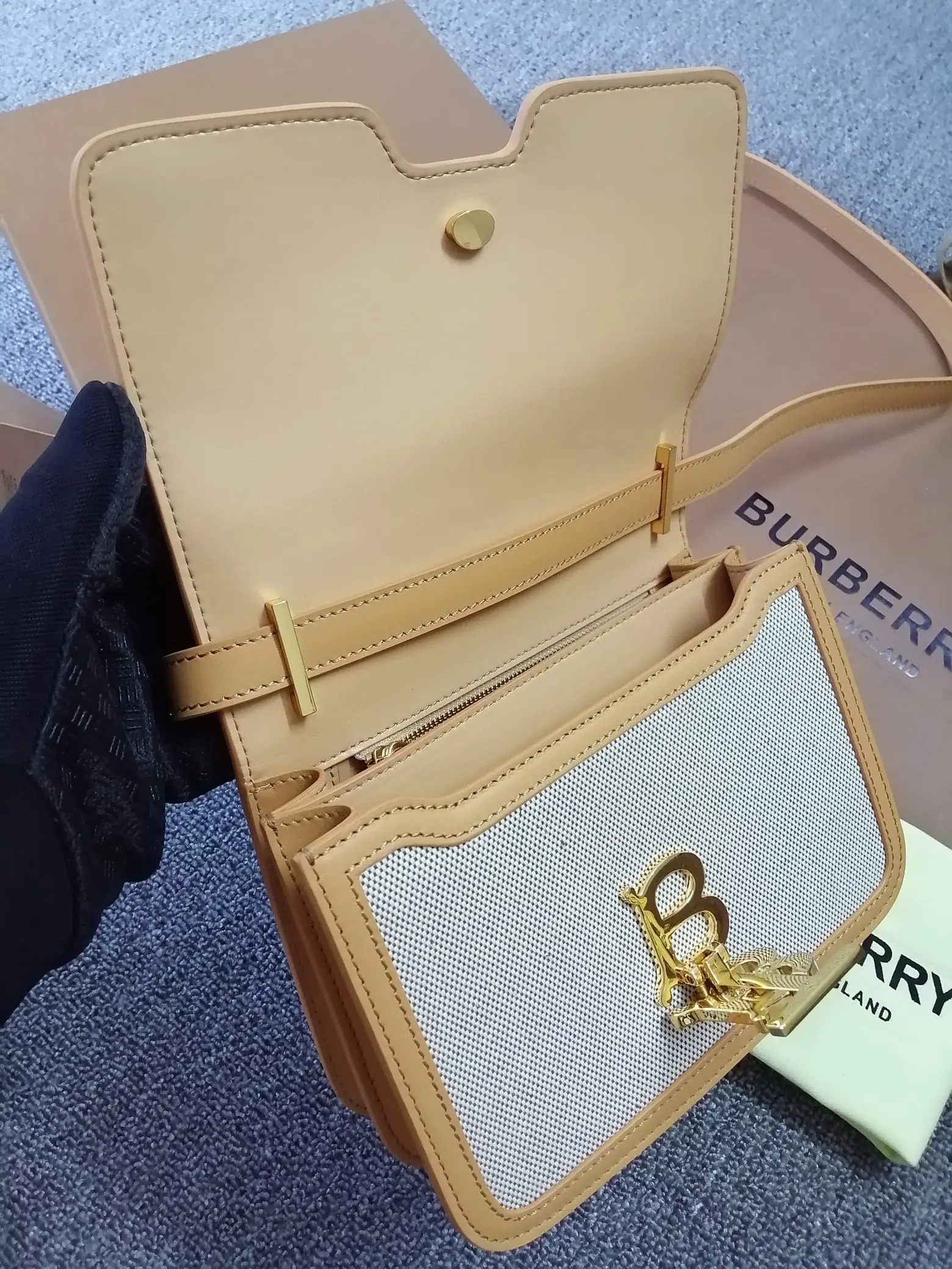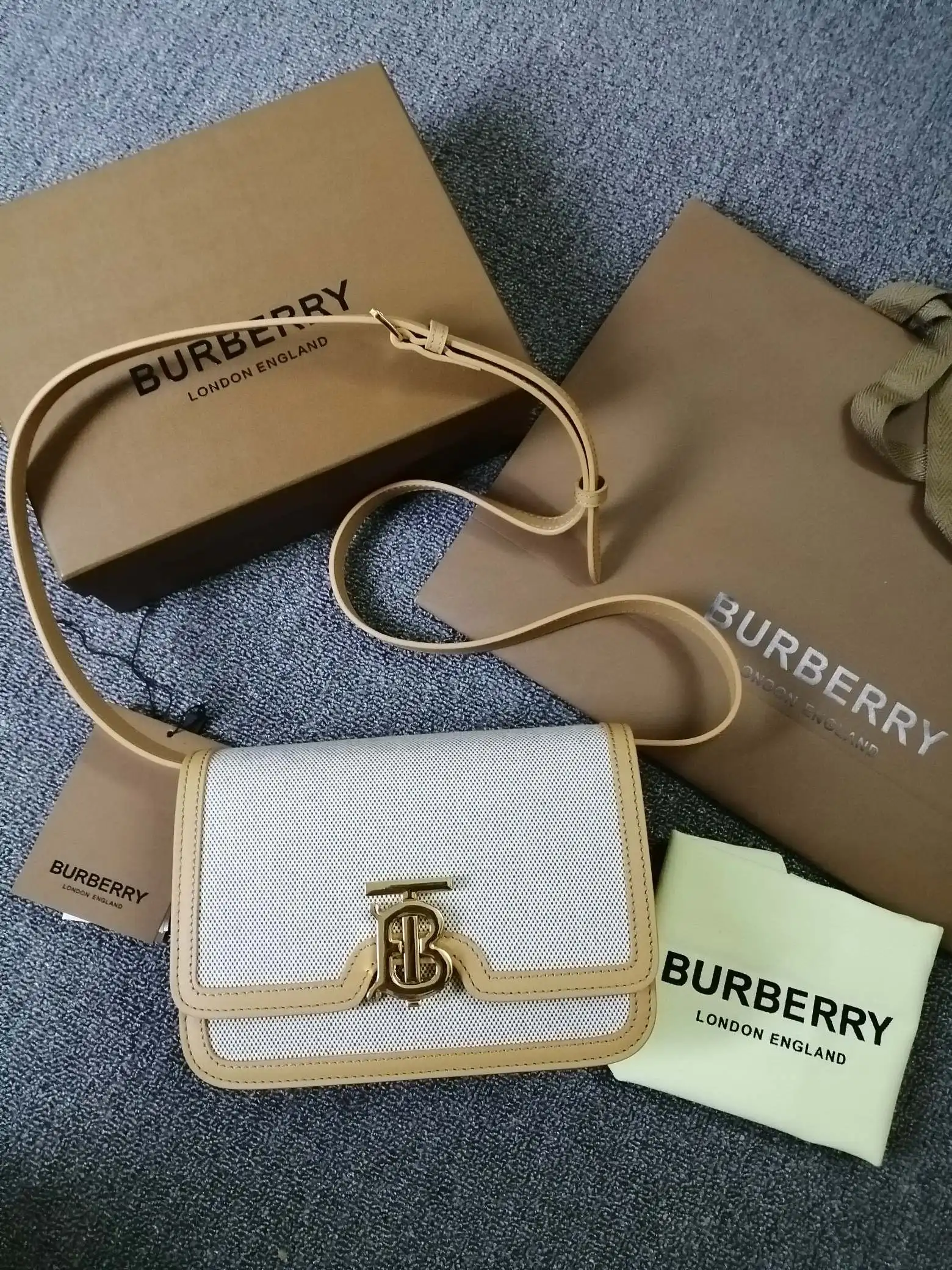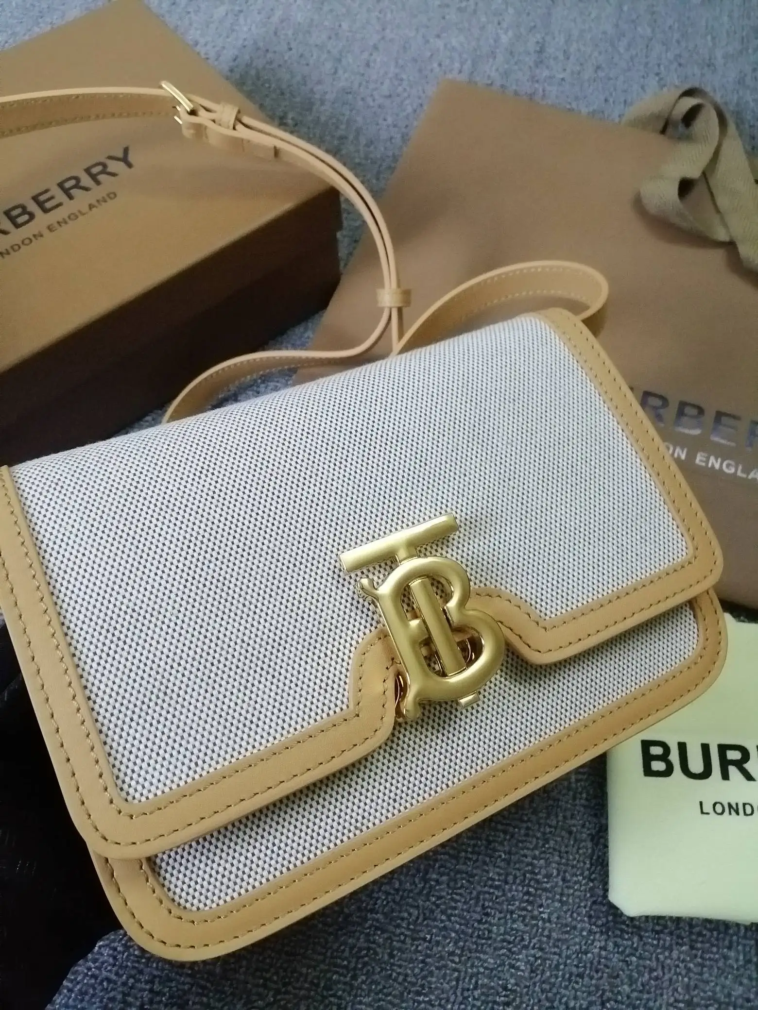 B家TB小号双色帆布皮革锁扣包 版型立挺的单肩包 锁扣装饰 Thomas Bur 灵感专属标识 随心变换为斜背包或手拿包造型 编号 90235 尺寸:21 - 16 - 6cm