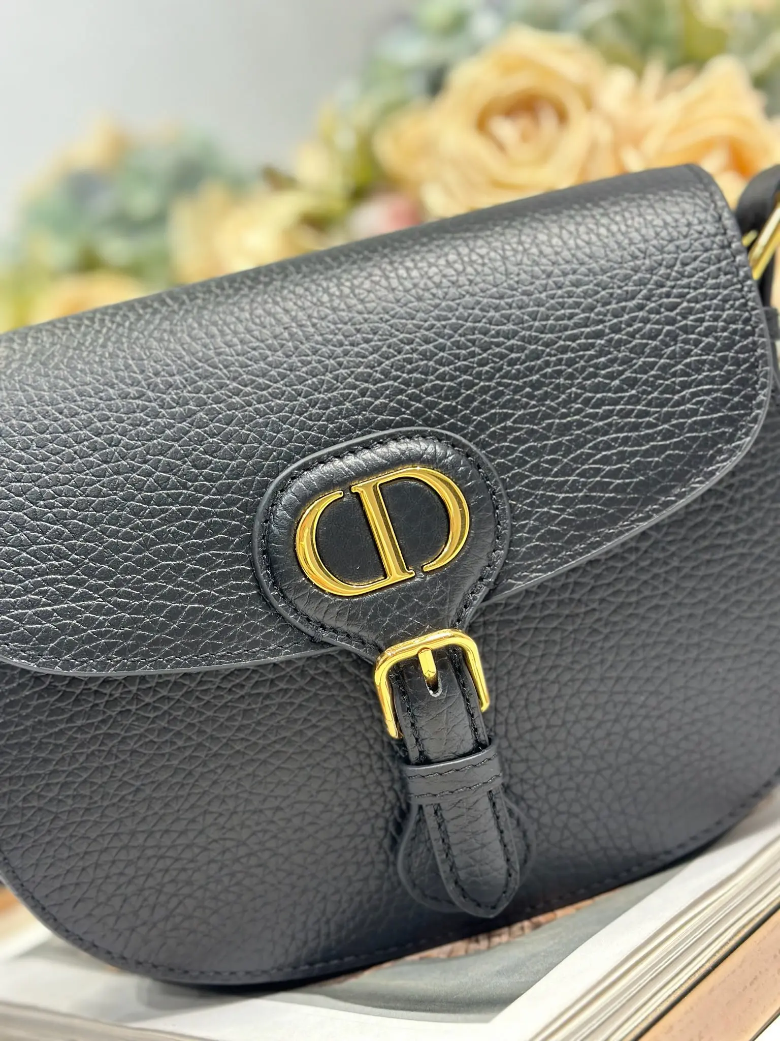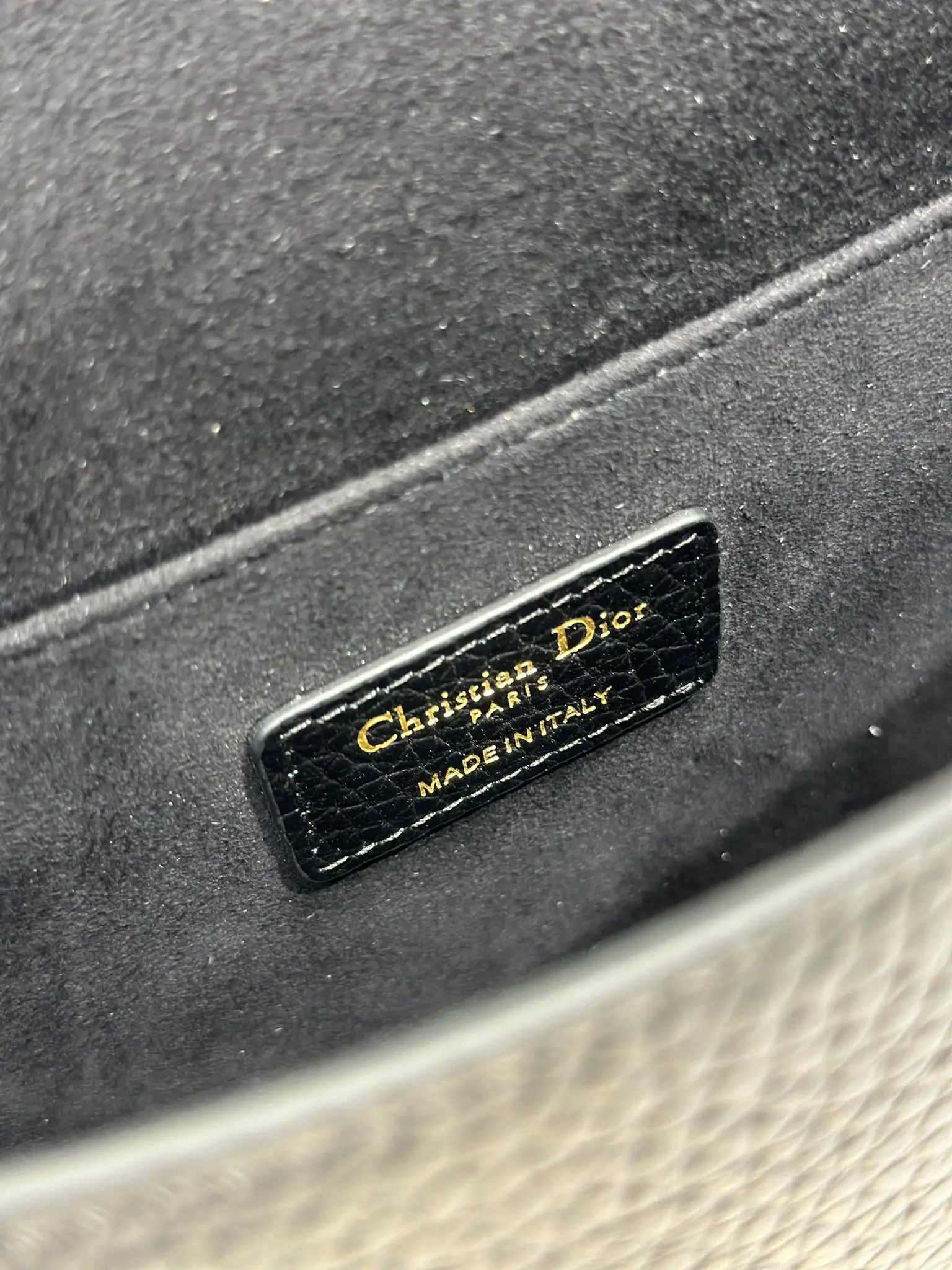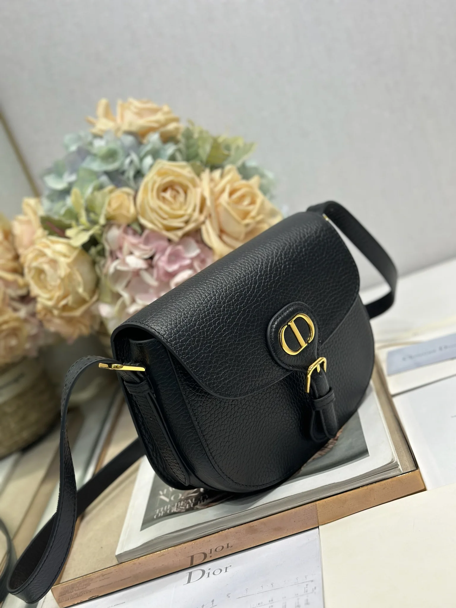 New Dior Bobby 中号手袋 黑色荔枝纹 这款 Dior Bobby 手袋早春系列新品 以高雅线条和匀称比例全新演绎水饺包廓形 彰显 Dior 风范 采用黑色粒面牛皮革精心制作 内部搭配绒面牛皮革 可拆卸 可调节的肩带搭配优雅的针扣调节 可手提 肩背或斜挎 型号 9337