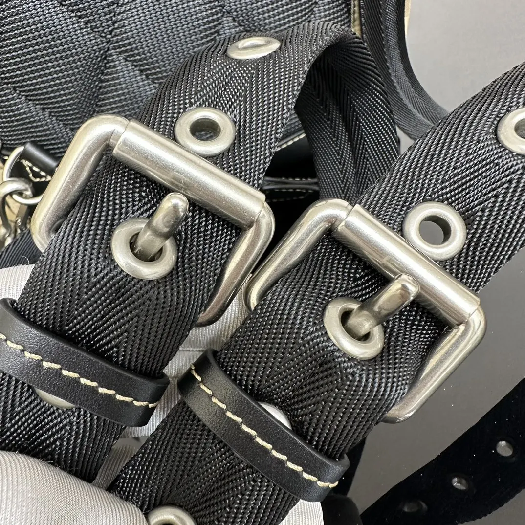 这是一款多用包 可双肩 斜挎 单跨 特别之处在肩带 两根粗的尼龙肩带中间金属扣链接起来 还可以调节超短 包包的背面上下左右四个角分别有个挂环 所以你可以随意挂在任意一个挂环上 肩带两头成对焦挂好后就是斜挎背法 尺寸16.26型号9701