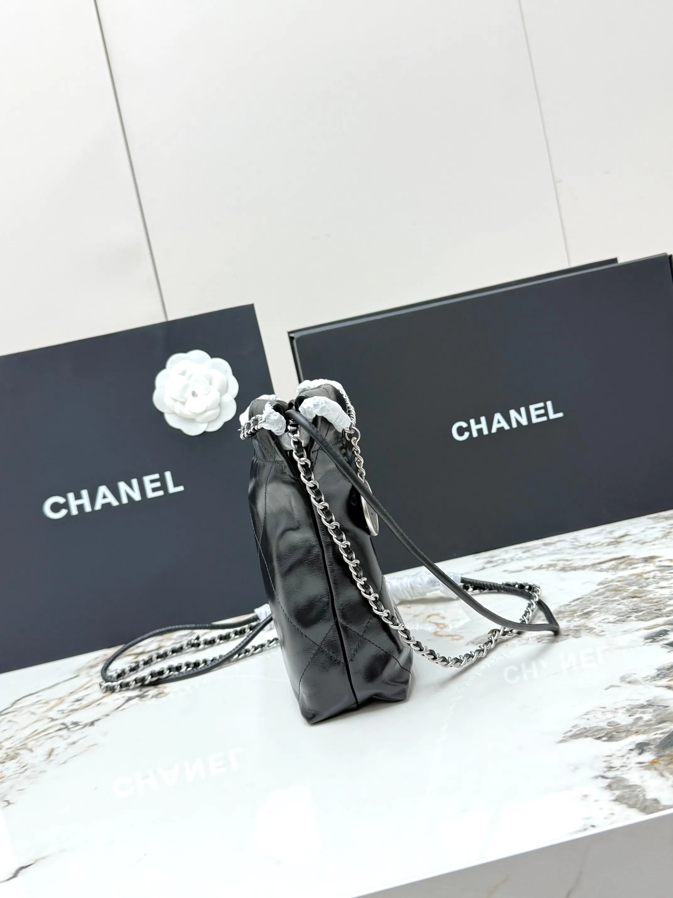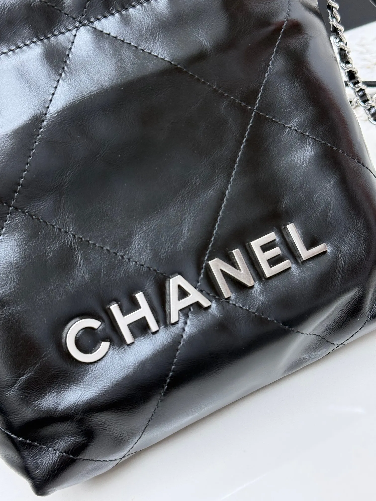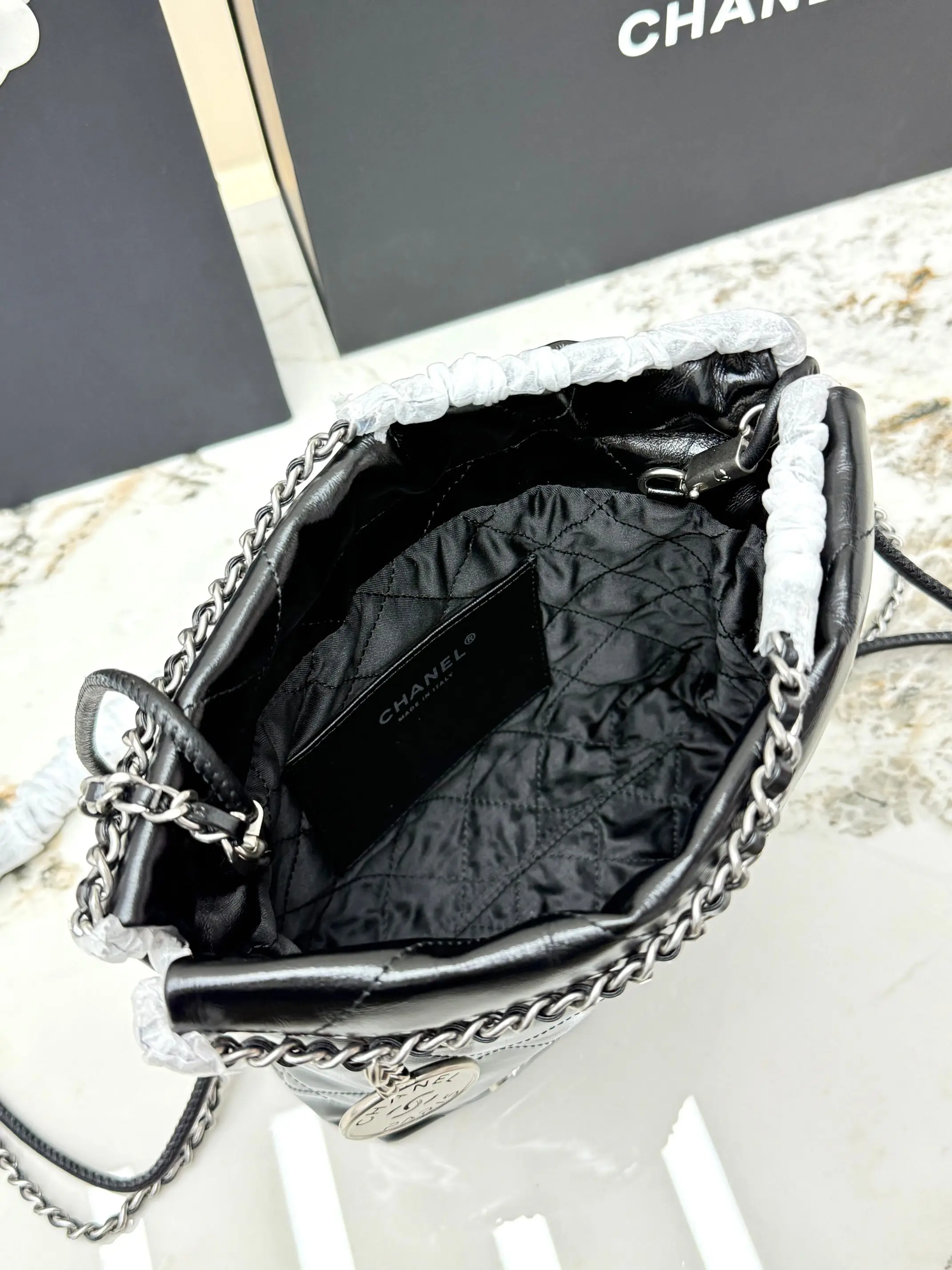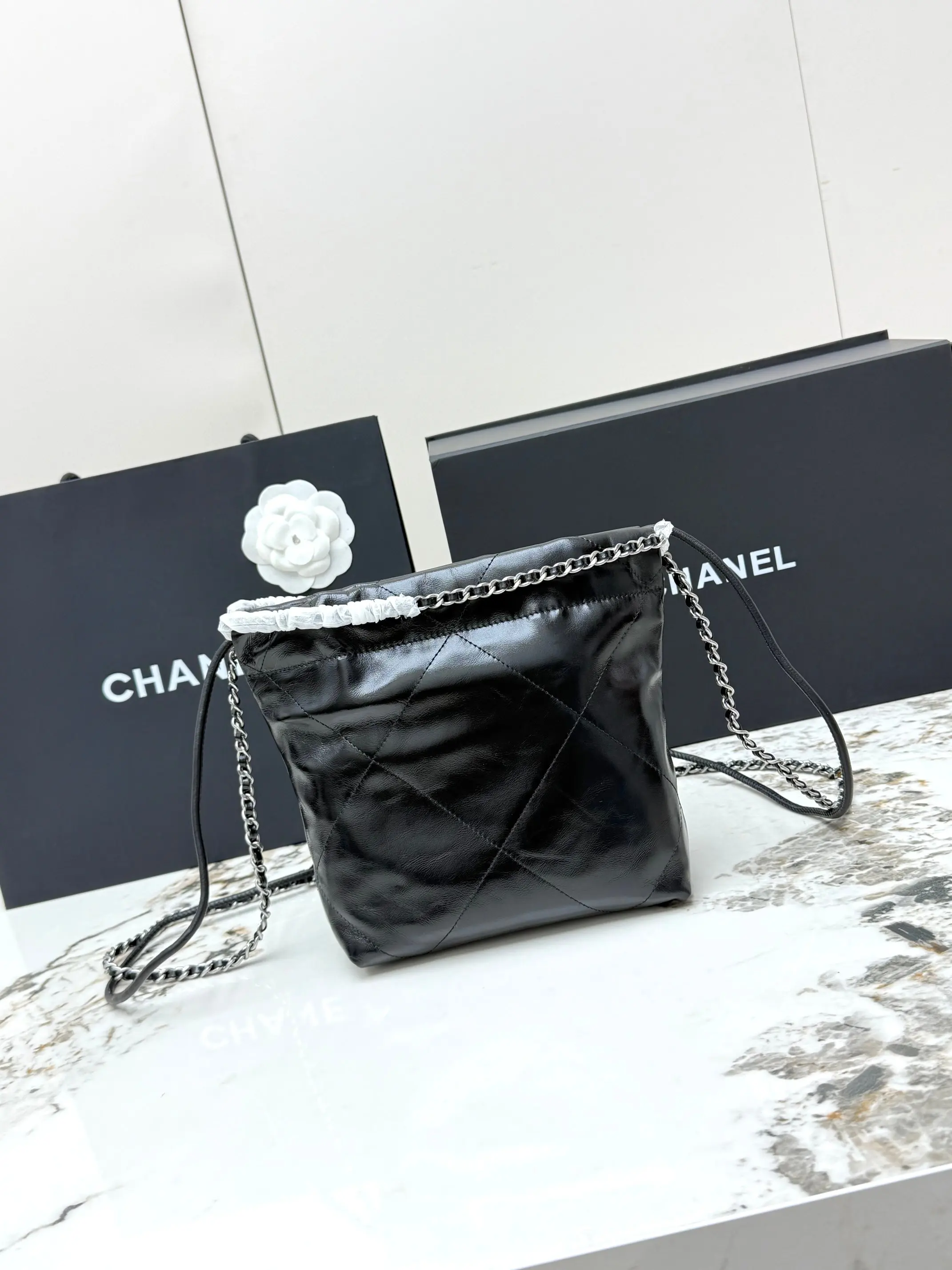 进口原厂皮 CHANEL 迷你垃圾袋 香奈儿顶级原单货23A 22bag水桶包mini春夏火爆经典永不过时的垃圾袋 银标菱形格纹抽绳开合链条亮面油蜡小牛皮可斜挎可单肩型号 AS3980
