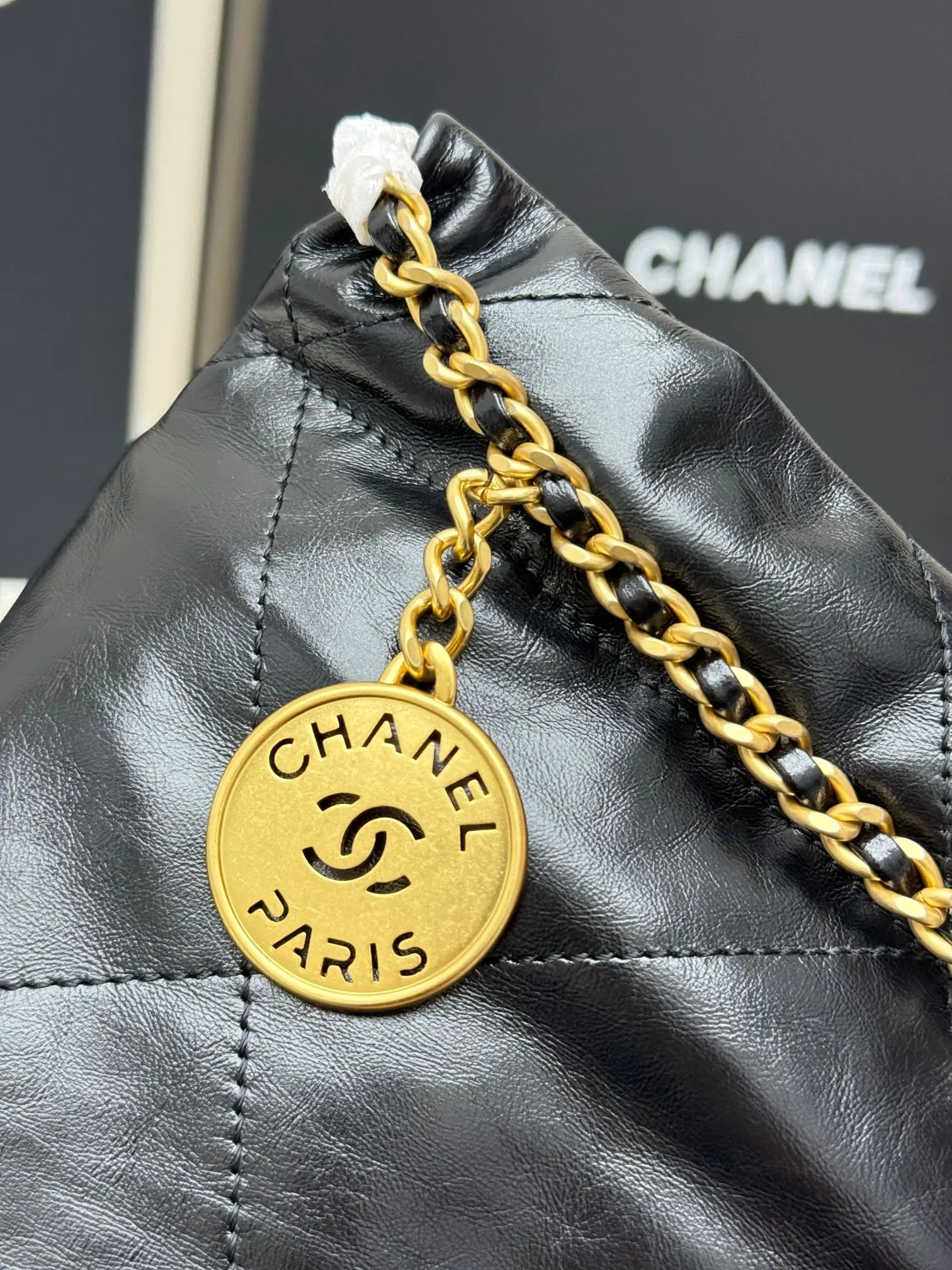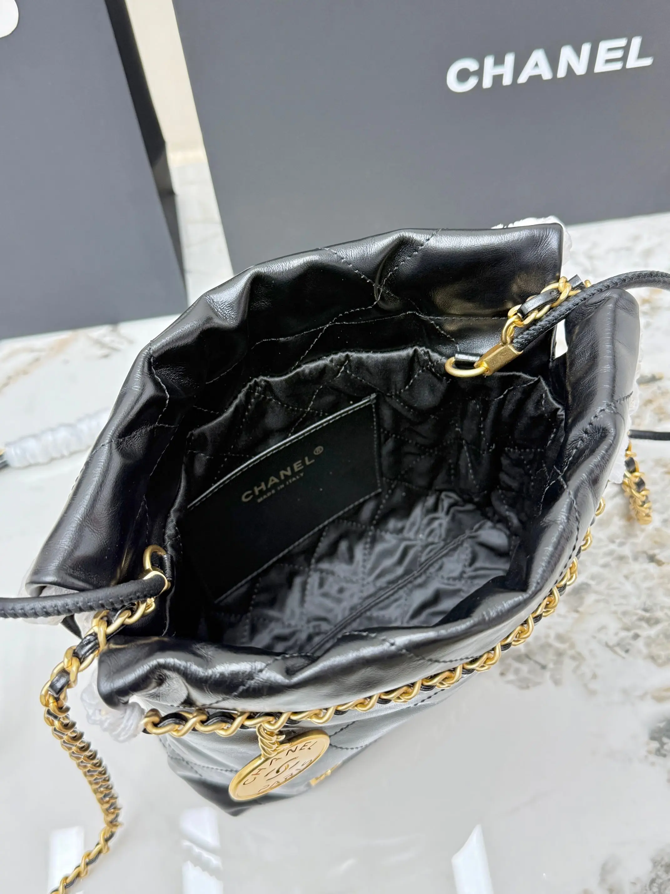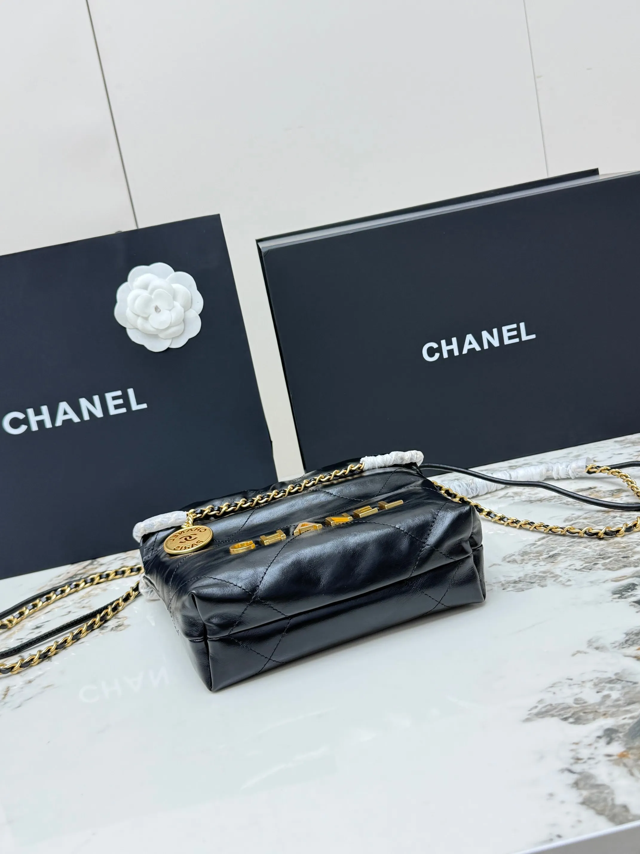 进口原厂皮 CHANEL 迷你垃圾袋 香奈儿顶级原单货23A 22bag水桶包mini春夏火爆经典永不过时的垃圾袋 金标菱形格纹抽绳开合链条亮面油蜡小牛皮可斜挎可单肩 型号 AS3980
