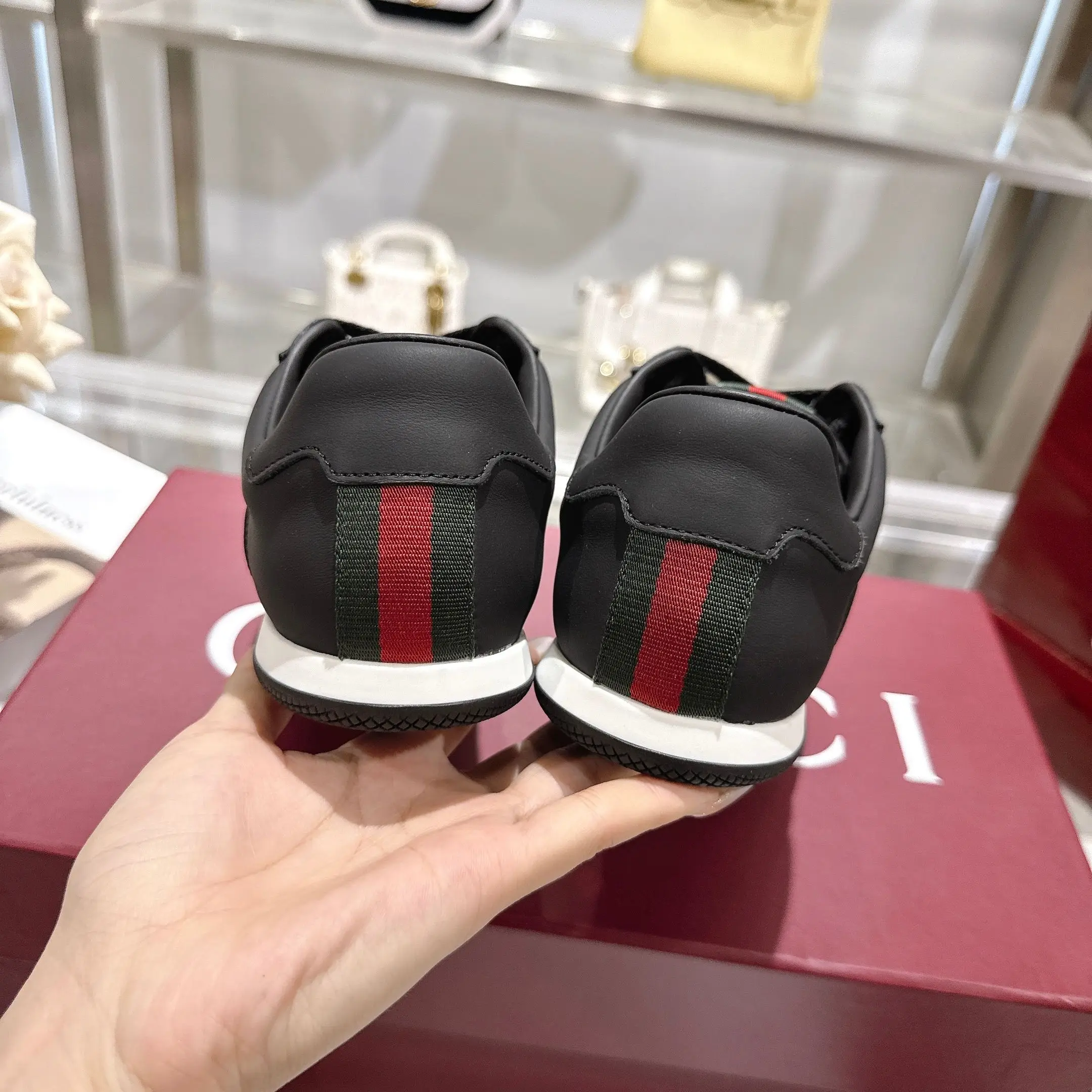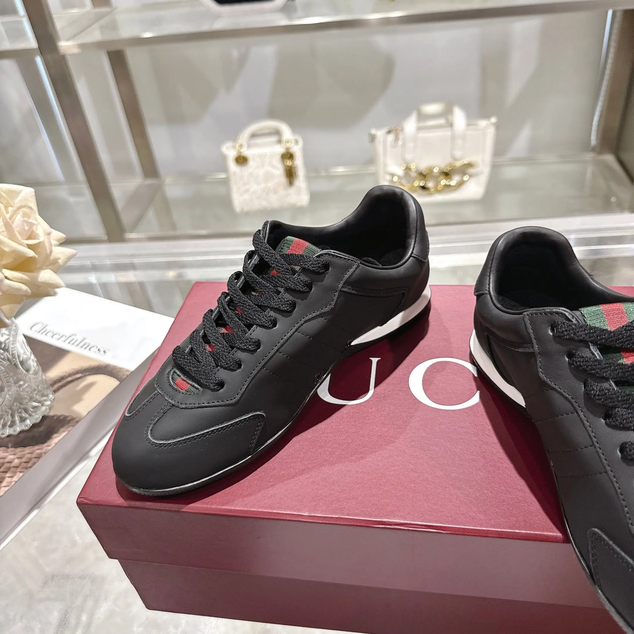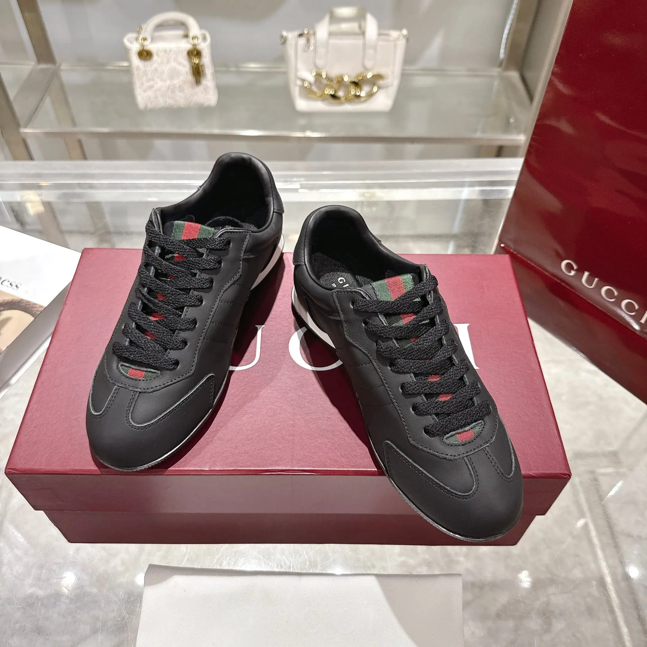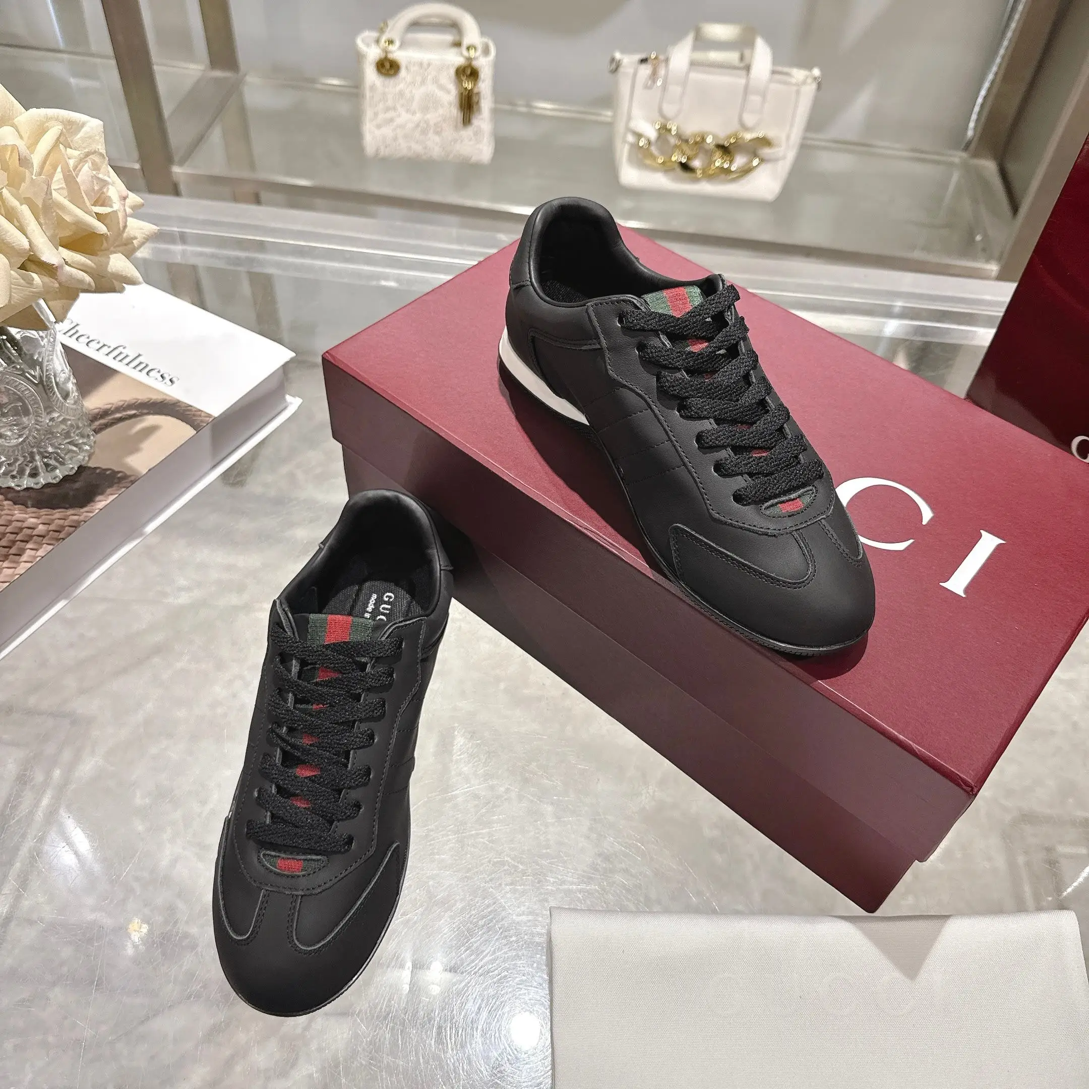 GG德训鞋 爆款 轻盈设计焕新诠释运动风尚 行动间彰显精致质感 侧边缝线细节增添点睛之笔 黑色牛皮面料 黑色牛皮里 乳胶一体成型垫脚 鞋舌与后跟饰标志性红绿色织带 双色橡胶鞋底 男女同款 女码35-40码 男款 39-45码