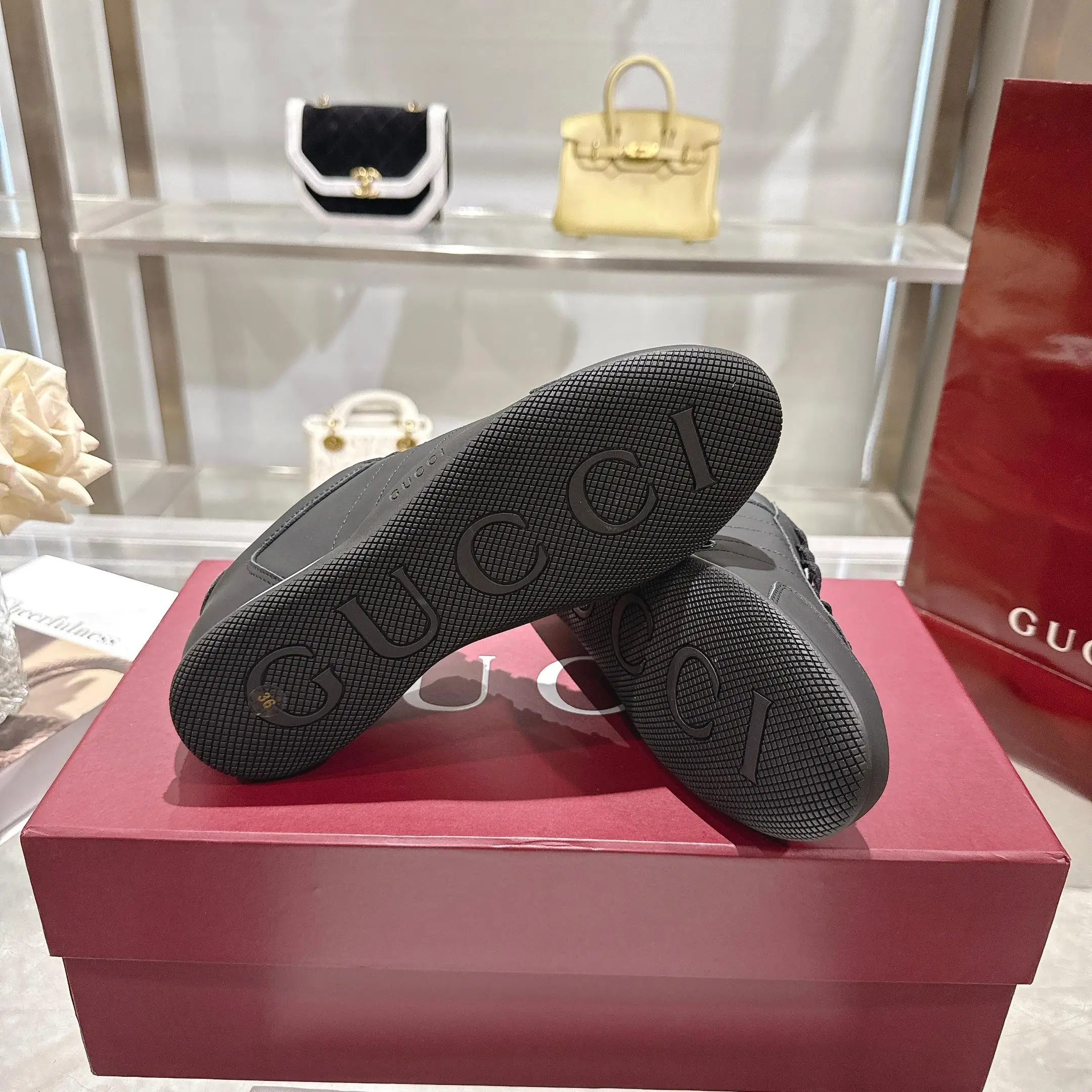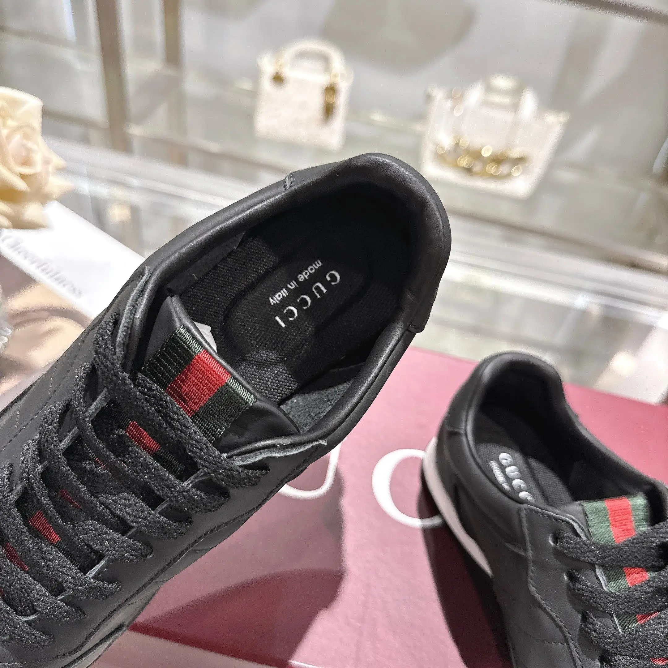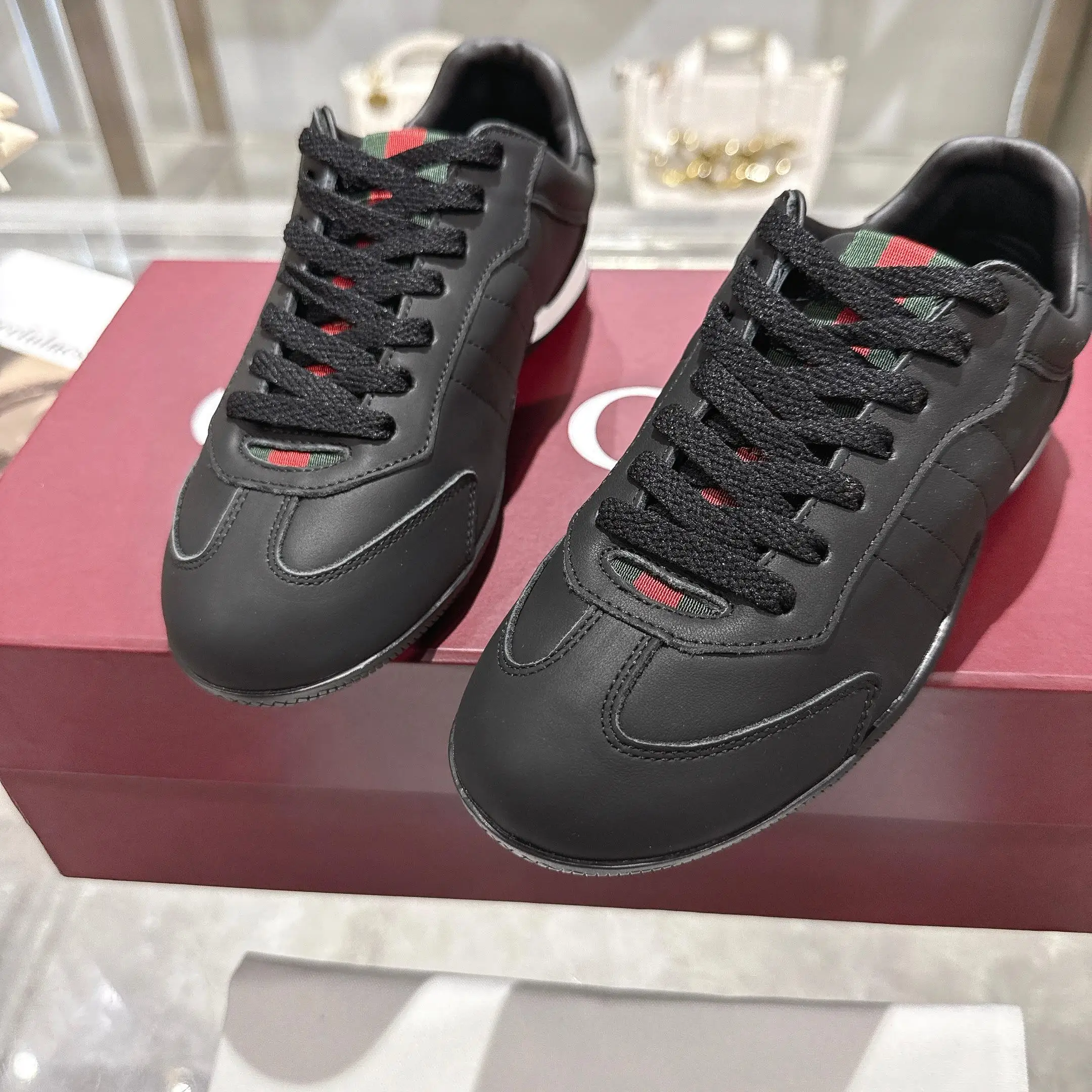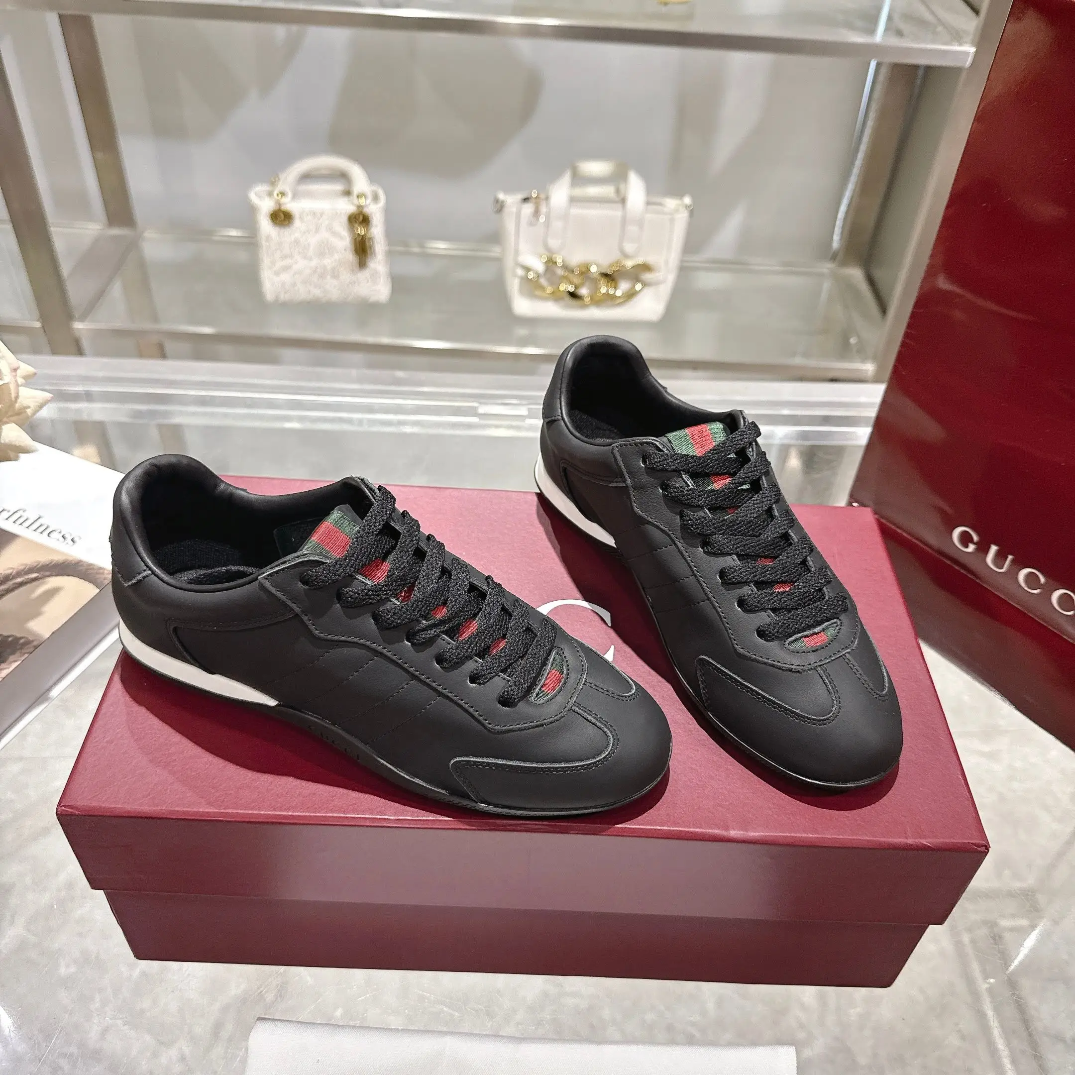 GG德训鞋 爆款 轻盈设计焕新诠释运动风尚 行动间彰显精致质感 侧边缝线细节增添点睛之笔 黑色牛皮面料 黑色牛皮里 乳胶一体成型垫脚 鞋舌与后跟饰标志性红绿色织带 双色橡胶鞋底 男女同款 女码35-40码 男款 39-45码
