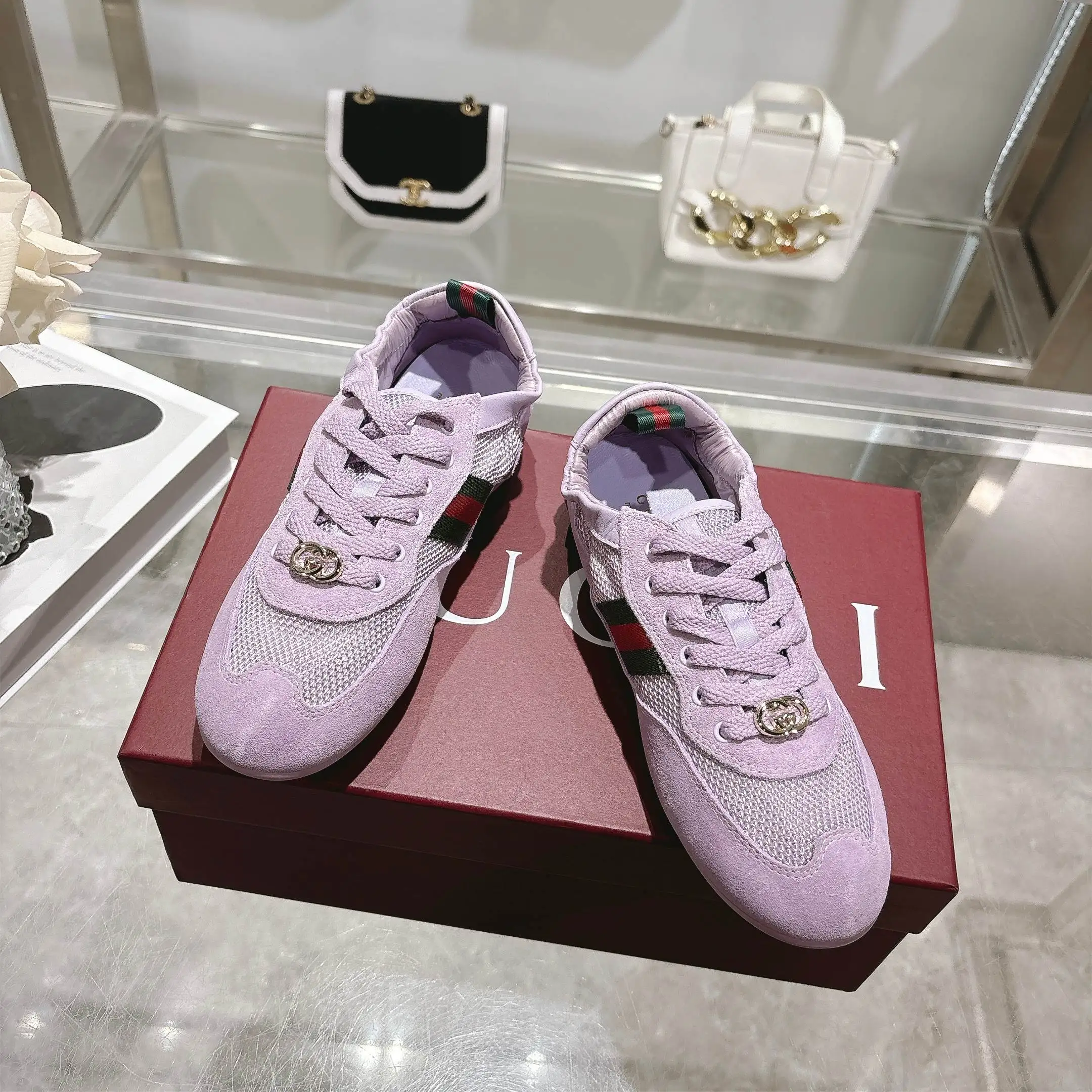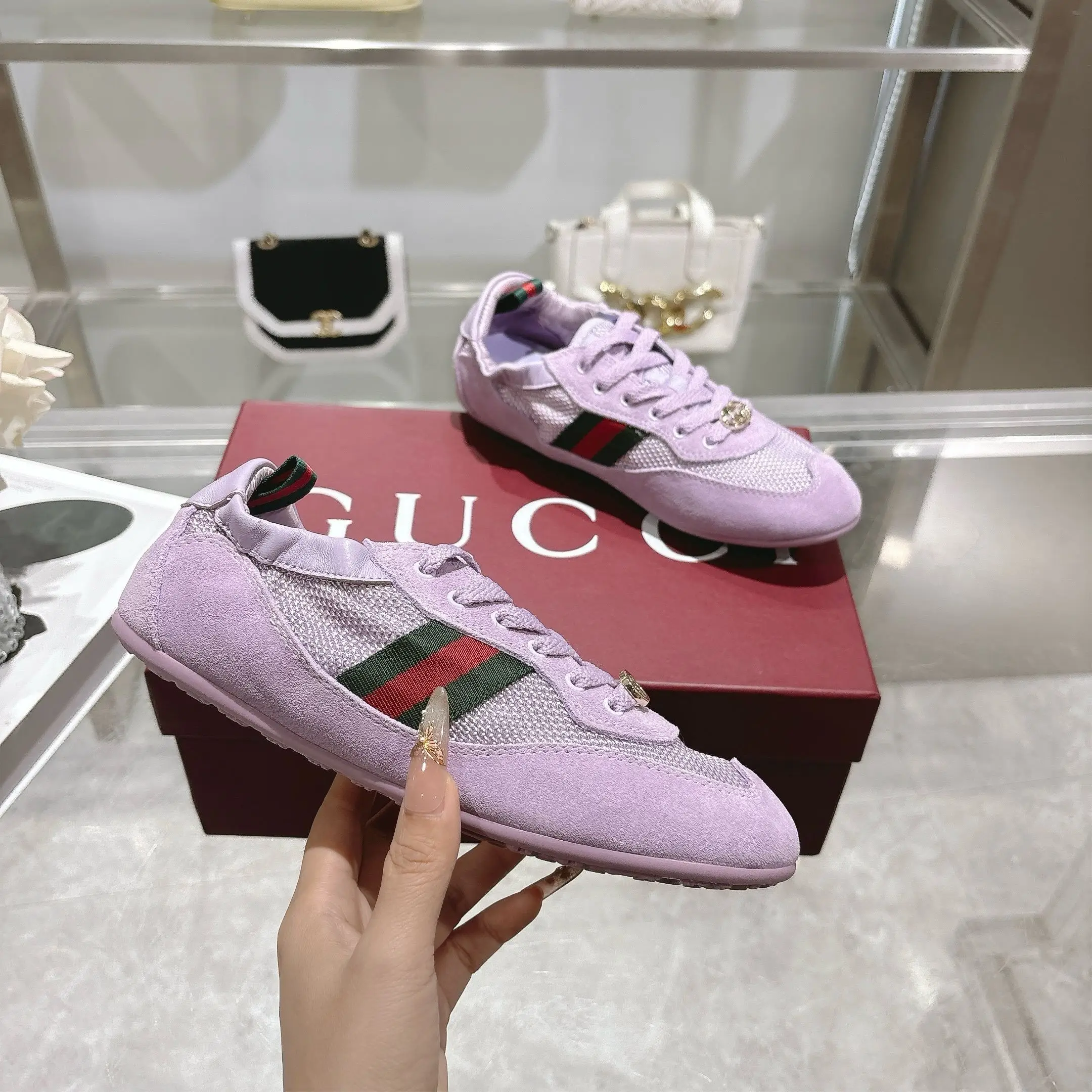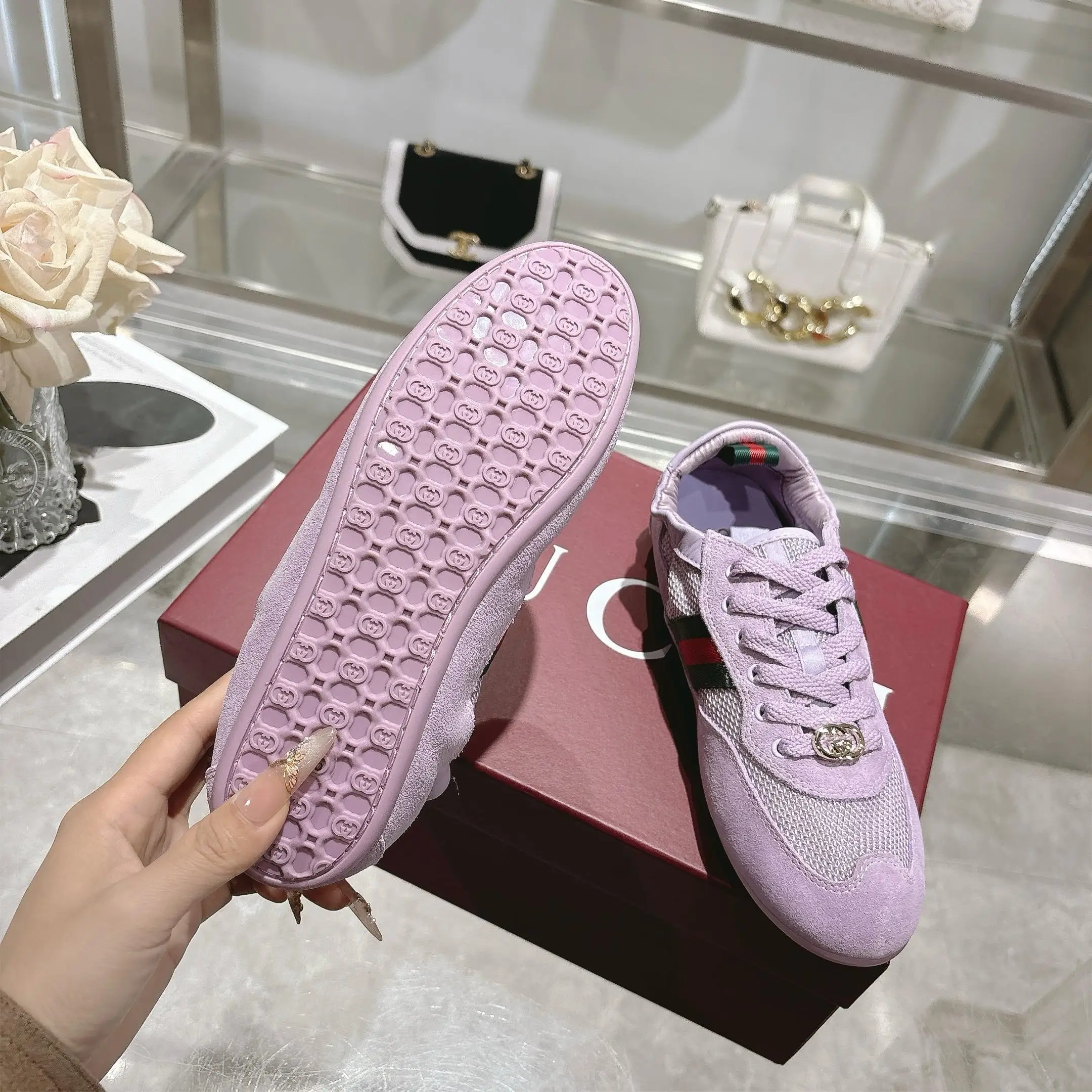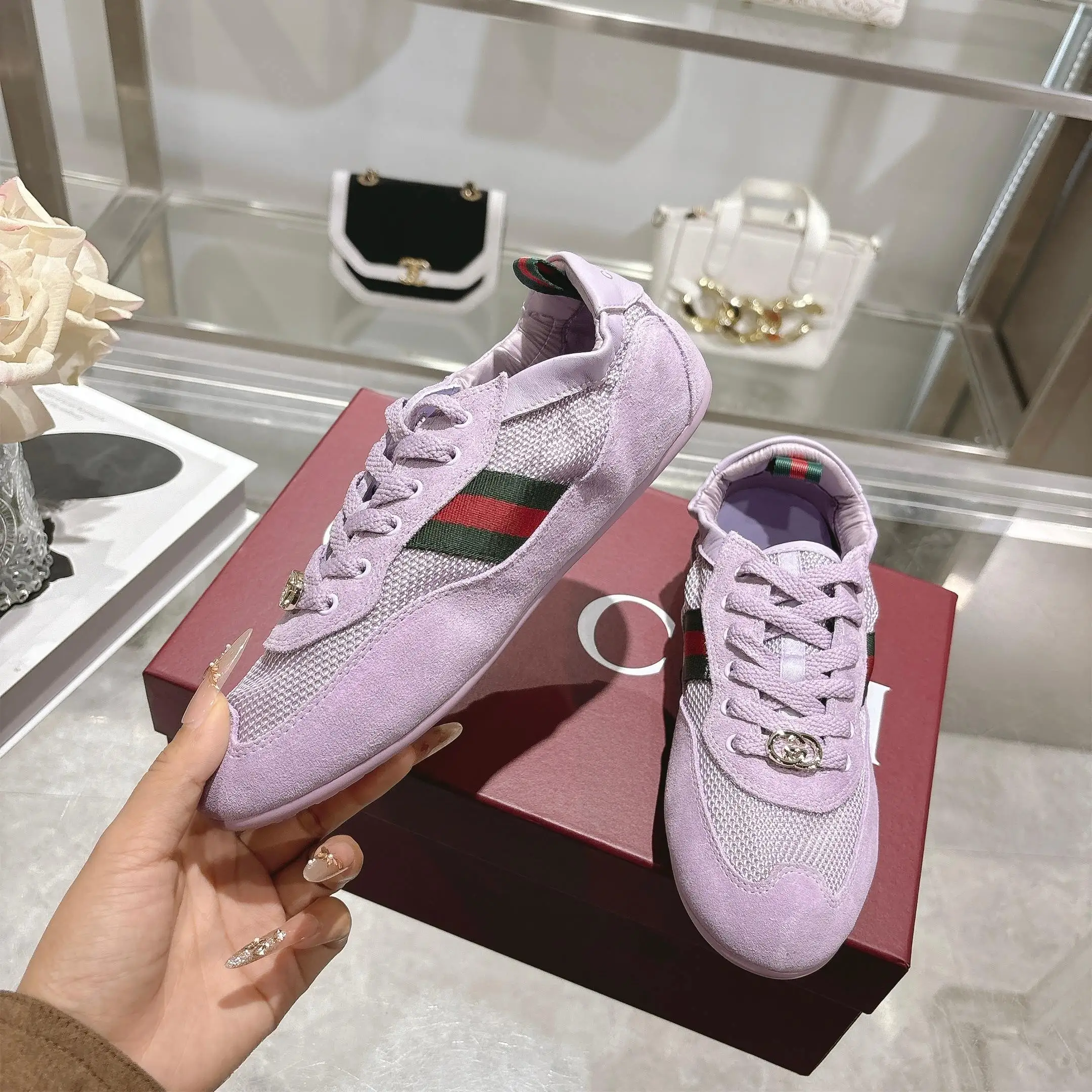GG橡筋鞋超级轻盈柔软到可以卷起来的一双跳舞鞋棕色牛反绒面+GG布 精心缀饰GG五金扣 轻盈质感与闪耀外观兼具 鞋口羊皮包缝橡筋工艺 张驰有度 驰骋随心所欲 羊皮+乳胶垫脚 TPU鞋底 35-40码 紫色
