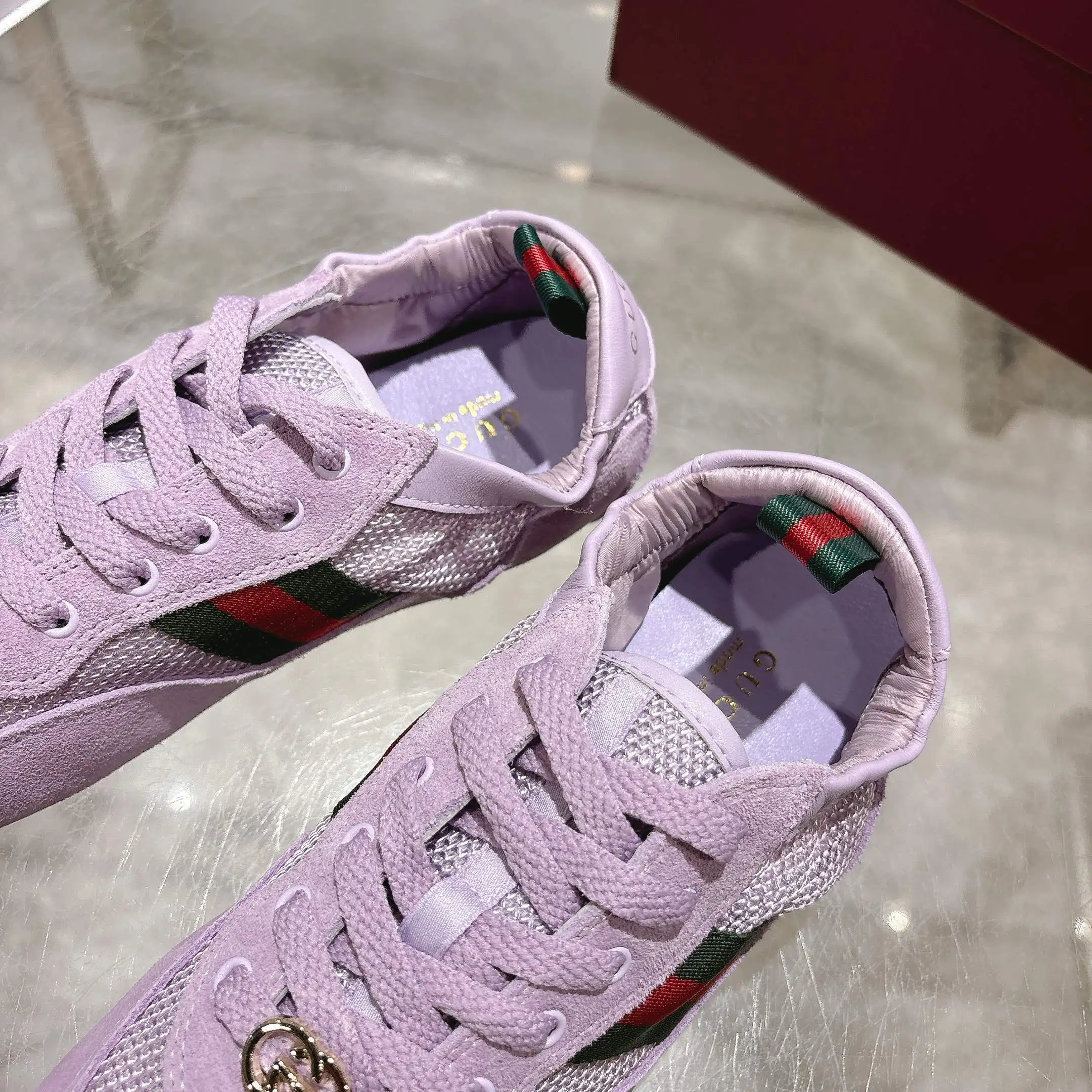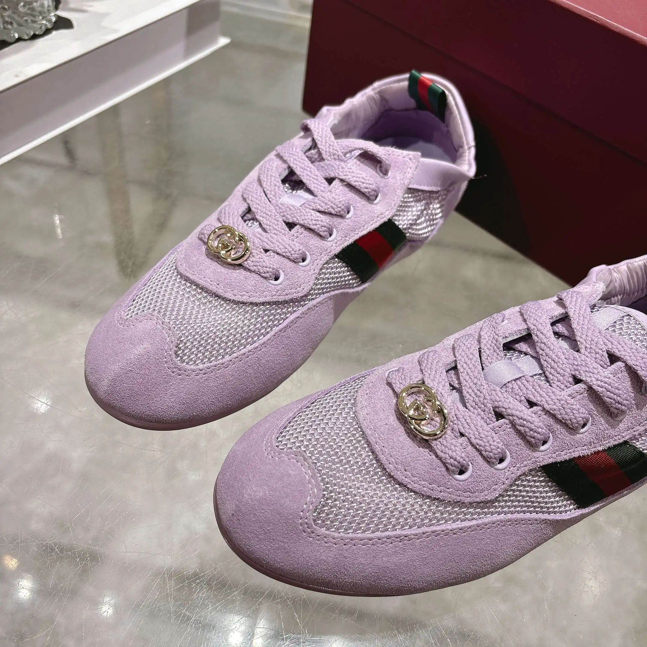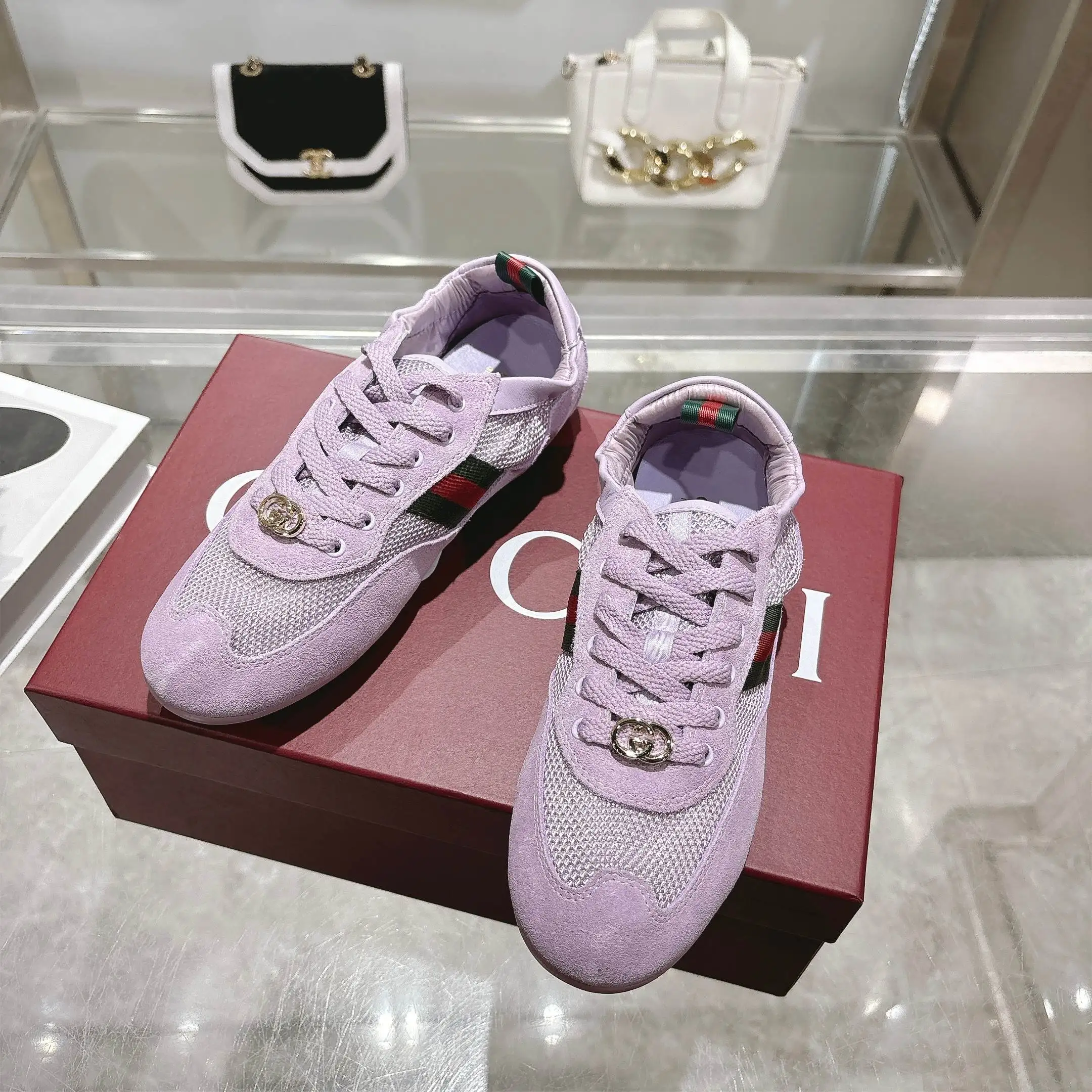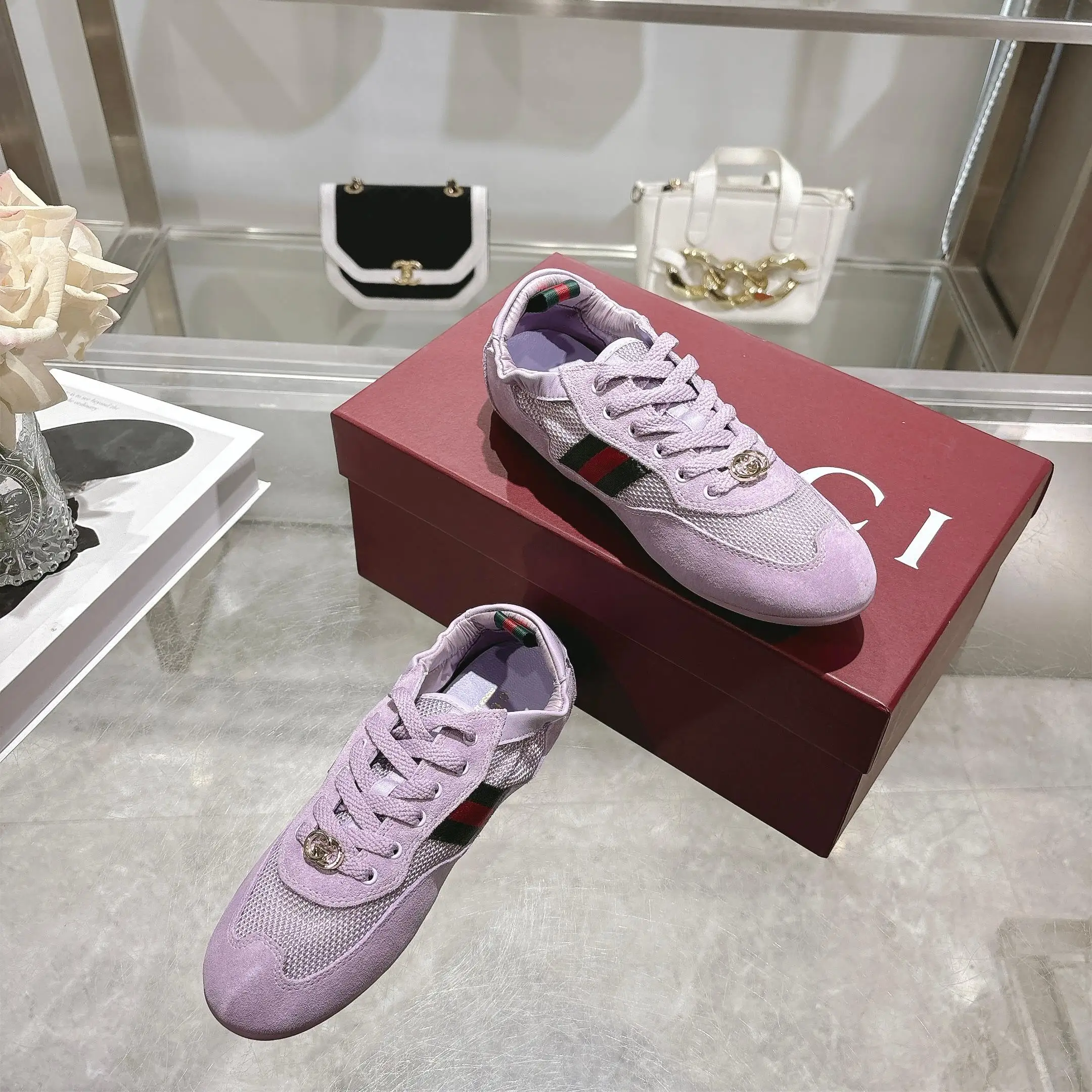 GG橡筋鞋超级轻盈柔软到可以卷起来的一双跳舞鞋棕色牛反绒面+GG布 精心缀饰GG五金扣 轻盈质感与闪耀外观兼具 鞋口羊皮包缝橡筋工艺 张驰有度 驰骋随心所欲 羊皮+乳胶垫脚 TPU鞋底 35-40码 紫色