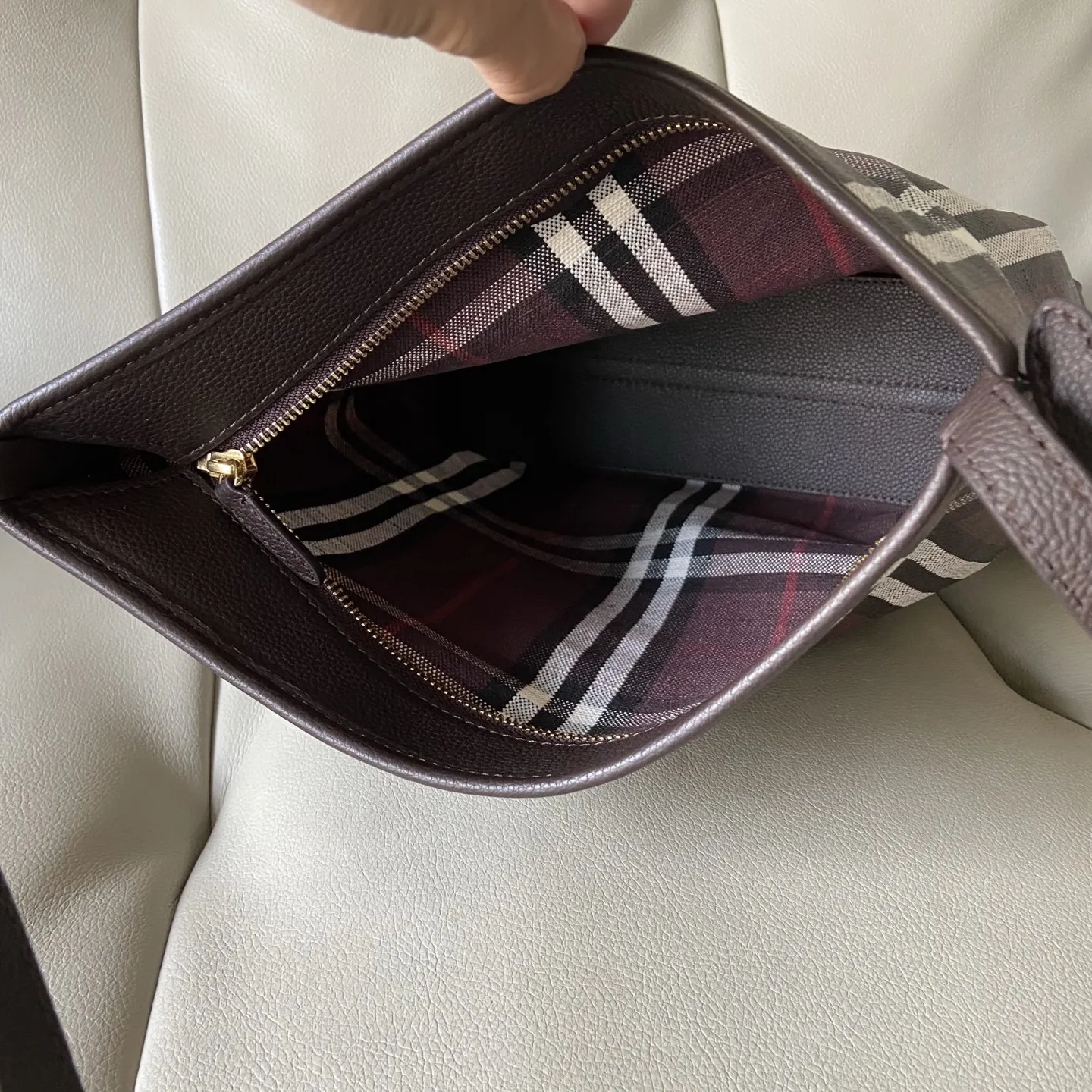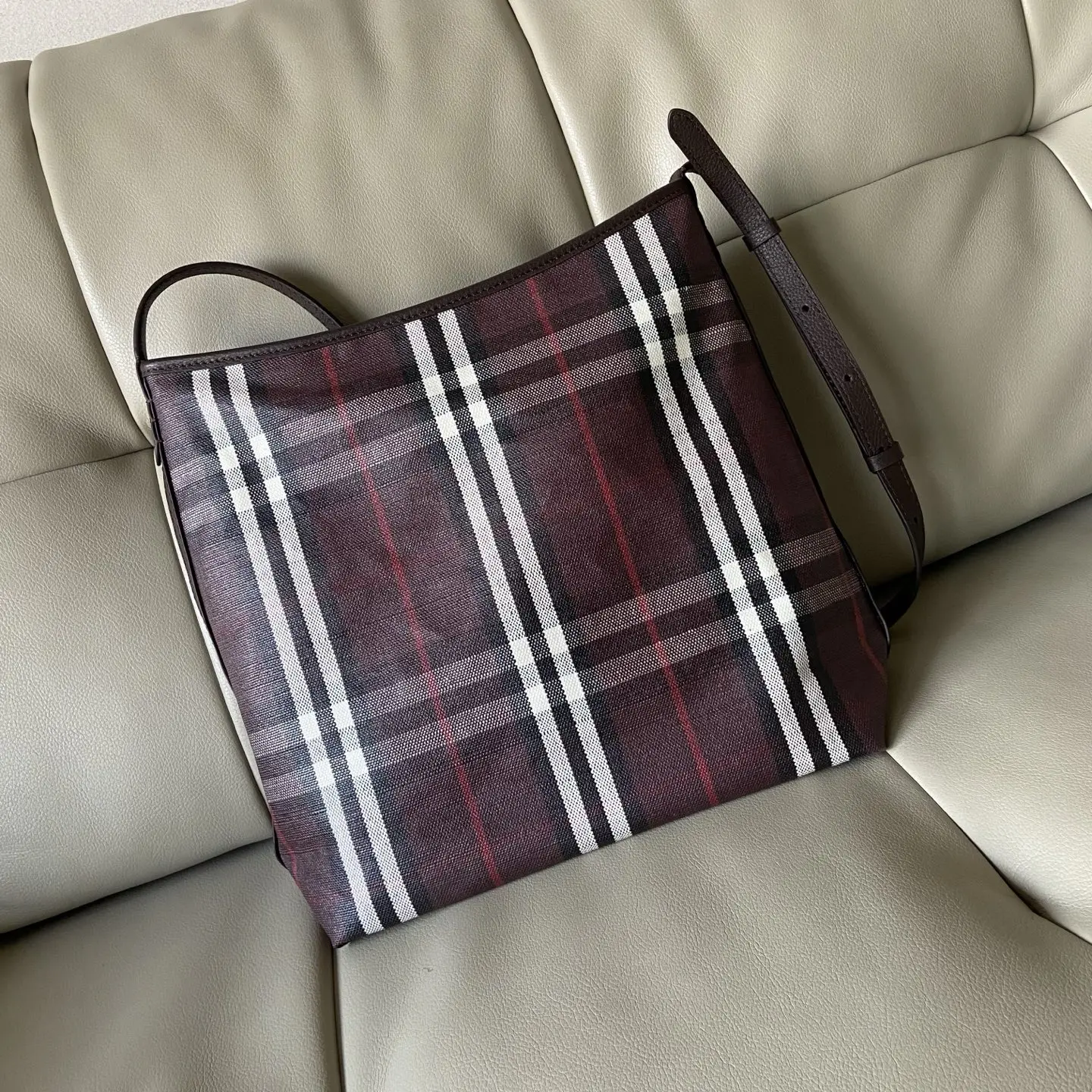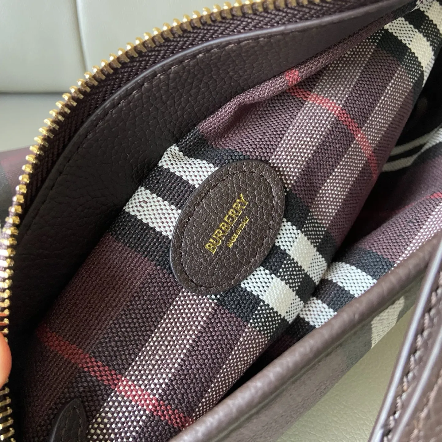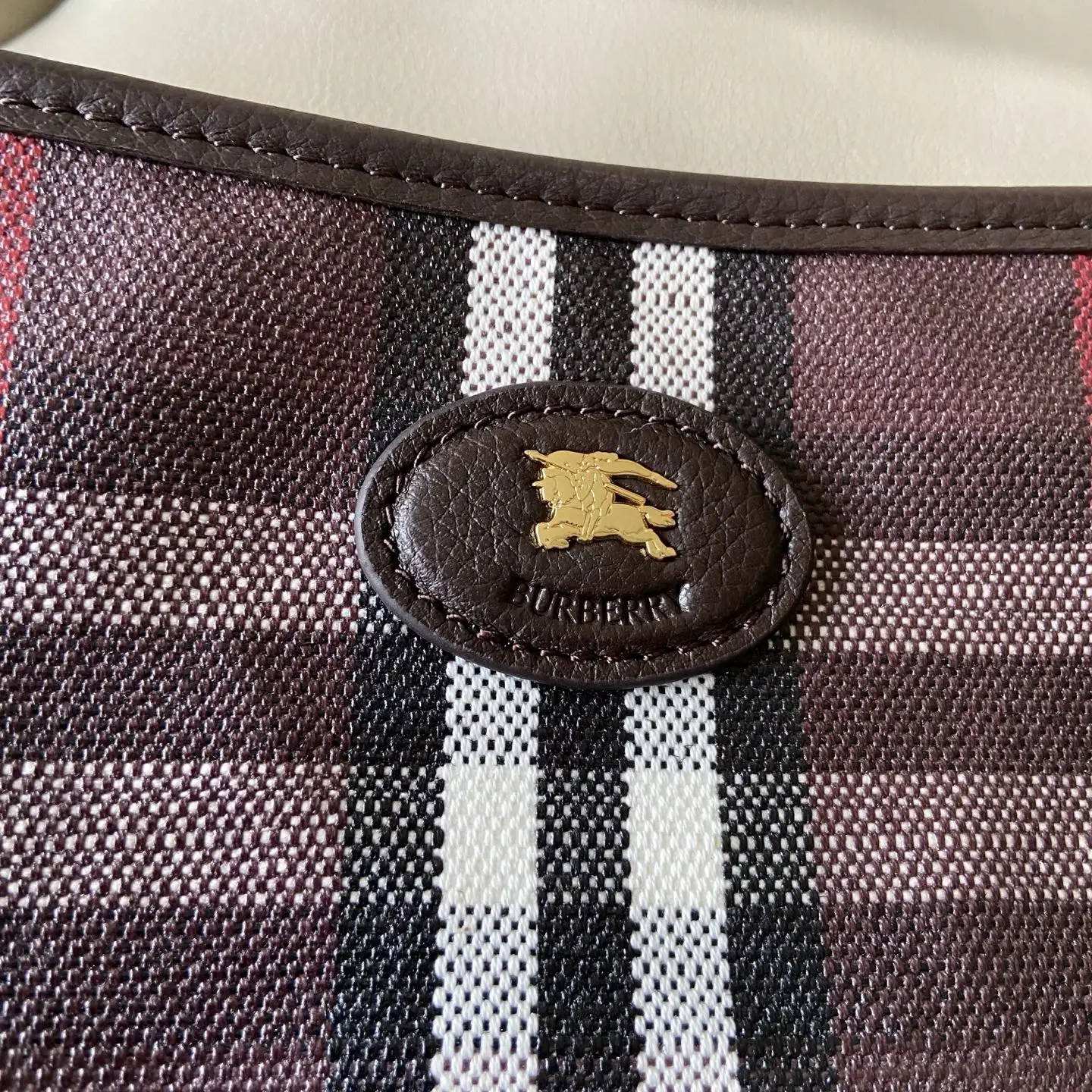原厂 小号Highlands 肩背包 汲取户外设计理念打造 选用棉质亚麻混纺面料制成 呈现光滑小牛皮装饰 融入提花精纺的 Burberry 格纹 设有风衣灵感涂层 采用无内衬设计 搭配纤细肩背带 点缀骑士印章 源自 1980 年代品牌包款的典藏图案 可调式皮革肩背带.拉链开合.手绘涂漆边缘.拉丝金属配件.正面饰有马术骑士徽标 EKD 皮革饰牌.无内衬.尺寸28.5 x 11.5 x 31cm