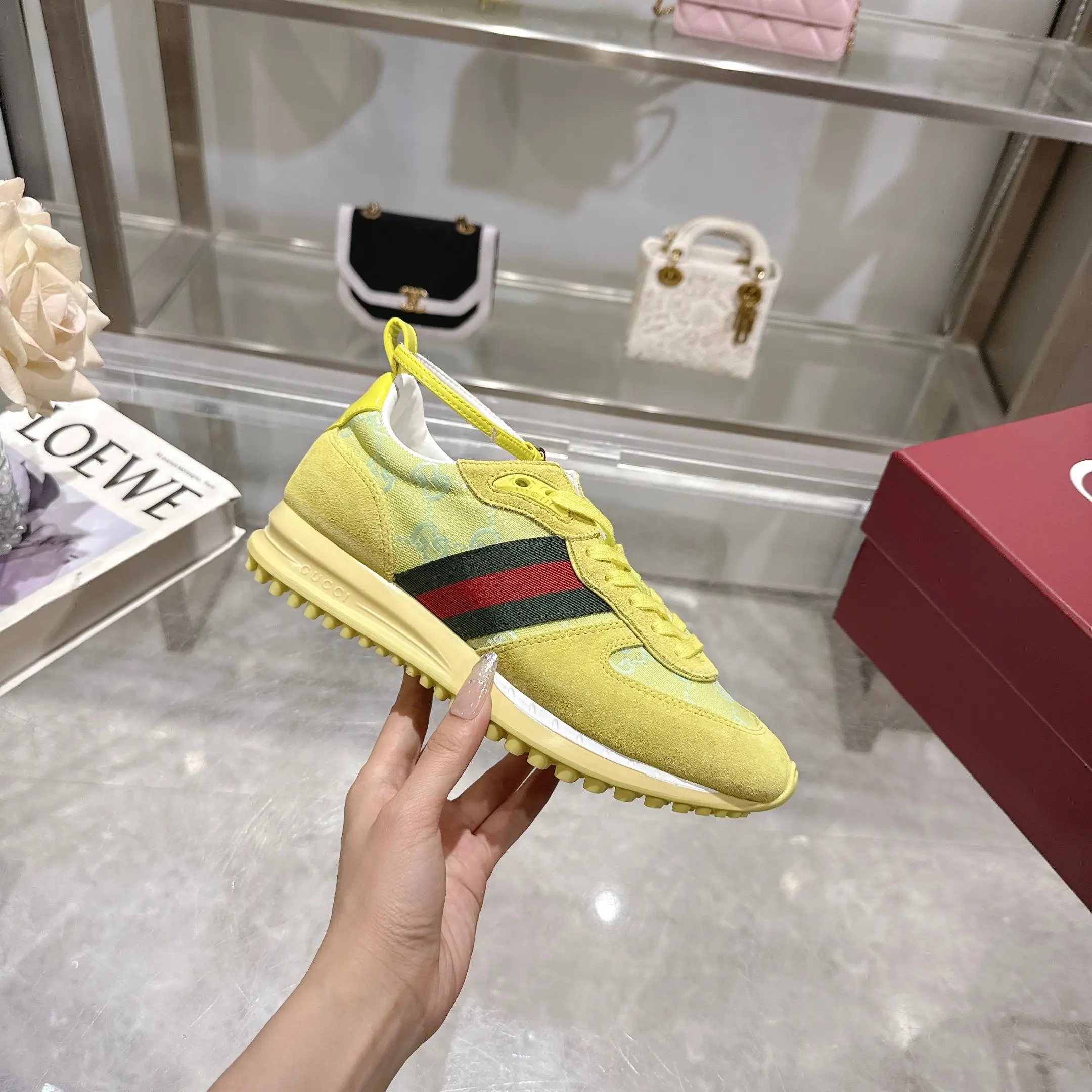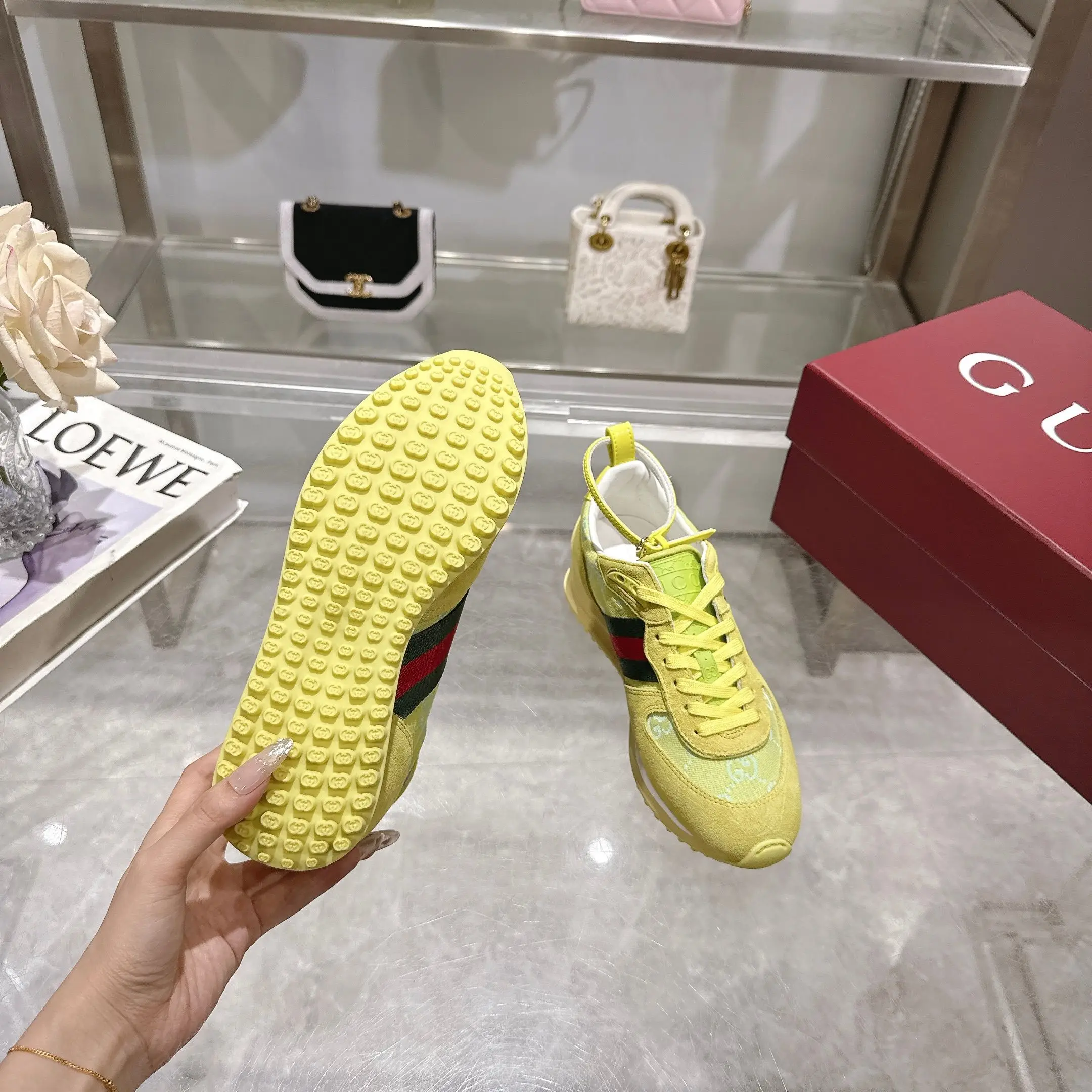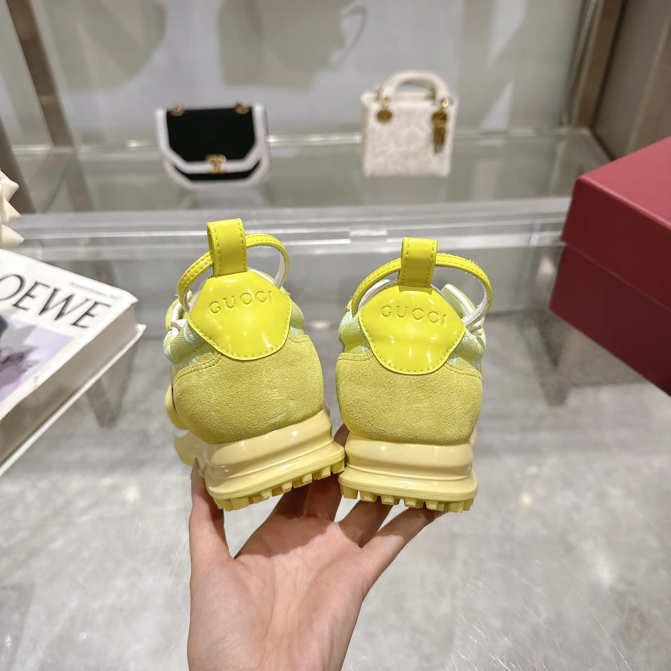2025动感单品轻盈且灵活的外底经过特殊处理洋溢着浓郁的复古风情可拆卸可调节踝部绑带 鞋舌饰以高频压花工艺打造的3D立体Gucci字样标识织物衬里舒适透气超轻抽真空发泡鞋底 非常轻便35-40码 浅绿色 可以做41码