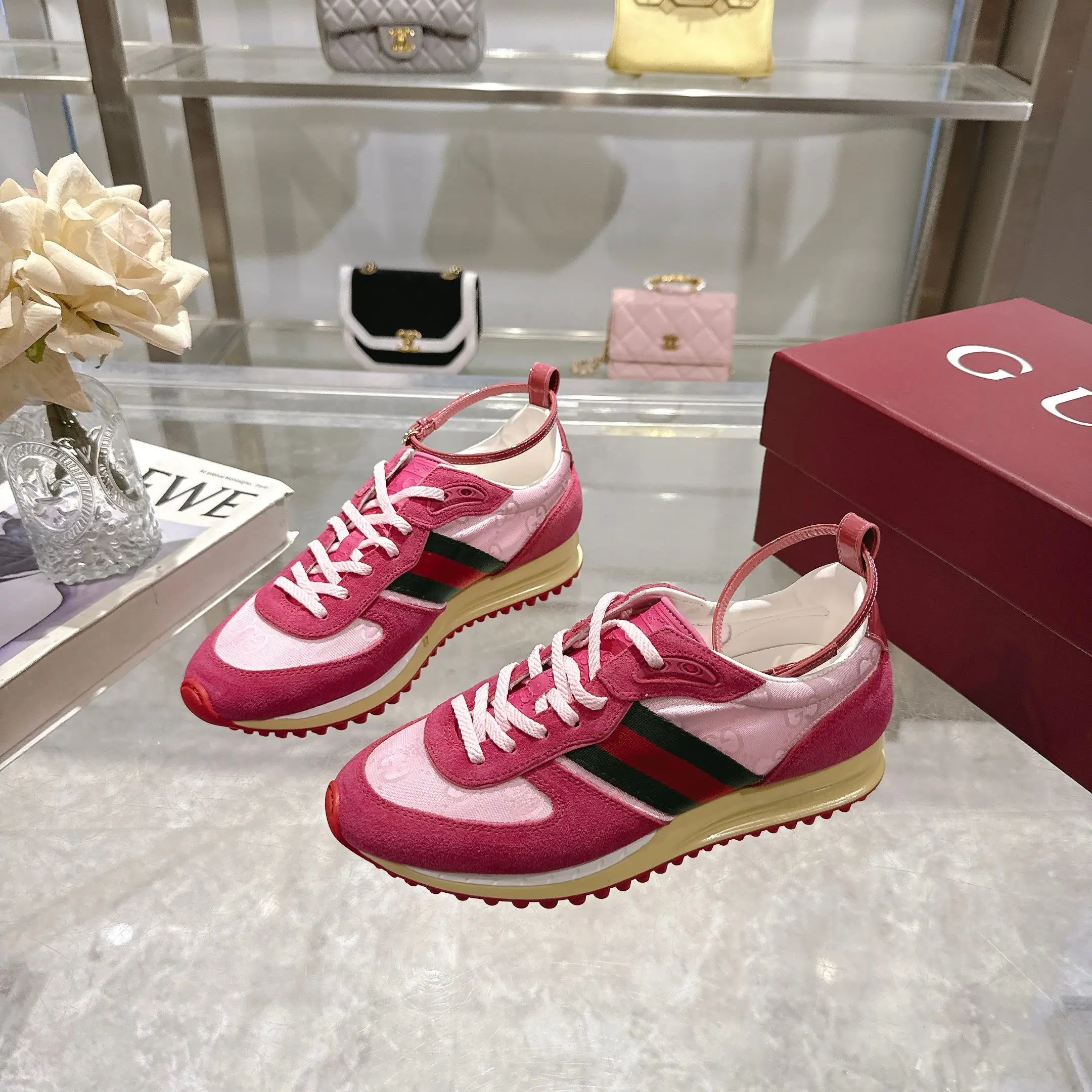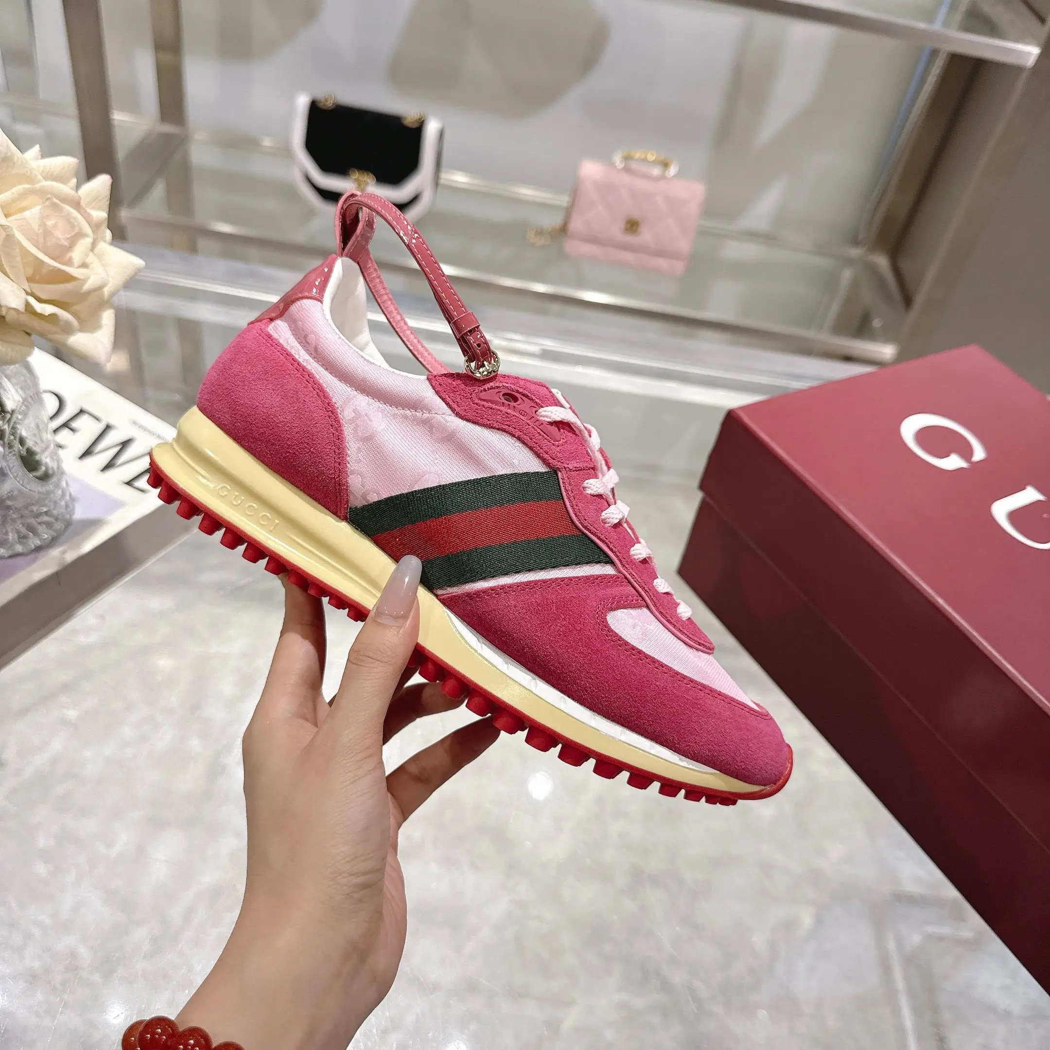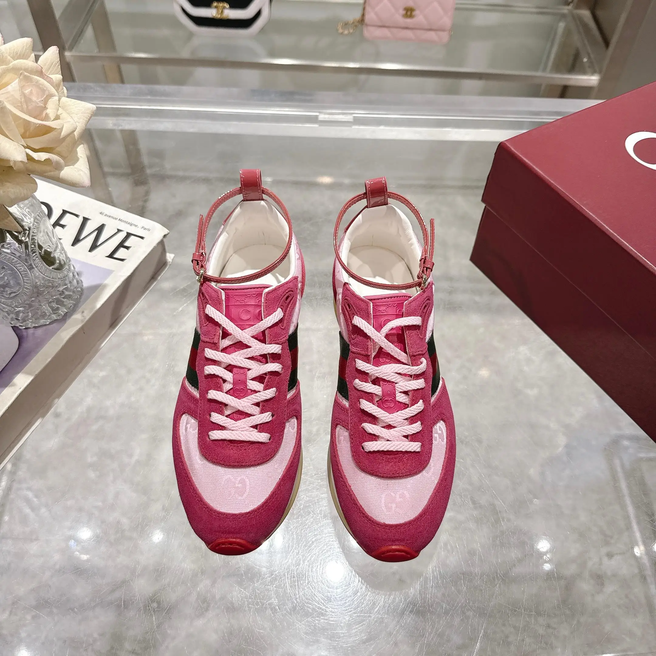2025动感单品轻盈且灵活的外底经过特殊处理洋溢着浓郁的复古风情可拆卸可调节踝部绑带 鞋舌饰以高频压花工艺打造的3D立体Gucci字样标识织物衬里舒适透气超轻抽真空发泡鞋底 非常轻便35-40码 粉红 可以做41码