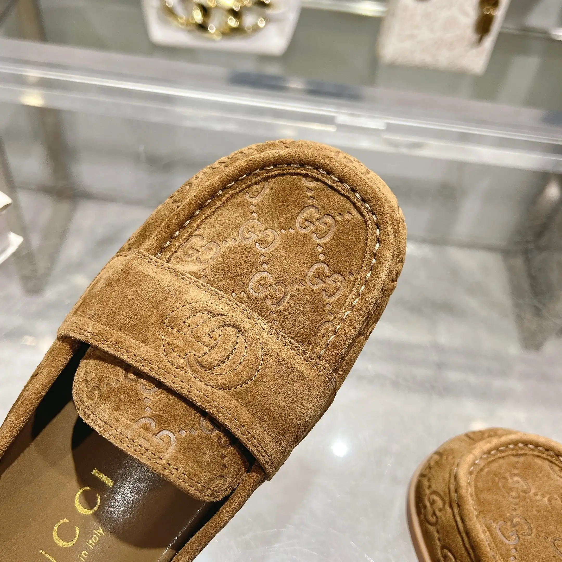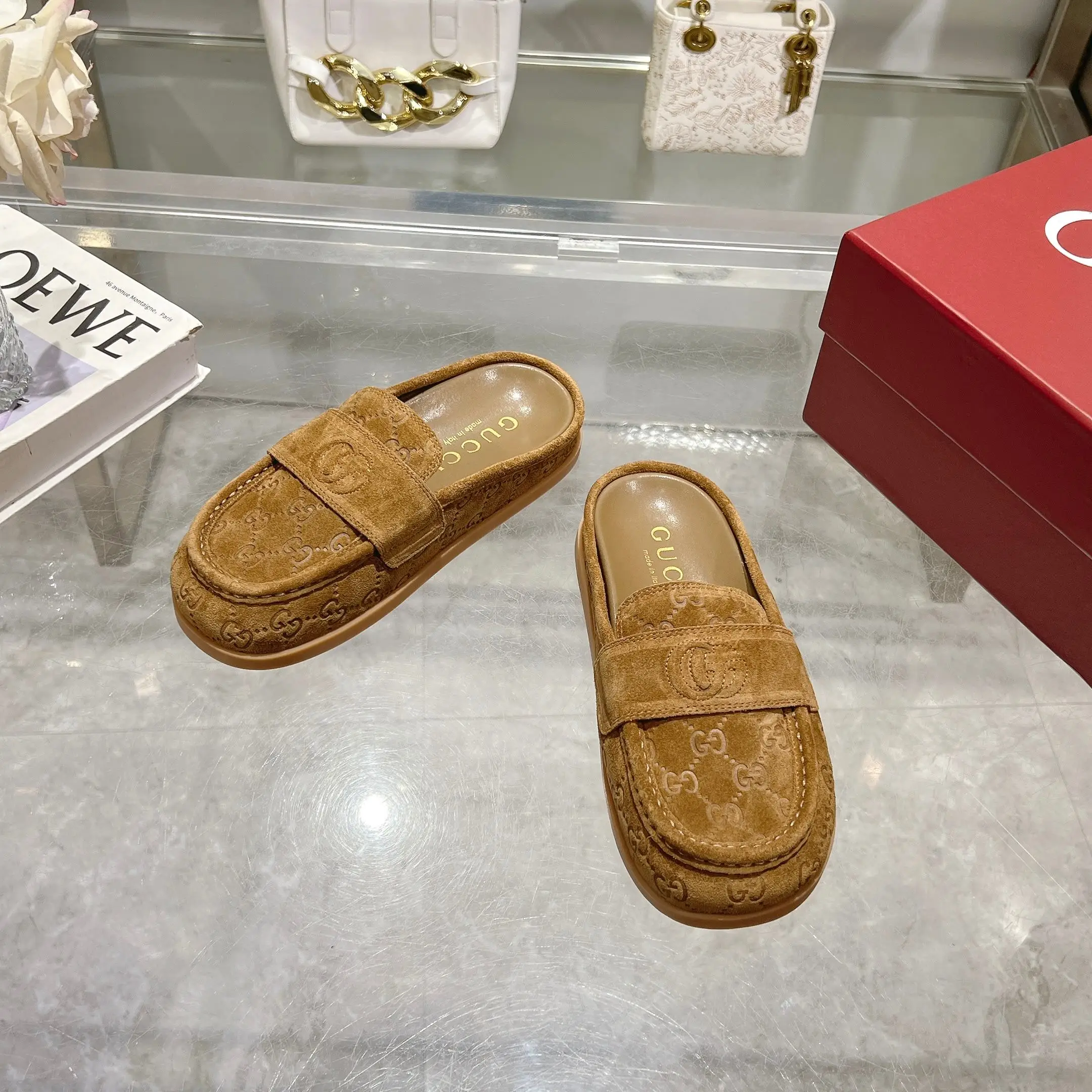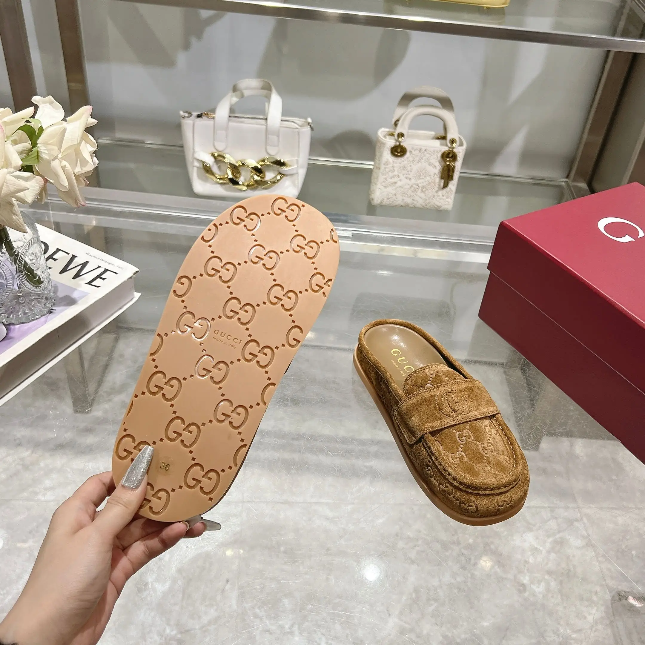 GG早春爆款穆勒鞋 拖鞋 采用柔软绒面皮在意大利制成 鞋面压印品牌标志性双G字母 横扣带上刺 绣 GG Logo图案 萌萌圆鞋头点缀手工凸缝线迹橡胶鞋底增添抓地力 一脚蹬套穿方便实用35-40 栗色