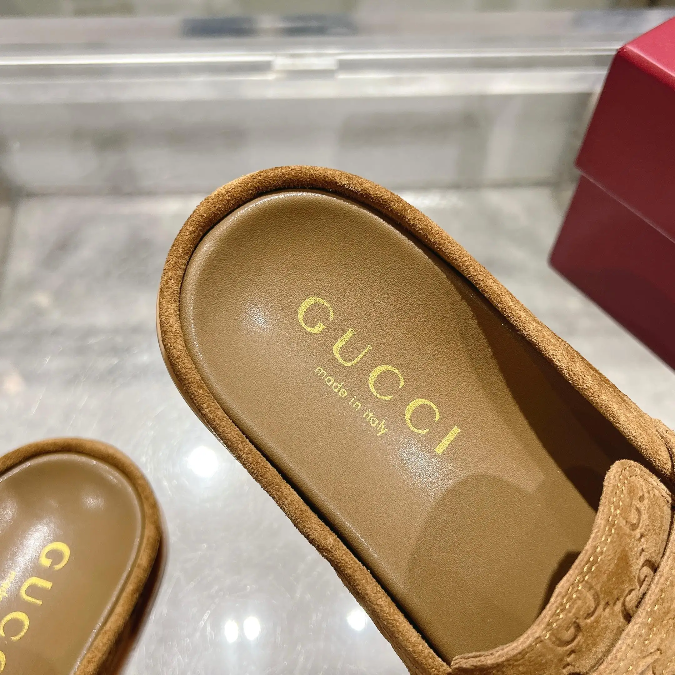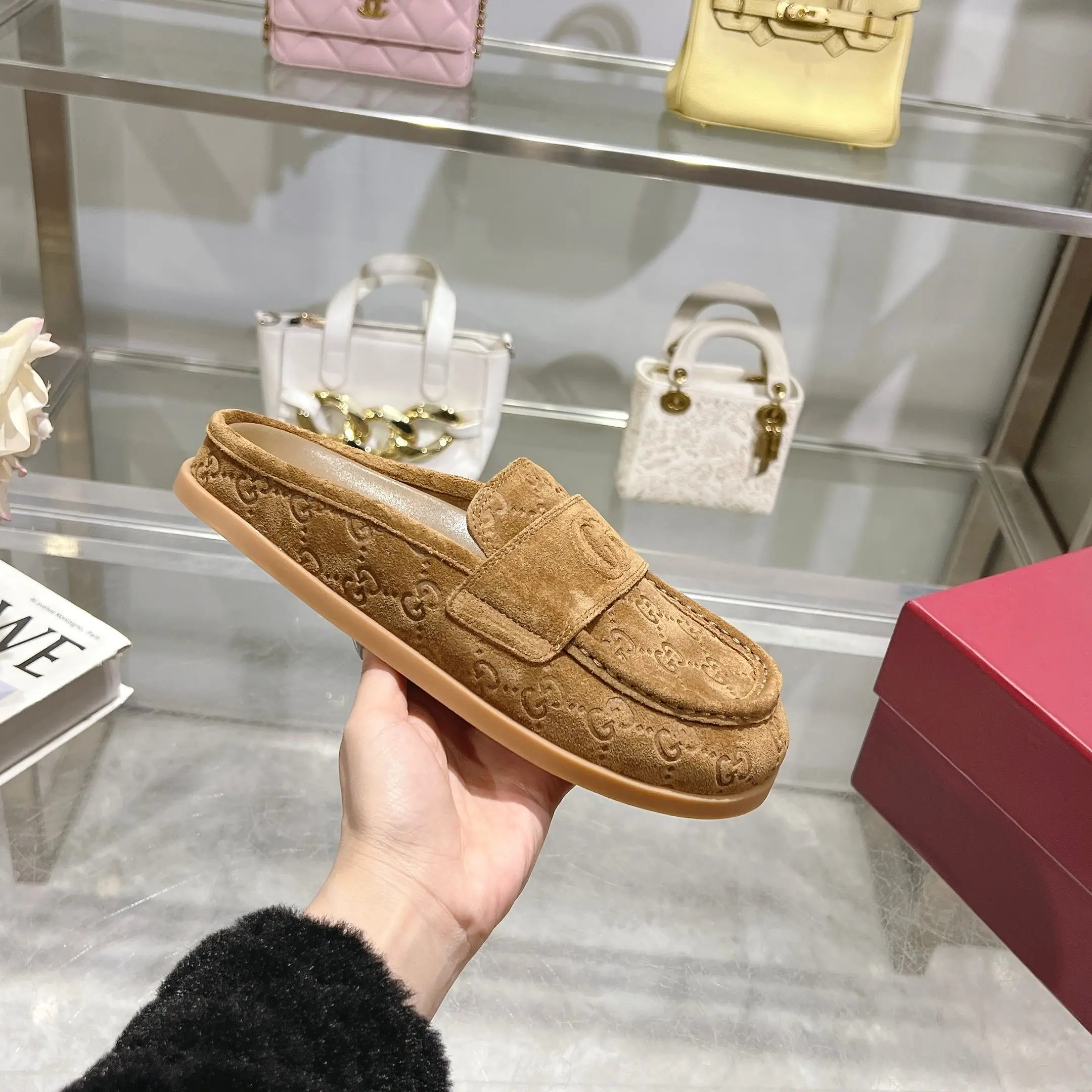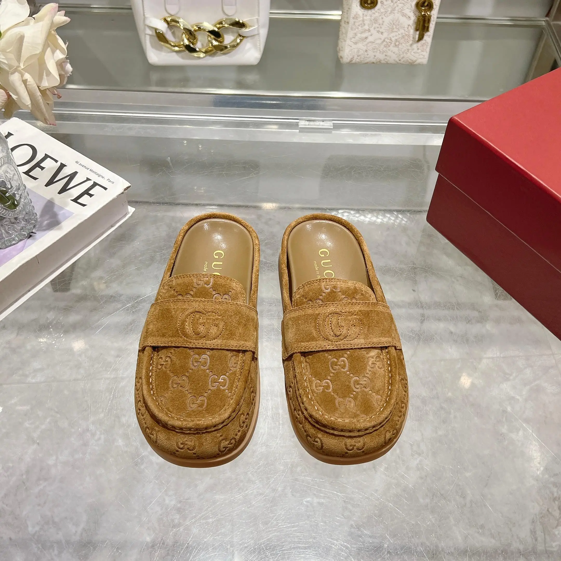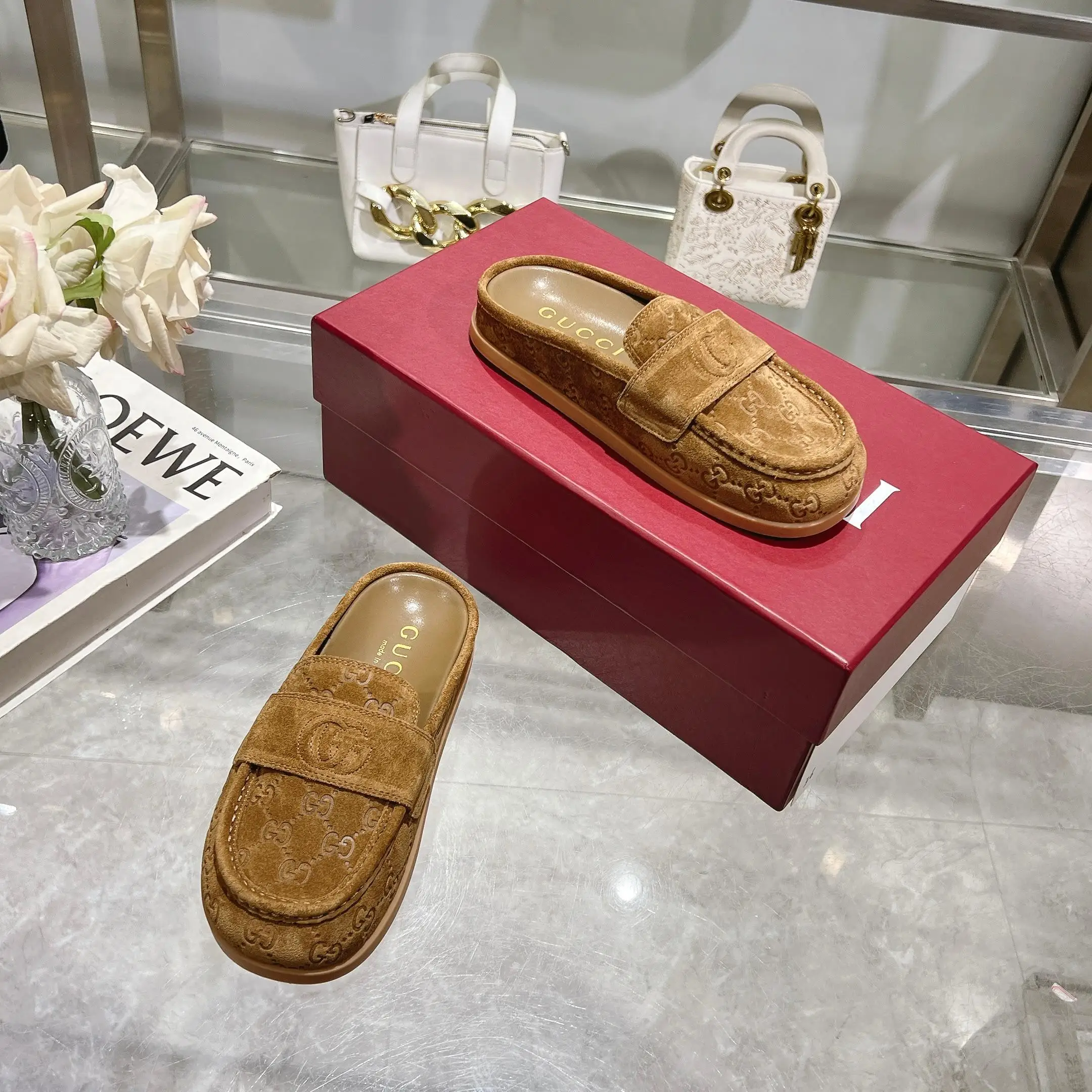 GG早春爆款穆勒鞋 拖鞋 采用柔软绒面皮在意大利制成 鞋面压印品牌标志性双G字母 横扣带上刺 绣 GG Logo图案 萌萌圆鞋头点缀手工凸缝线迹橡胶鞋底增添抓地力 一脚蹬套穿方便实用35-40 栗色