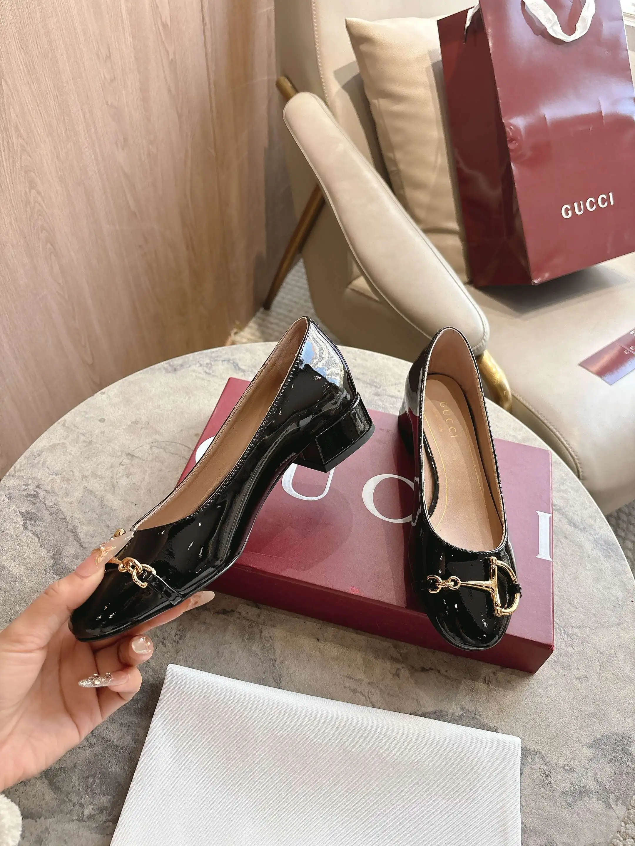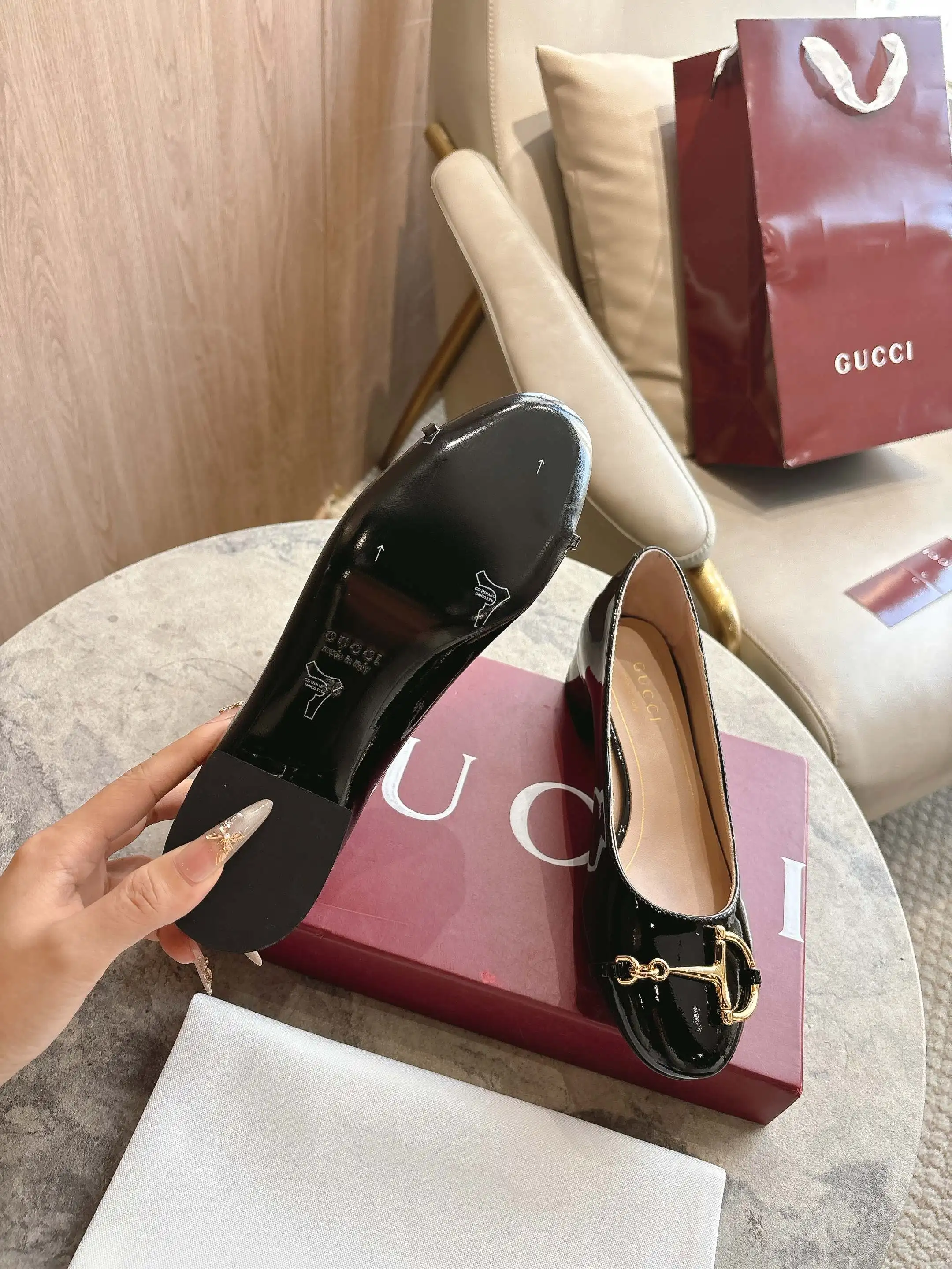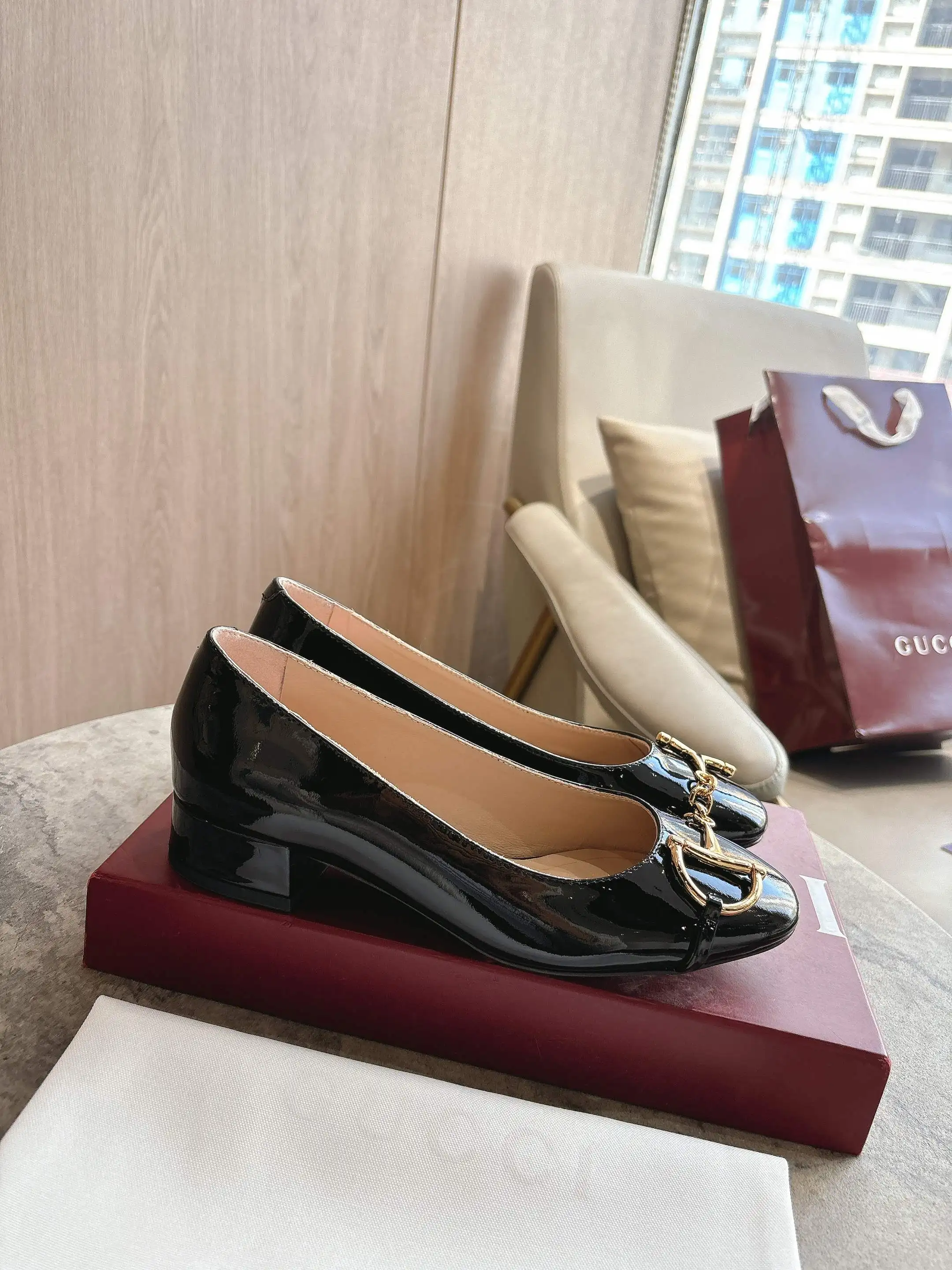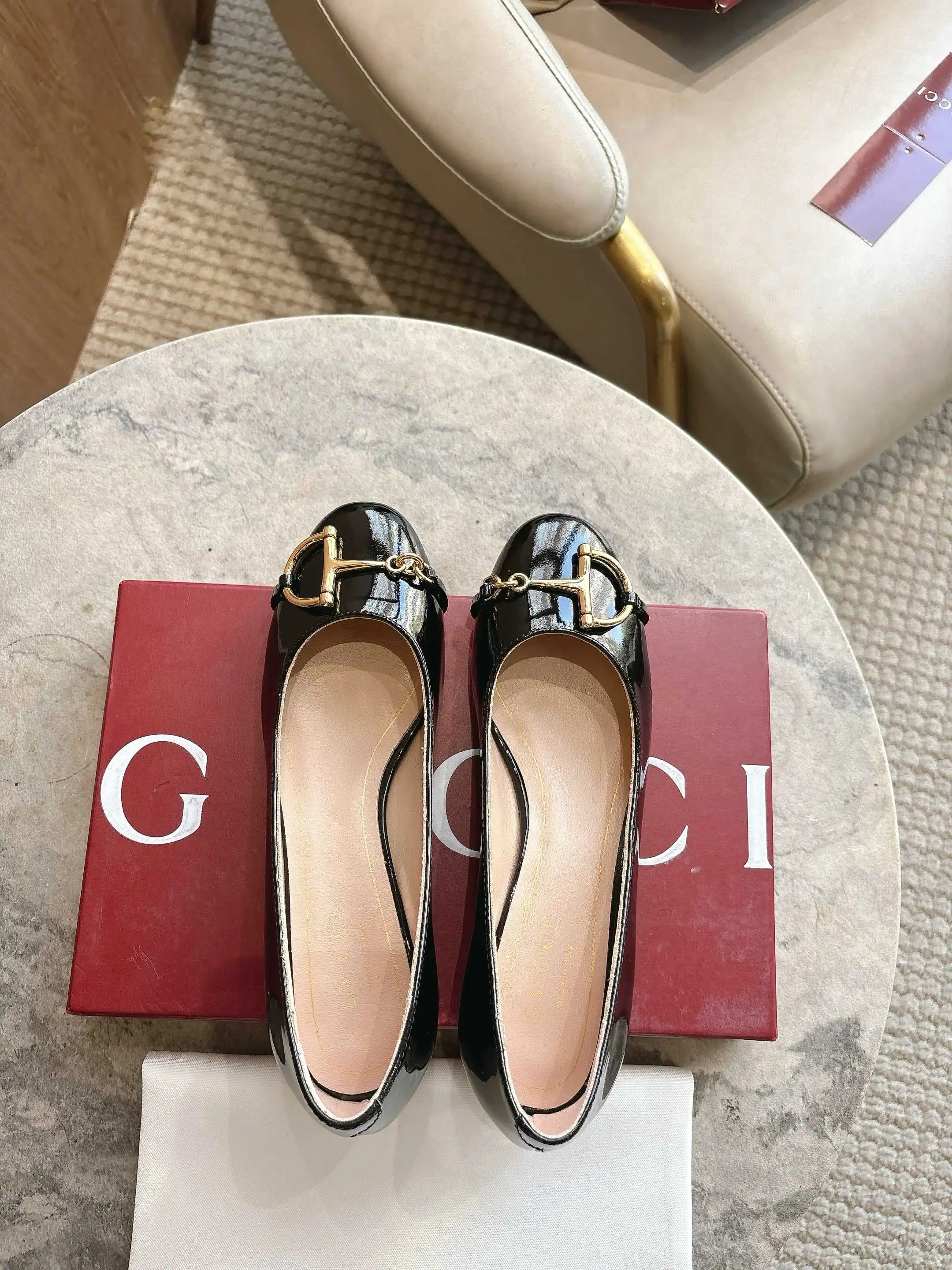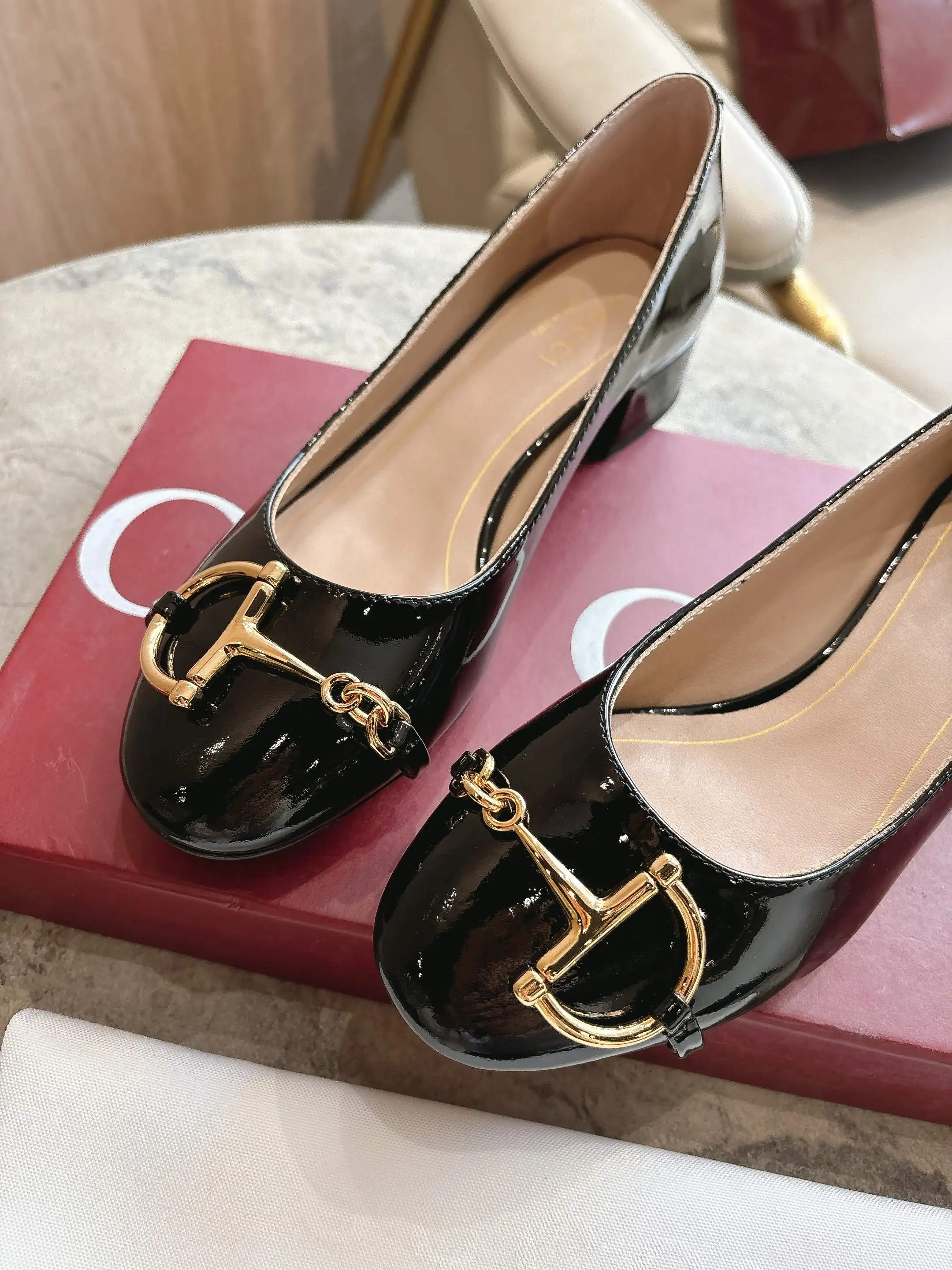1168-3 黑 35-42 2025秋冬系列, 这款女士芭蕾舞平底采用光泽感漆皮匠心打造 以品牌标志性元素焕新诠释经典廓形 金色调半马衔扣细节增添雅致风范 透过当代视角致敬品牌马术传承