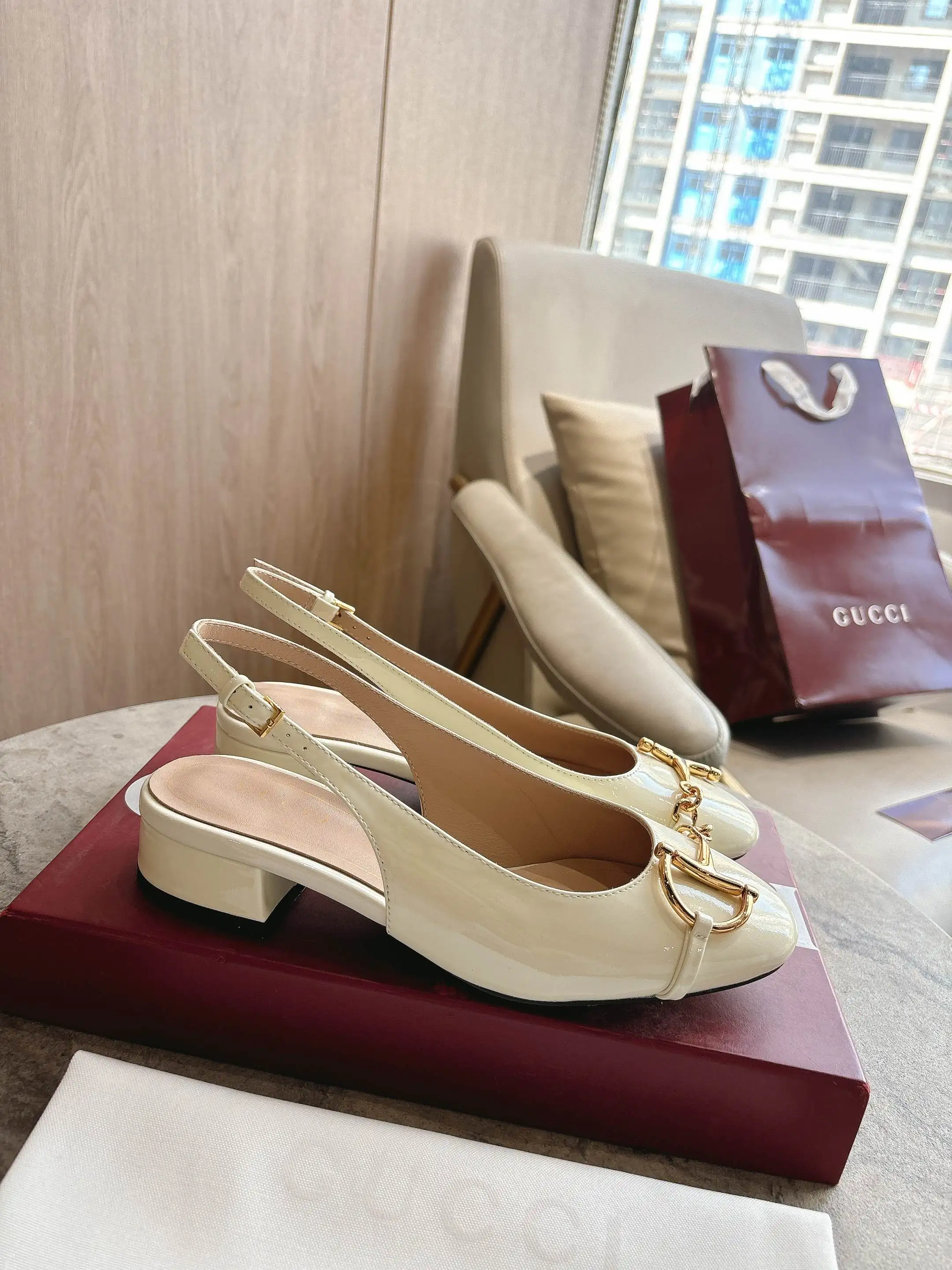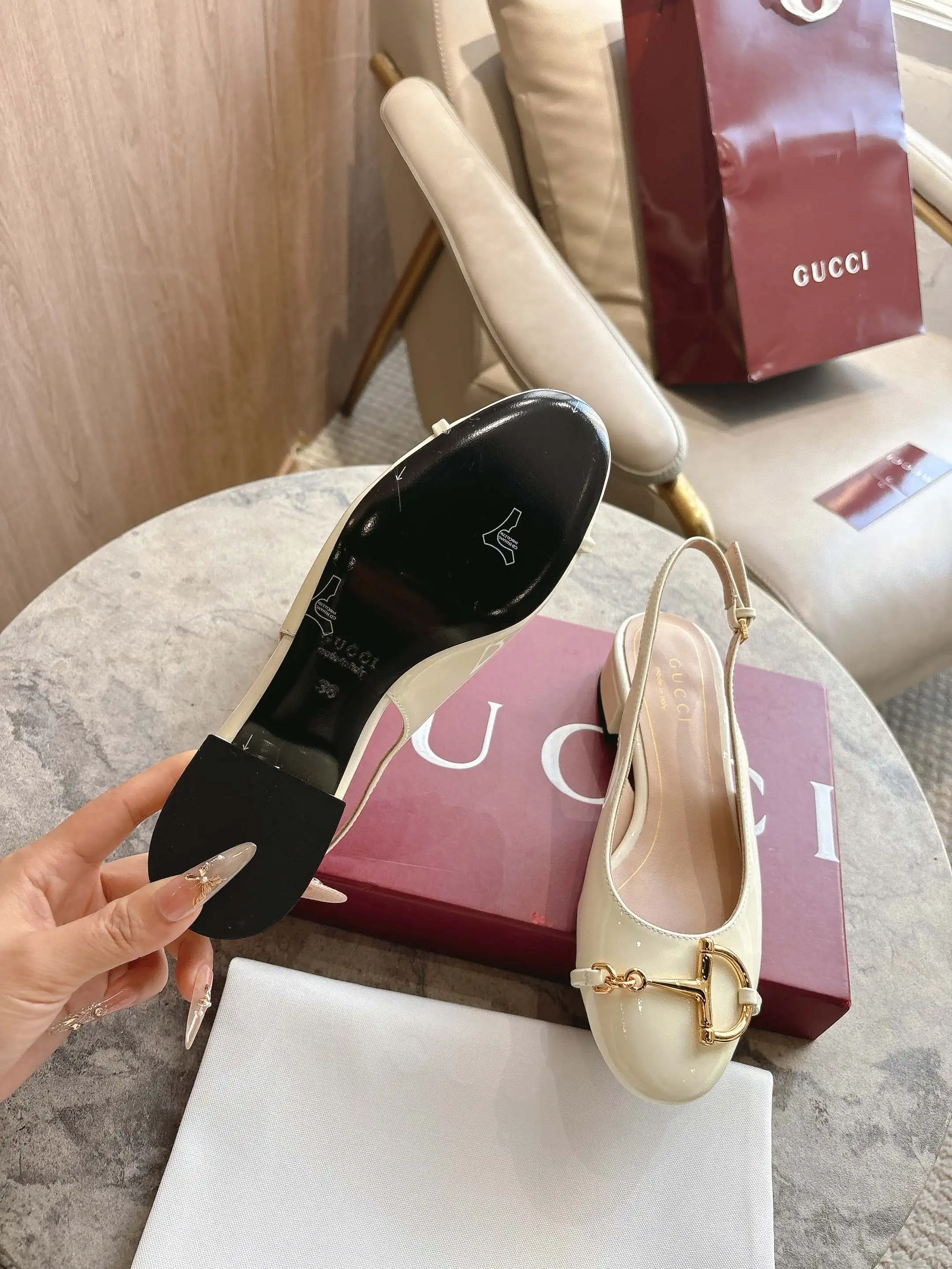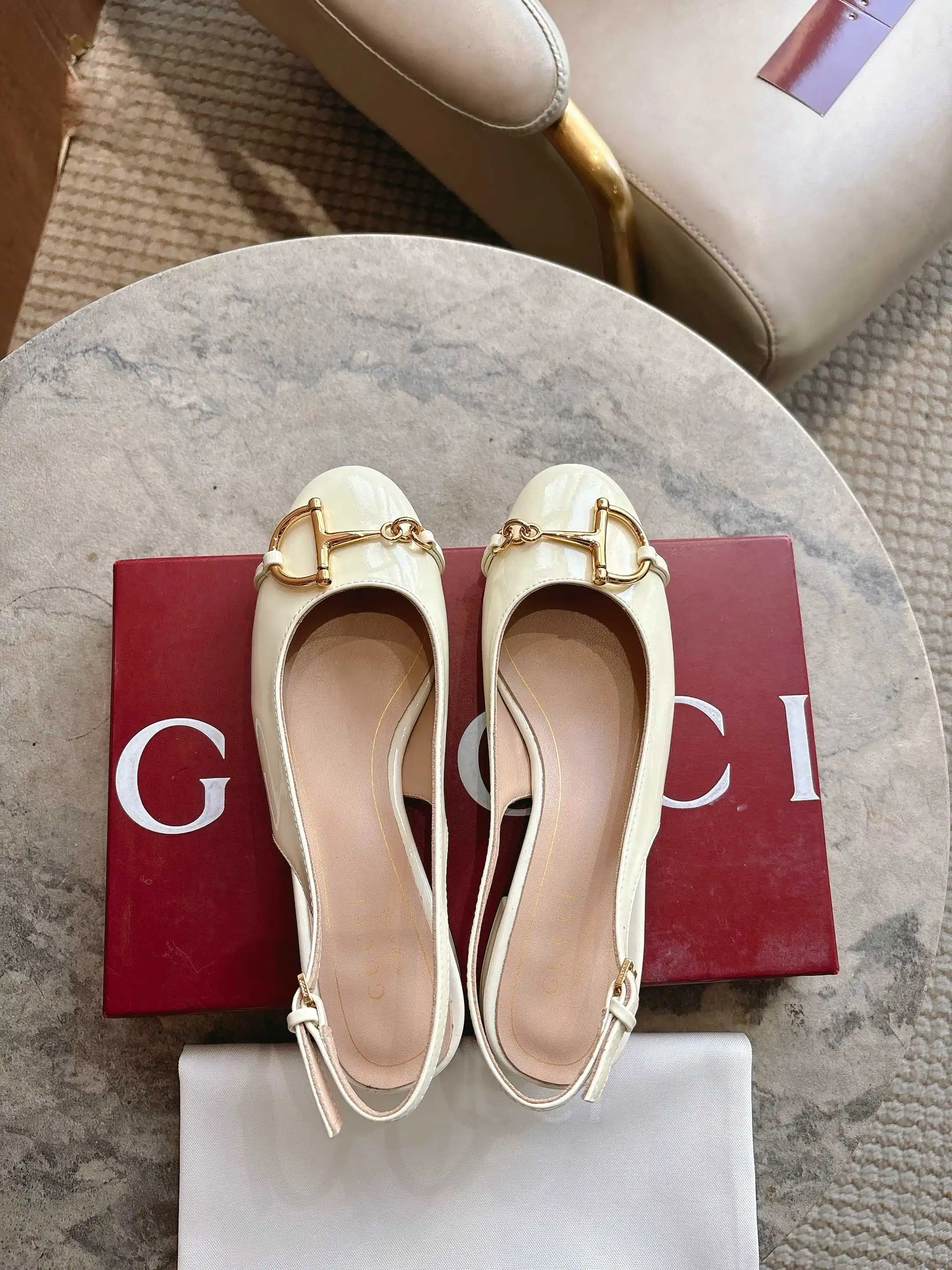 1168-5 白 35-42 2026春夏系列, 这款女士芭蕾舞平底采用光泽感漆皮匠心打造 以品牌标志性元素焕新诠释经典廓形 金色调半马衔扣细节增添雅致风范 透过当代视角致敬品牌马术传承