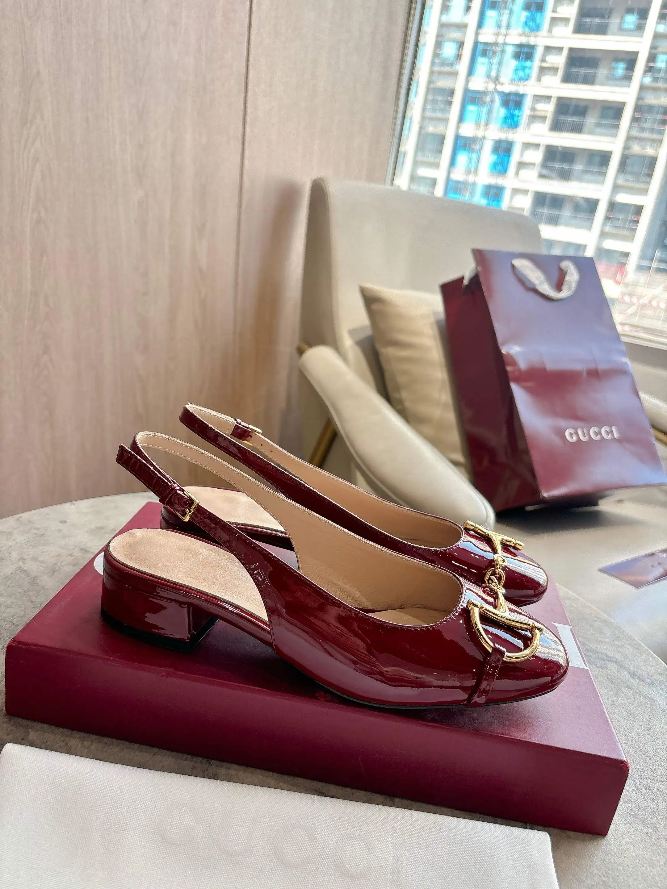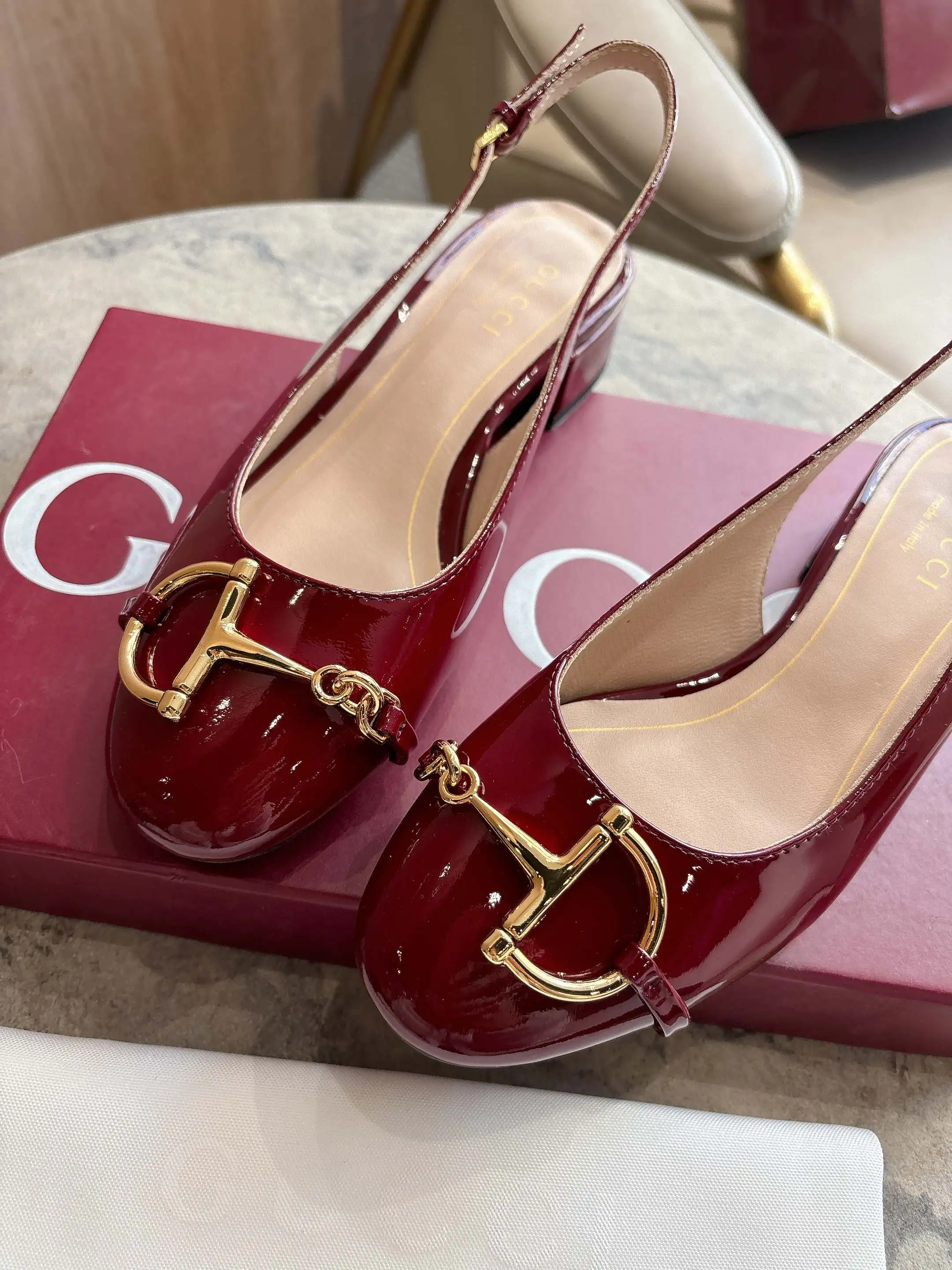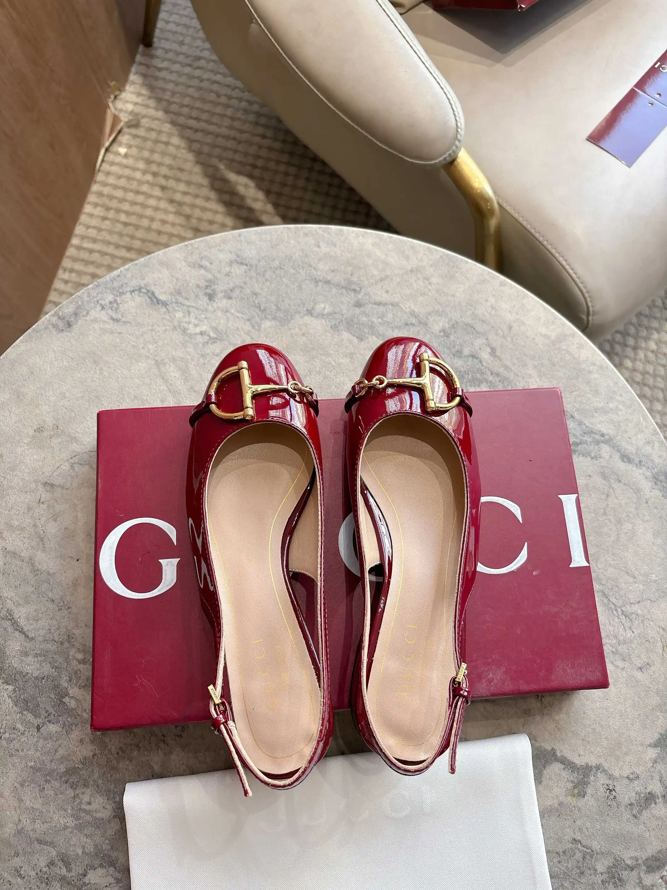 1168-5 酒红 35-42 2026春夏系列, 这款女士芭蕾舞平底采用光泽感漆皮匠心打造 以品牌标志性元素焕新诠释经典廓形 金色调半马衔扣细节增添雅致风范 透过当代视角致敬品牌马术传承