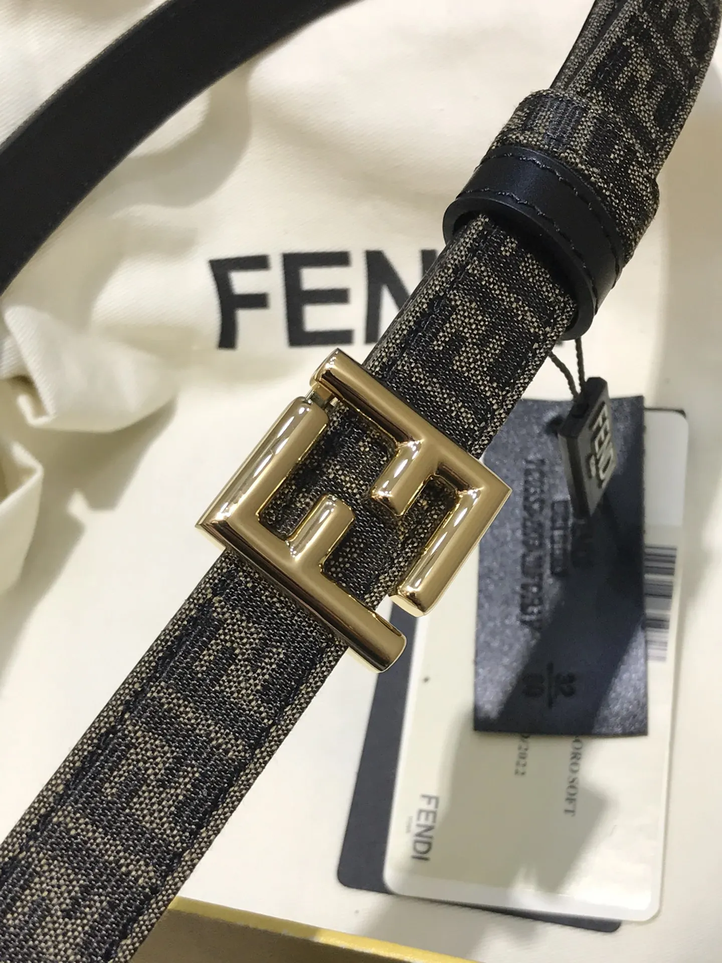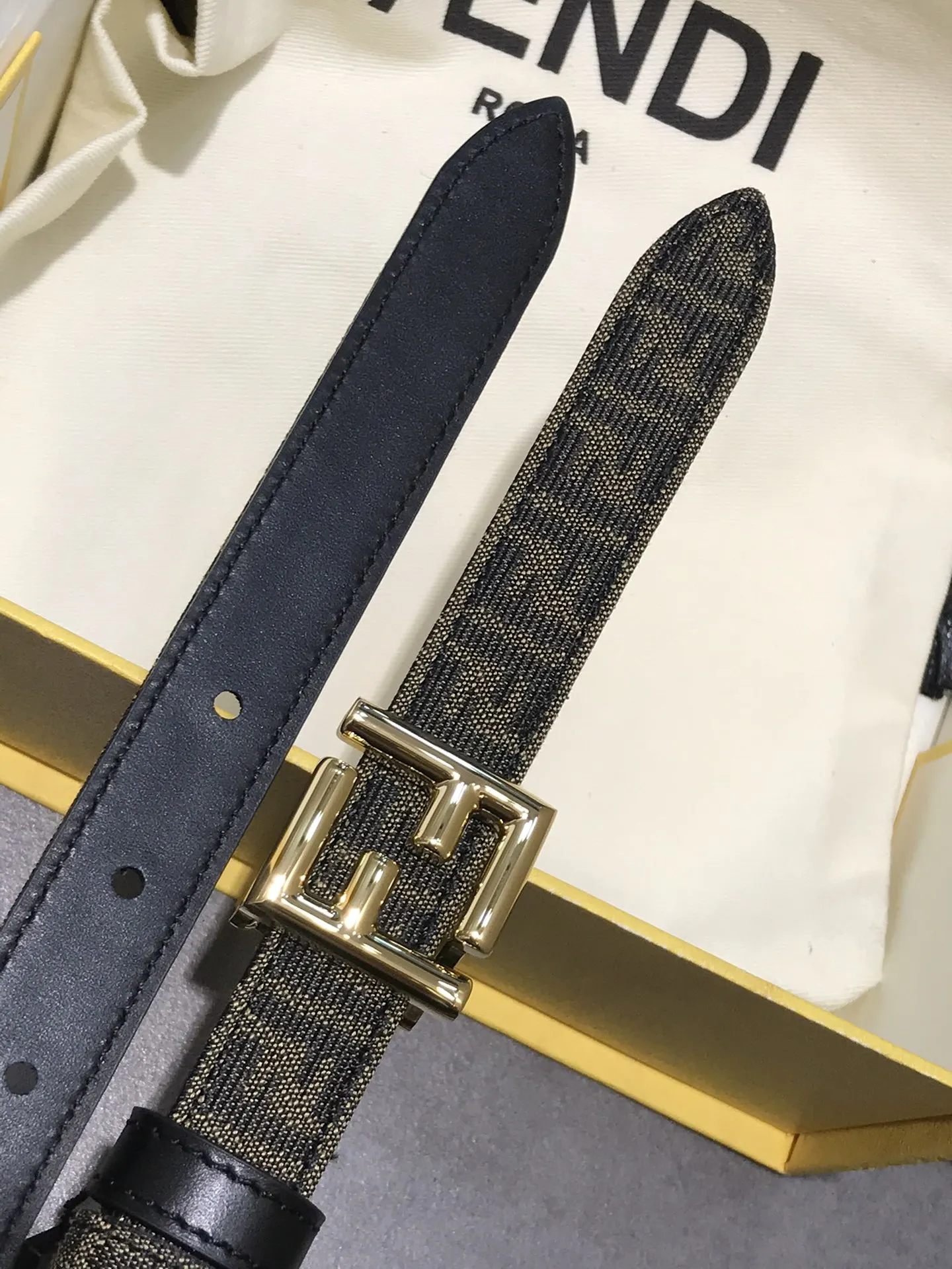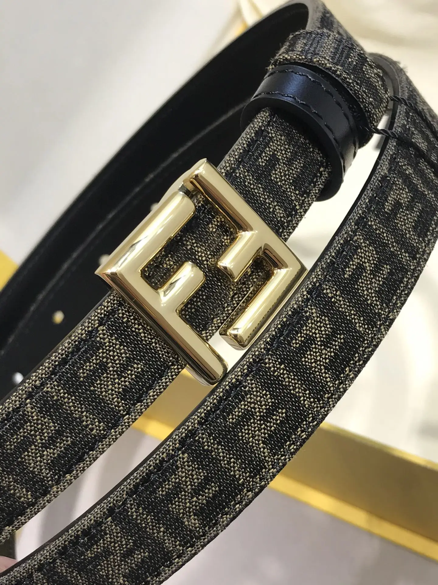 FD女款 宽20MM 老花纹F标志造型皮带 支持NFC钉扣式带扣 进口黑色小牛皮制成 镀金表面金属制品 原版细节走线 品质保证 非市场通货