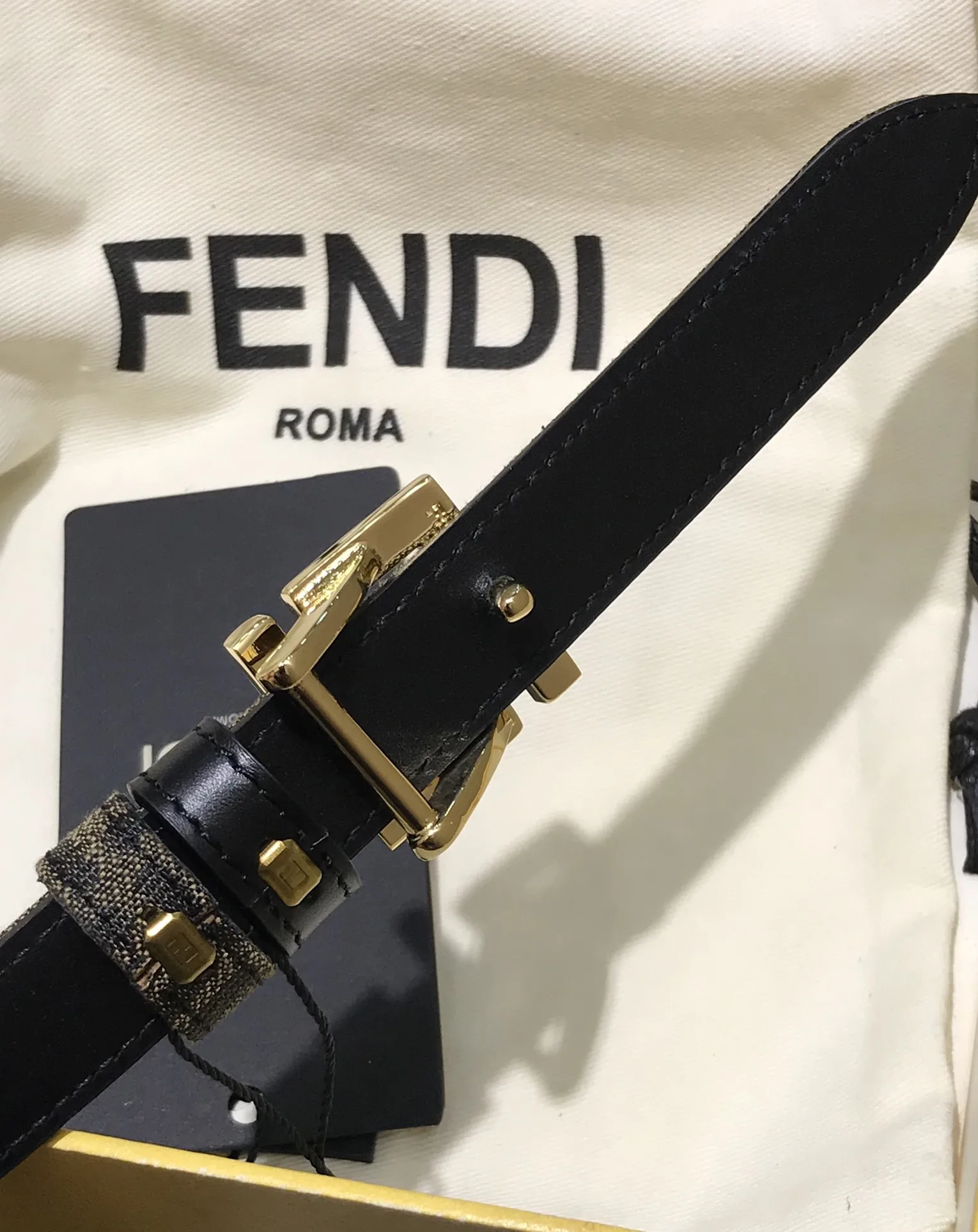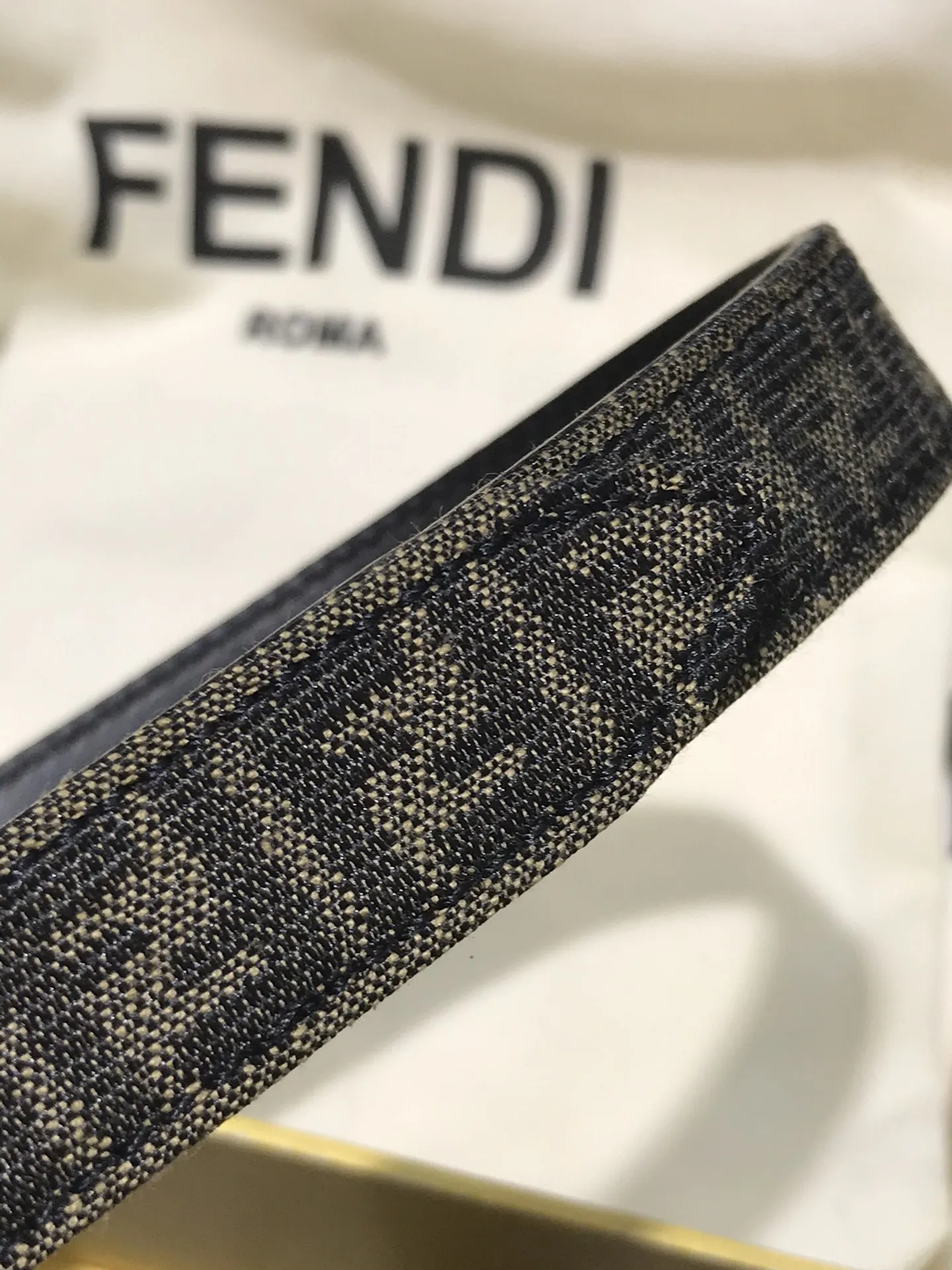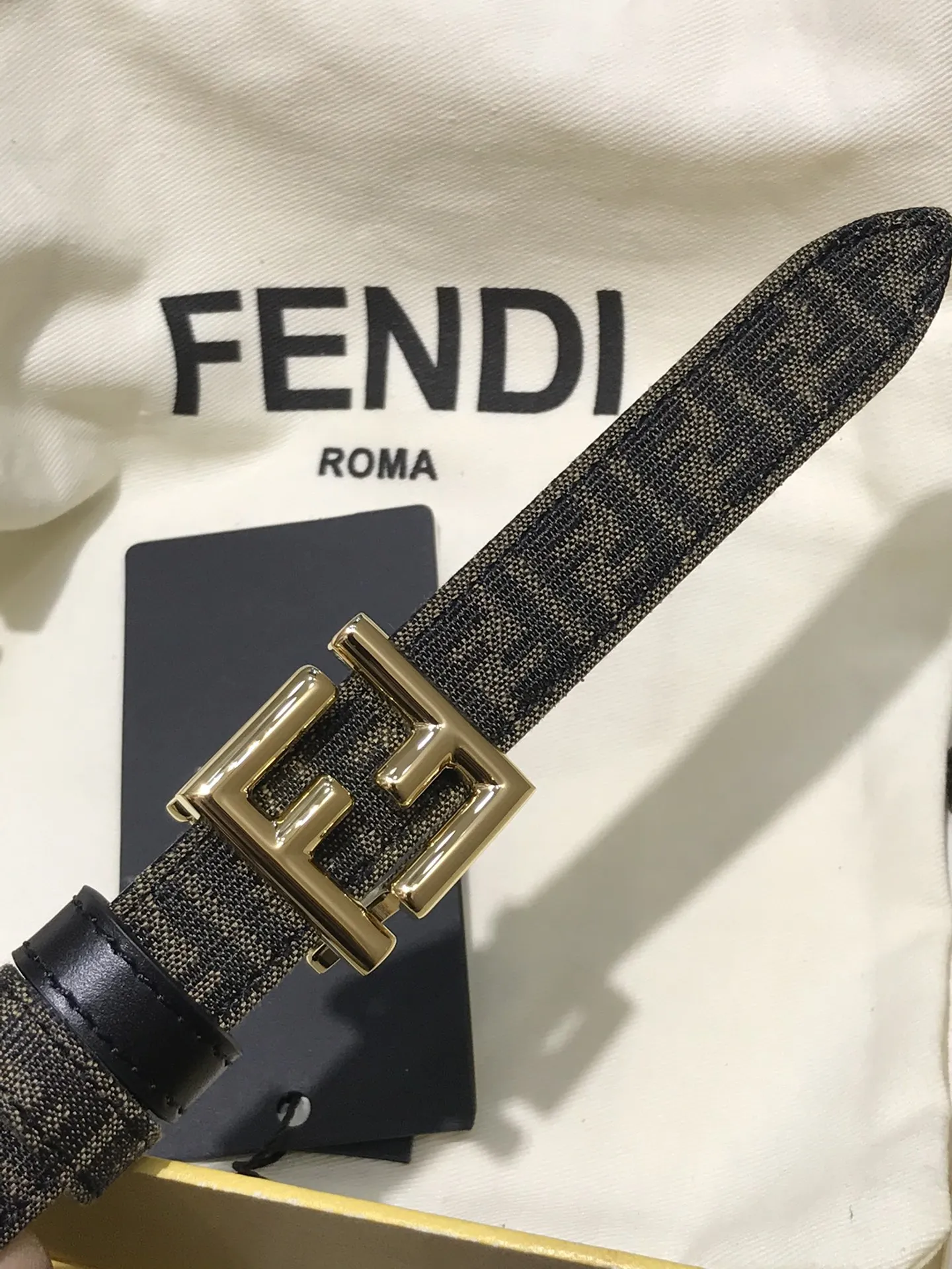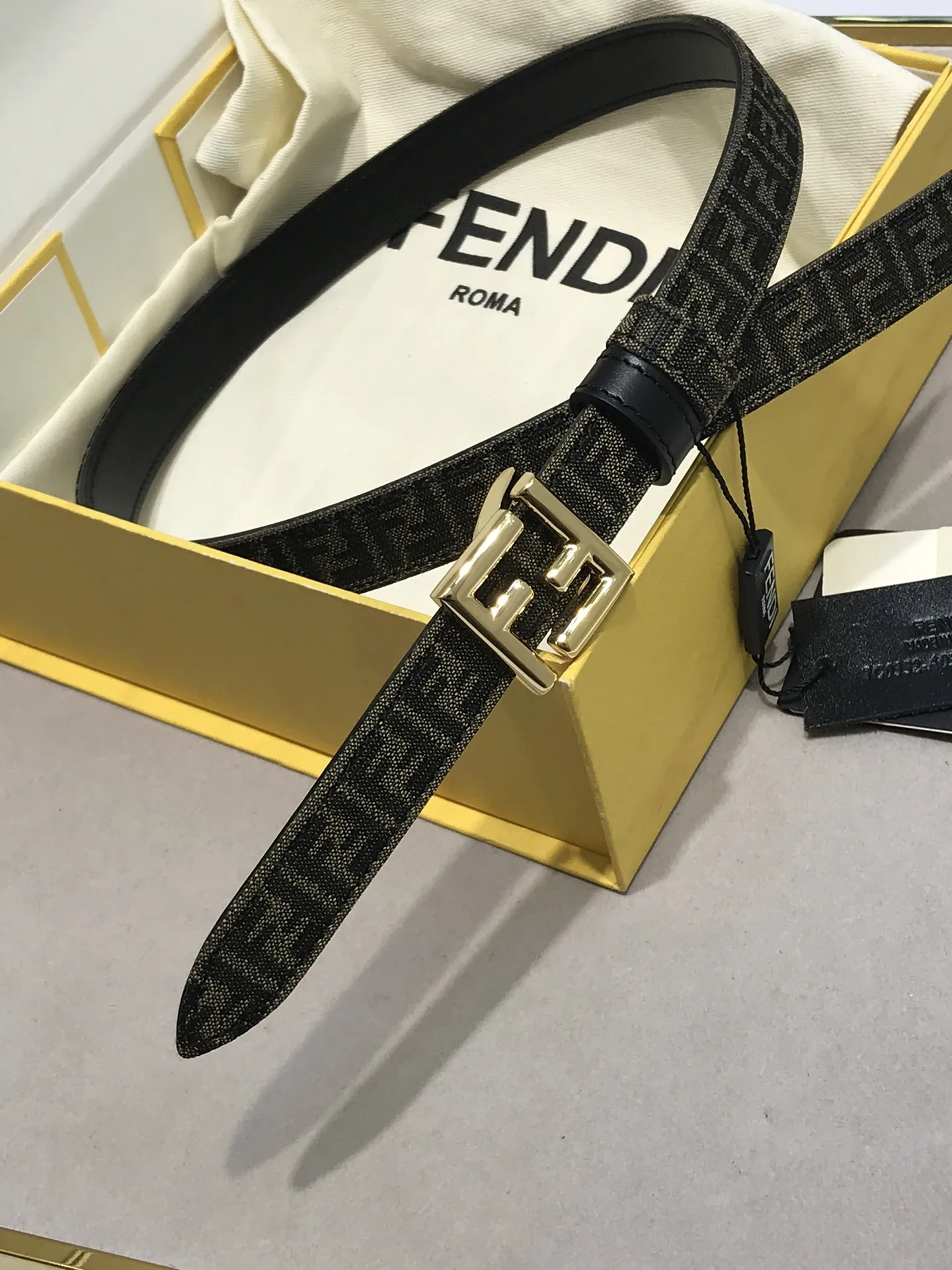 FD女款 宽20MM 老花纹F标志造型皮带 支持NFC钉扣式带扣 进口黑色小牛皮制成 镀金表面金属制品 原版细节走线 品质保证 非市场通货