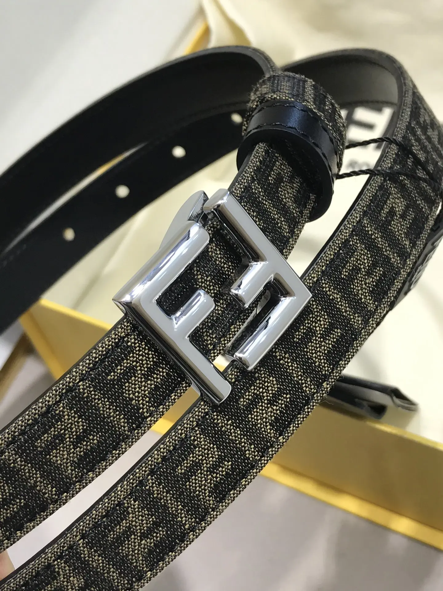 FD女款 宽20MM 老花纹F标志造型皮带 支持NFC钉扣式带扣 进口黑色小牛皮制成 镀金表面金属制品 原版细节走线 品质保证 非市场通货