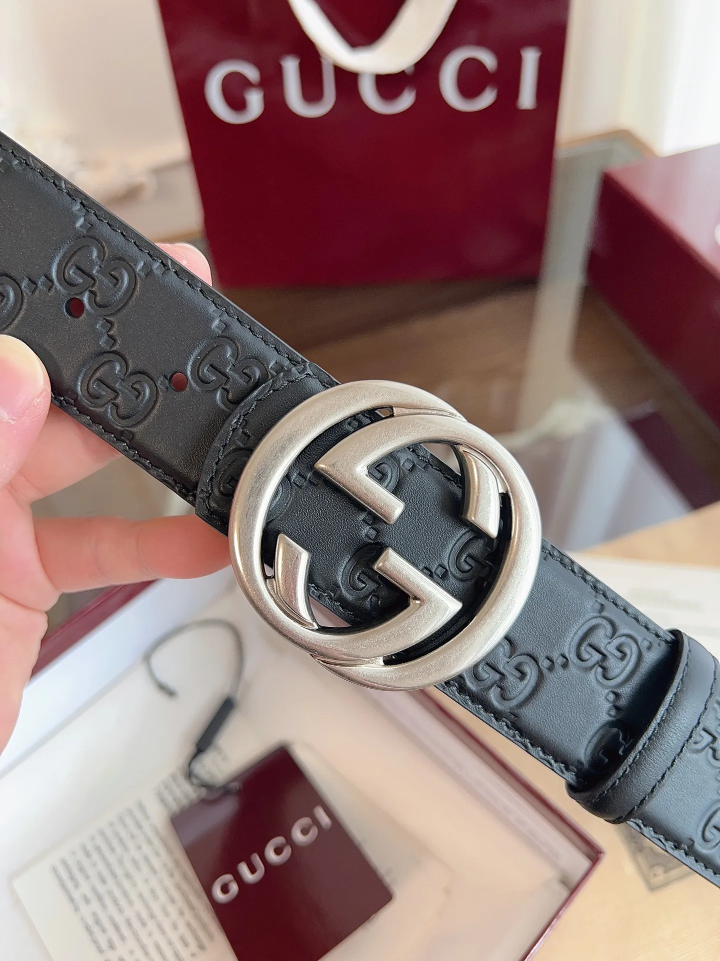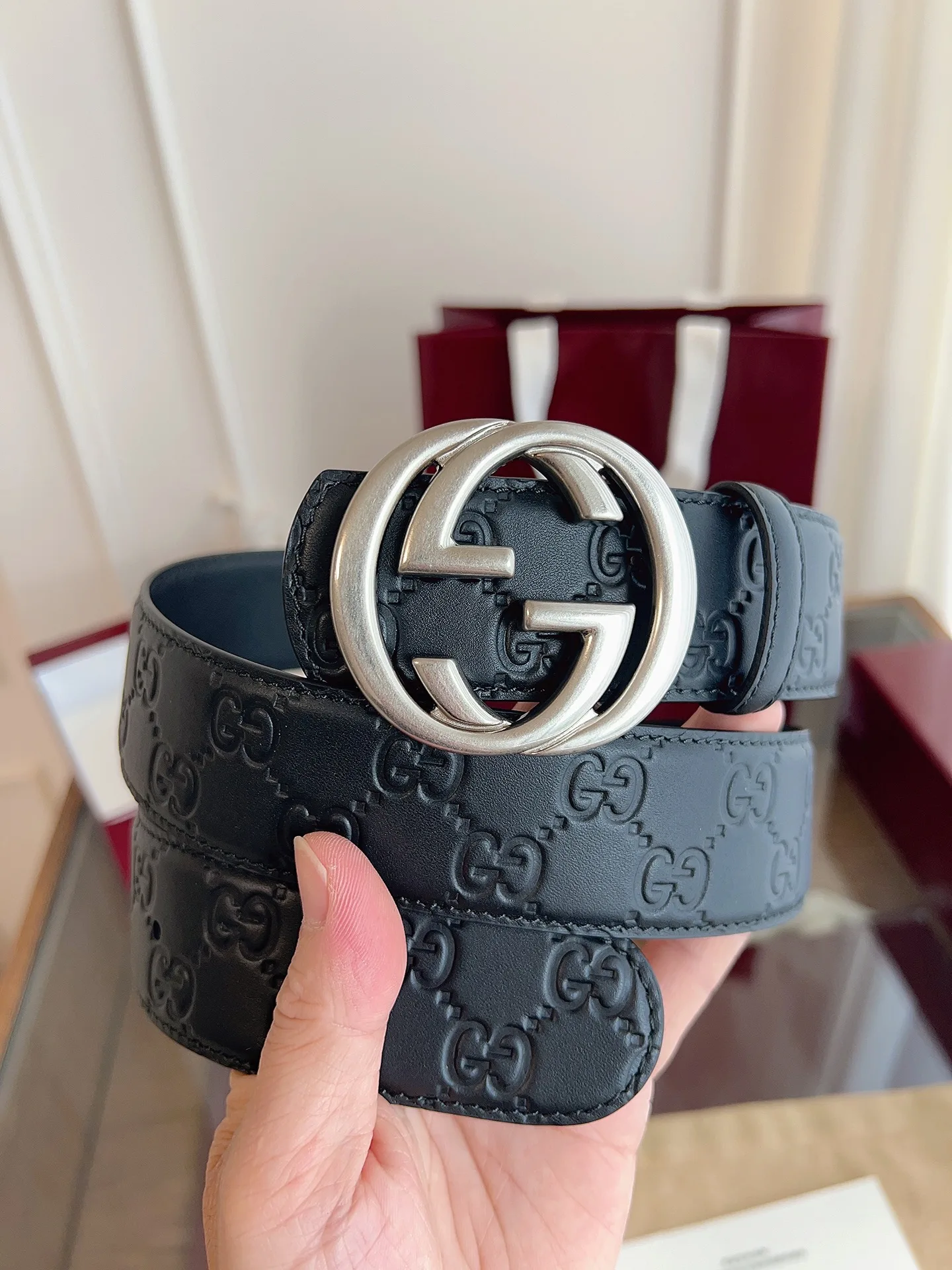 Gucci 这款男士腰带亮眼吸睛 是2026早春系列之一 腰带扣设有一个销钉 可轻松翻转互扣式双G造型配件 一面为黑色GG印花压纹牛皮革 另一面为黑色皮革 宽度4cm