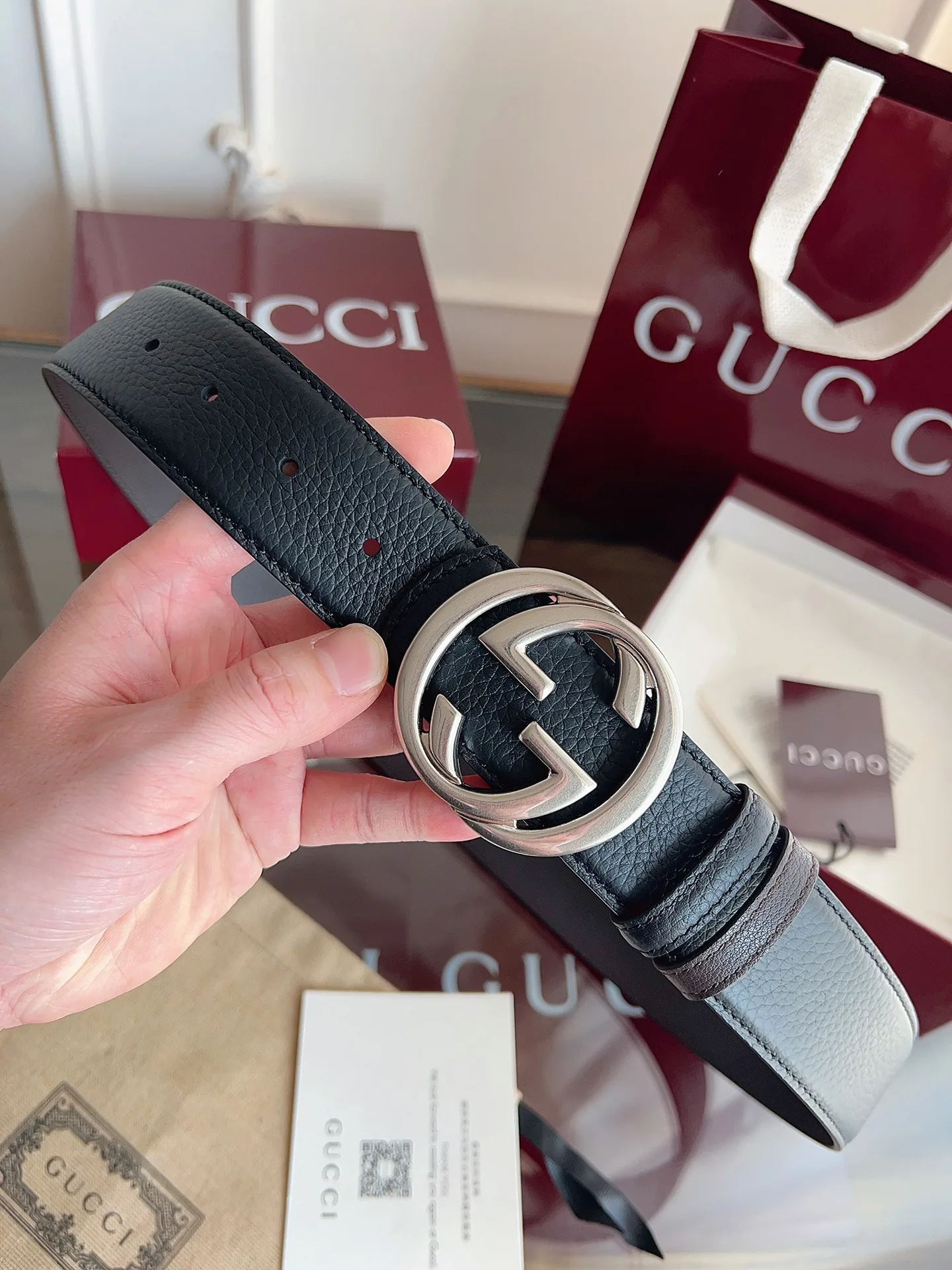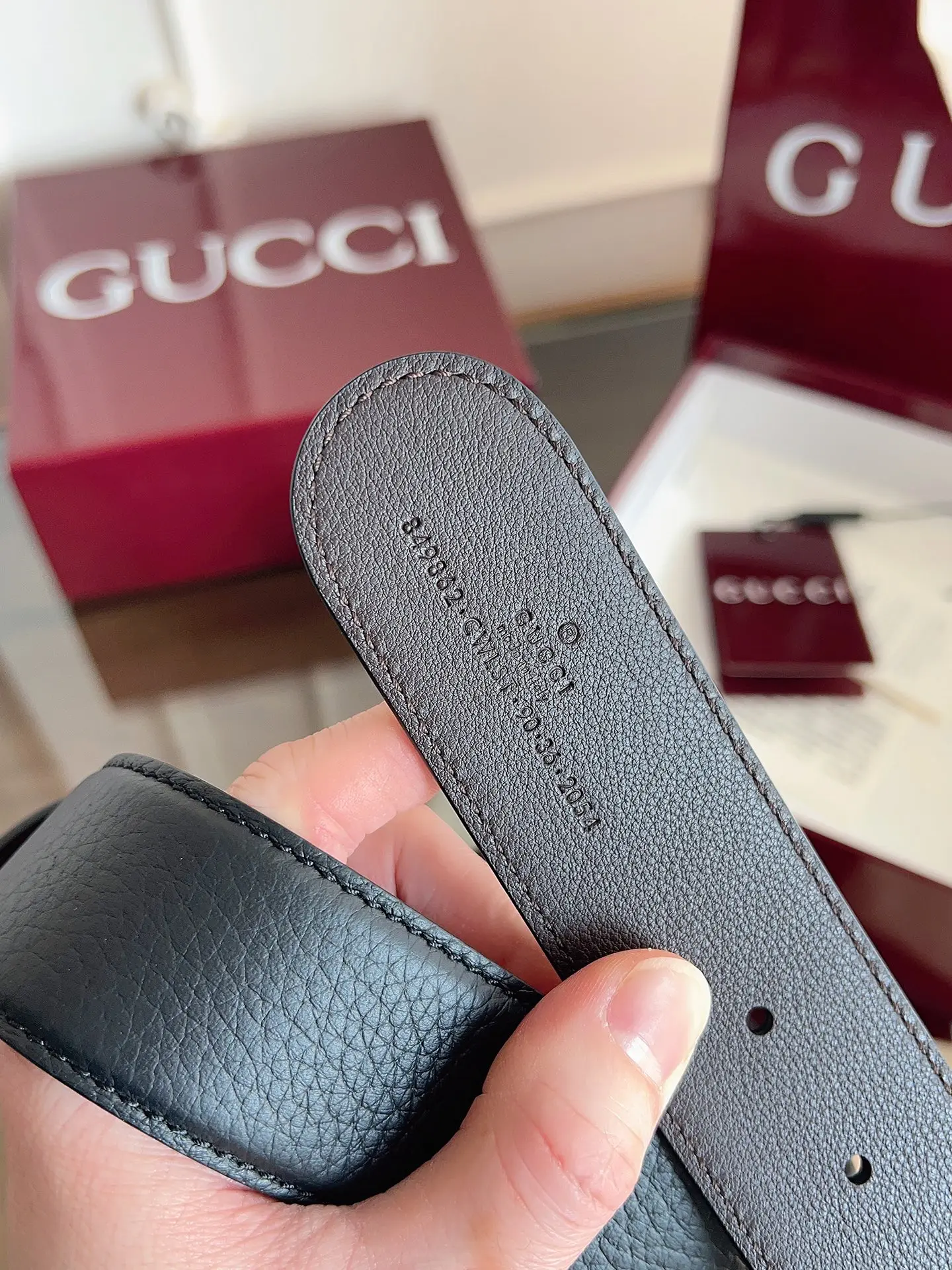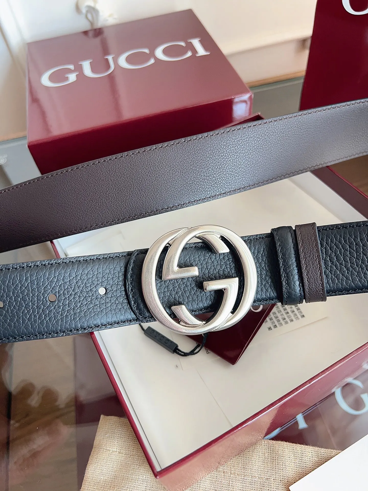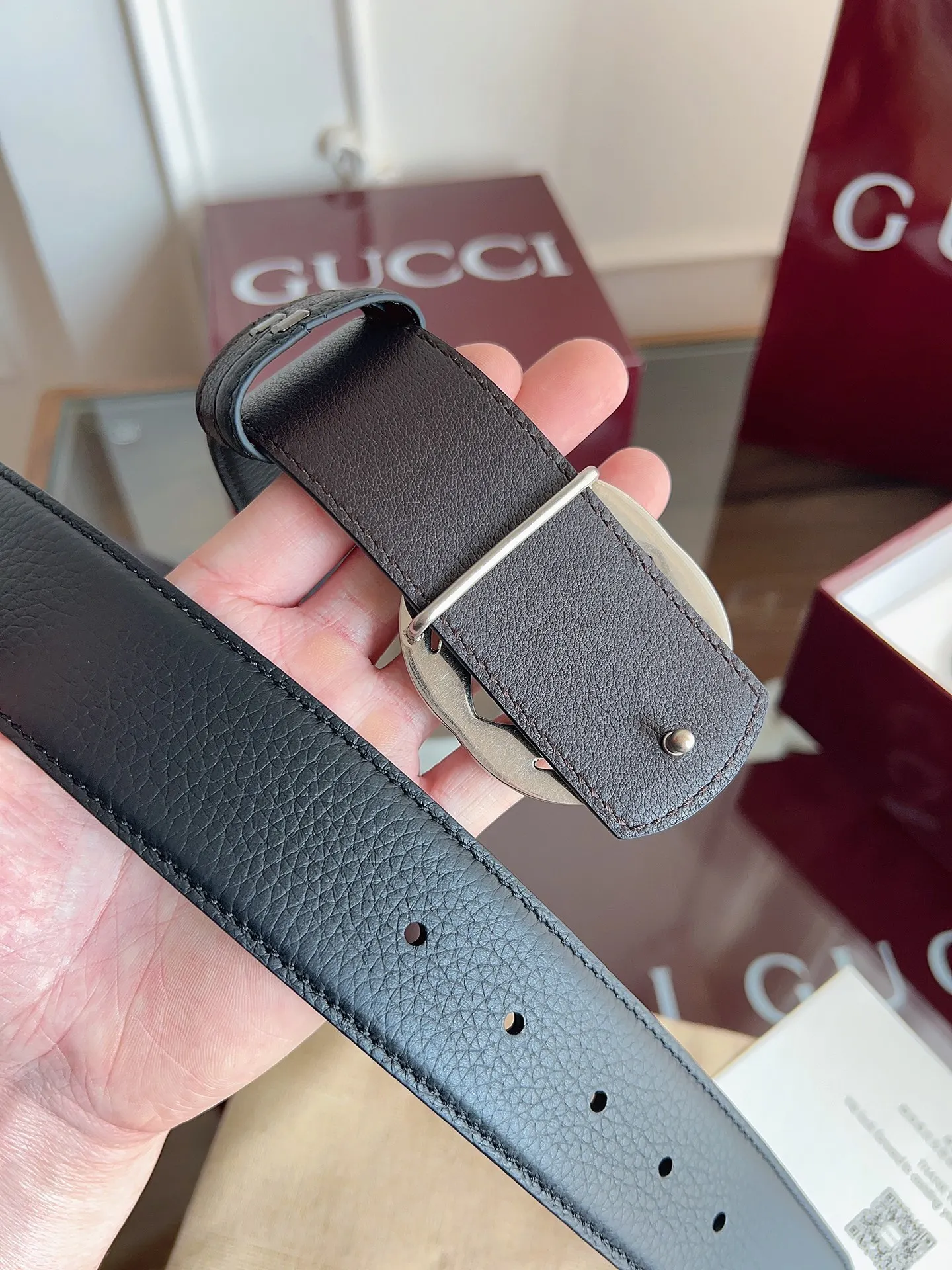 Gucci 这款男士腰带亮眼吸睛 是2026早春系列之一 腰带扣设有一个销钉 可轻松翻转互扣式双G造型配件 一面为黑色牛皮革 另一面为深棕牛皮革 宽度4cm 一带设计 双面使用