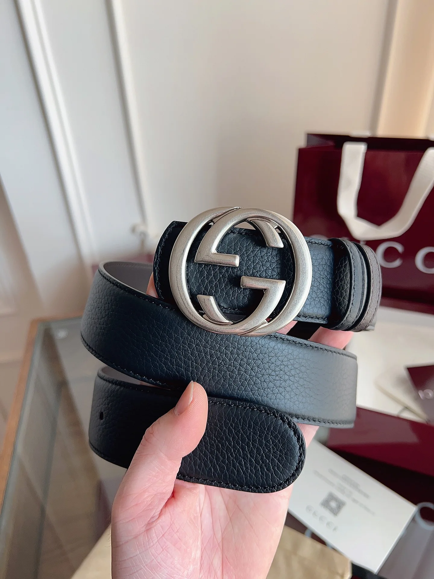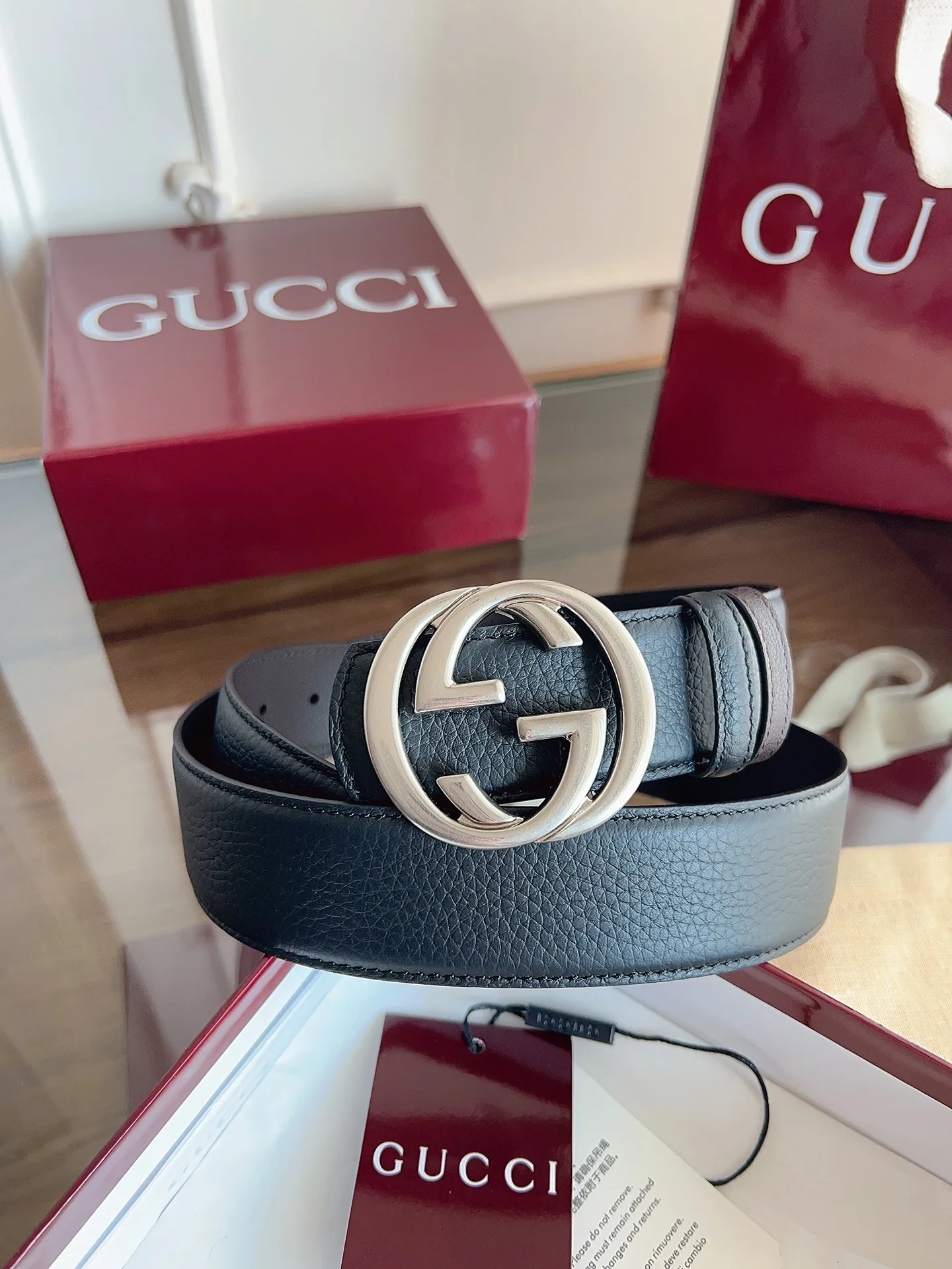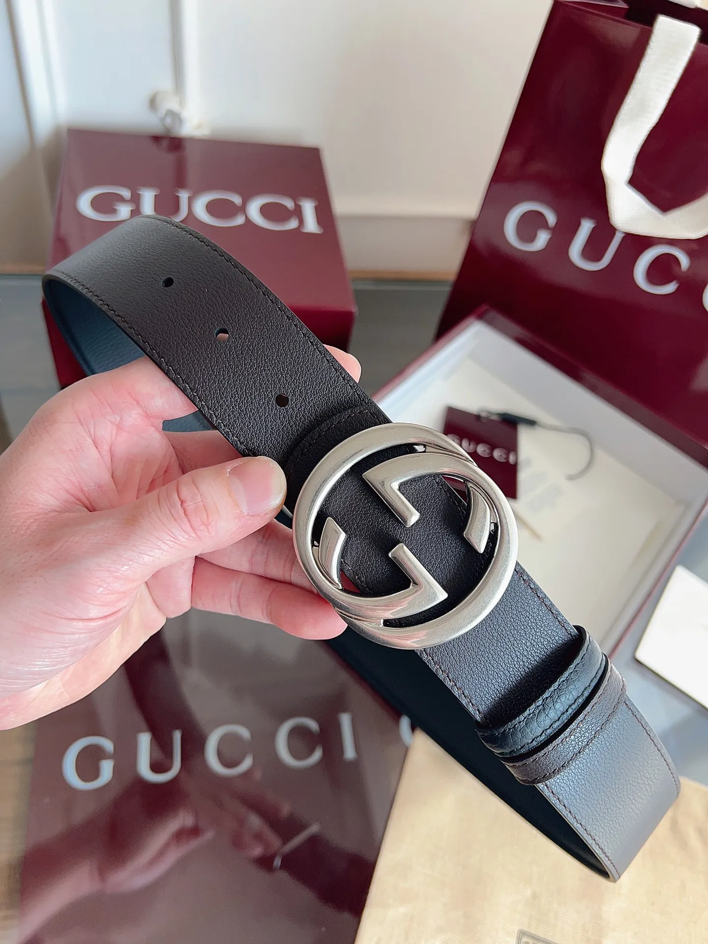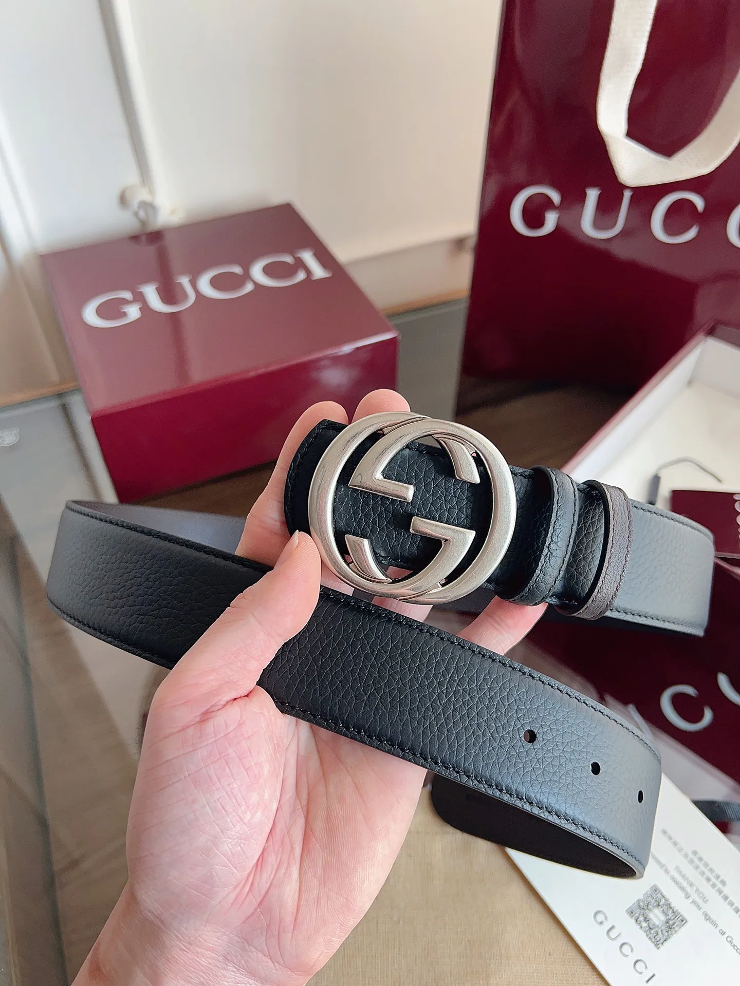 Gucci 这款男士腰带亮眼吸睛 是2026早春系列之一 腰带扣设有一个销钉 可轻松翻转互扣式双G造型配件 一面为黑色牛皮革 另一面为深棕牛皮革 宽度4cm 一带设计 双面使用