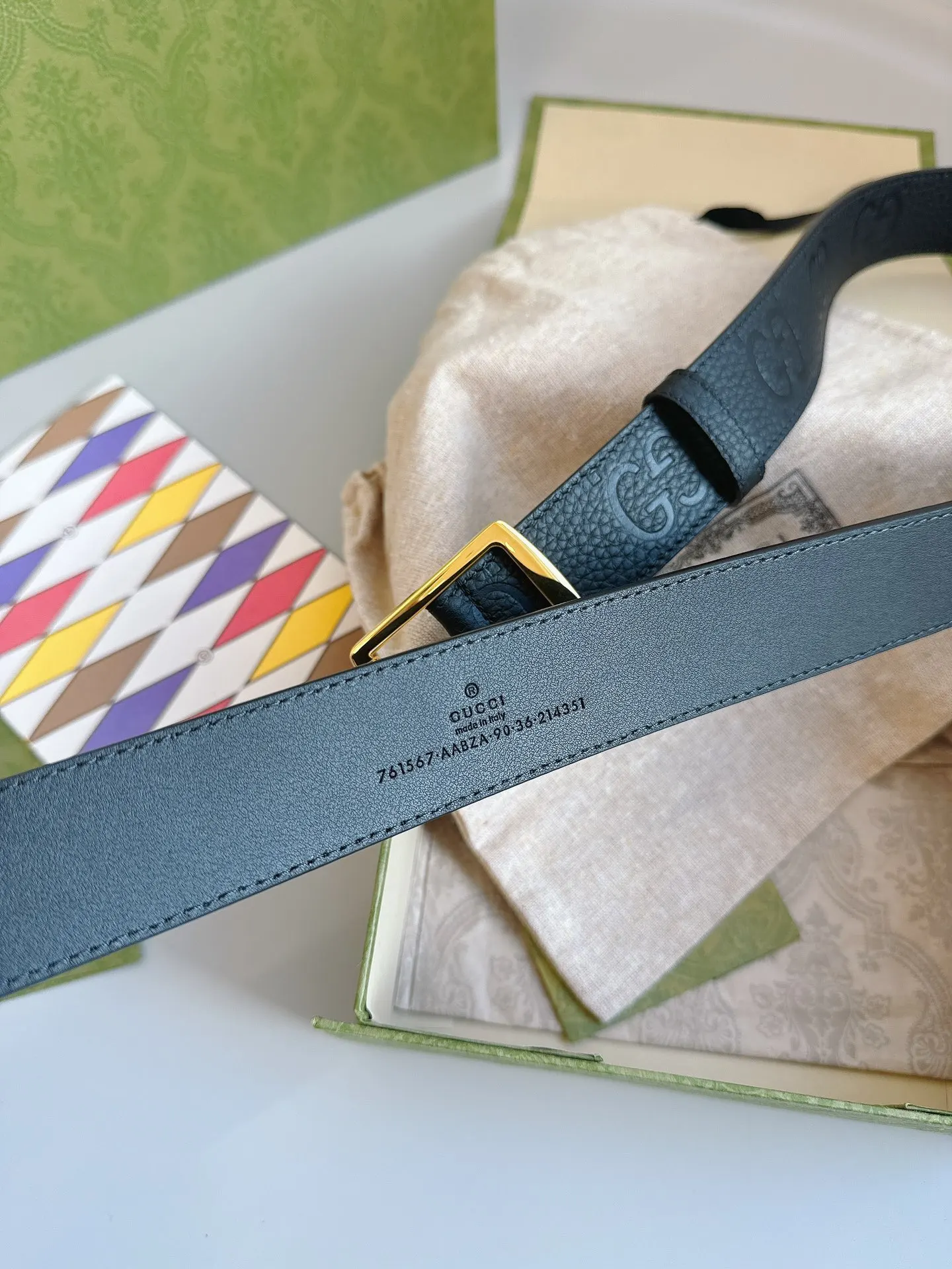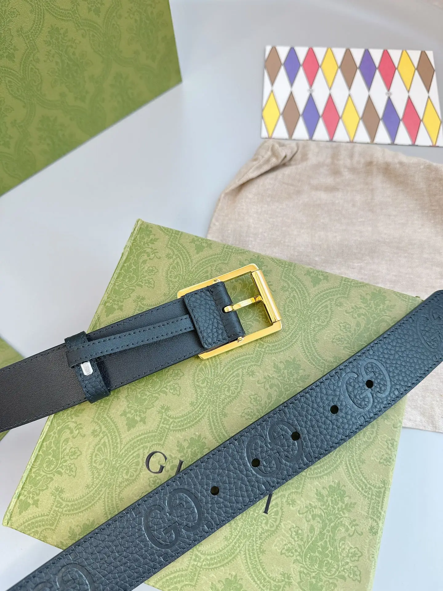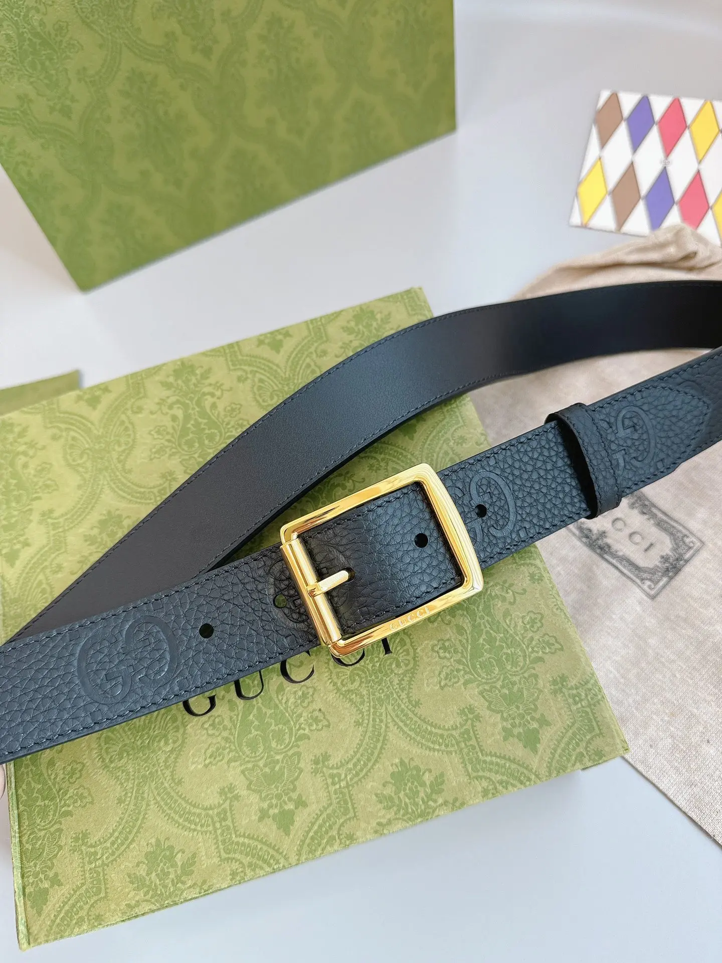 每一季 品牌典藏设计中的标志性素都会吐故纳新 为经典注入新意 Guccio Gucci字母交织图案巧妙融入纹理和材质 以印花压纹点缀这款黑色皮革腰带 方形针扣式双G配件赋予这款配饰以独特魅力