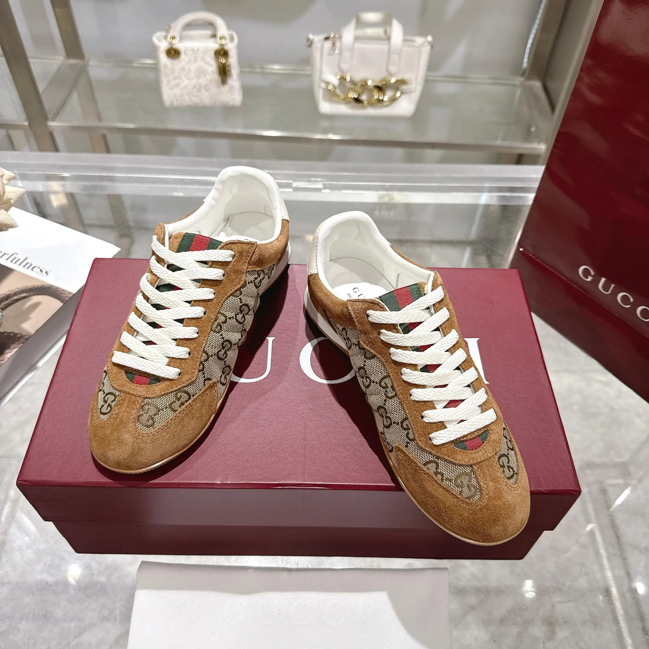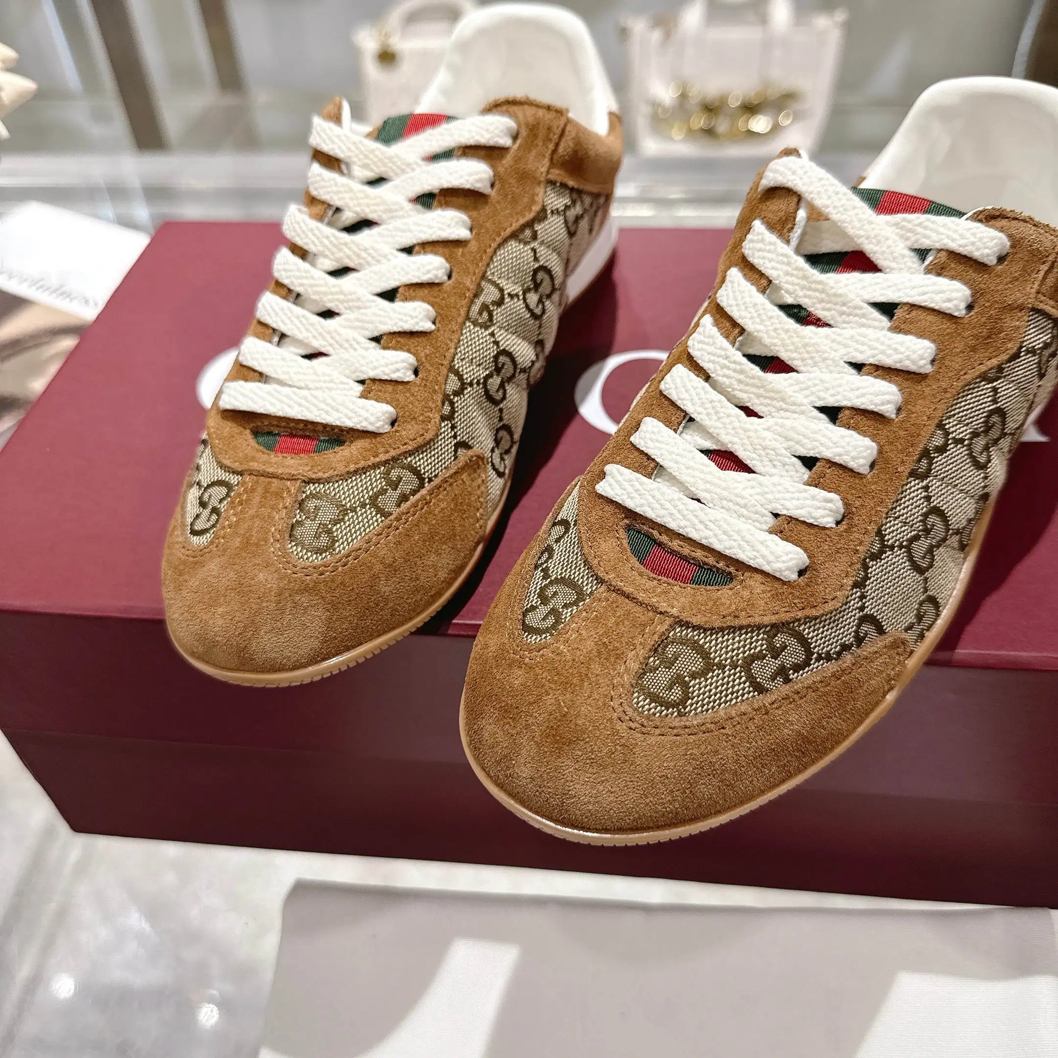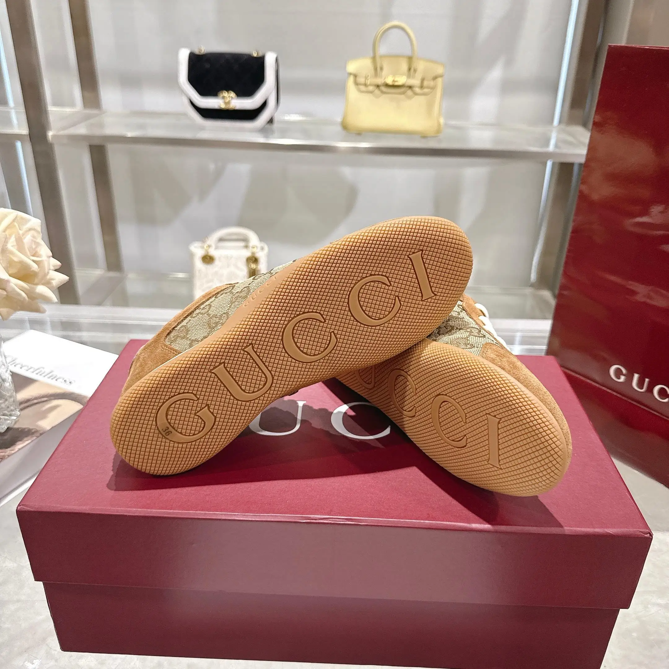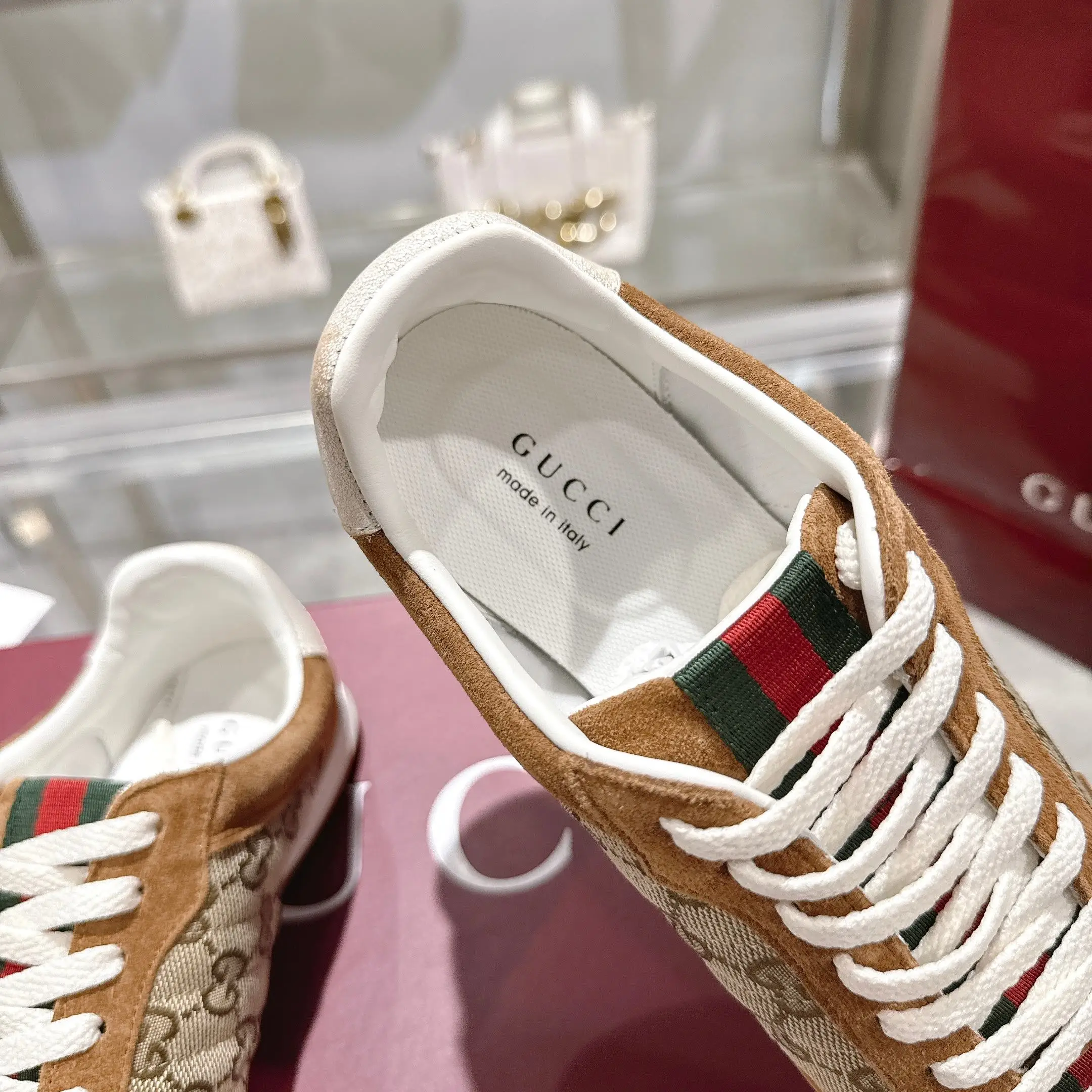 GG德训鞋 爆款 轻盈设计焕新诠释运动风尚 行动间彰显精致质感 侧边缝线细节增添点睛之笔 棕色牛反绒+老花GG帆布面料 白色牛皮里 乳胶一体成型垫脚 鞋舌与后跟饰标志性红绿色织带 双色橡胶鞋底 男女同款 女码35-40码 男款 39-45码