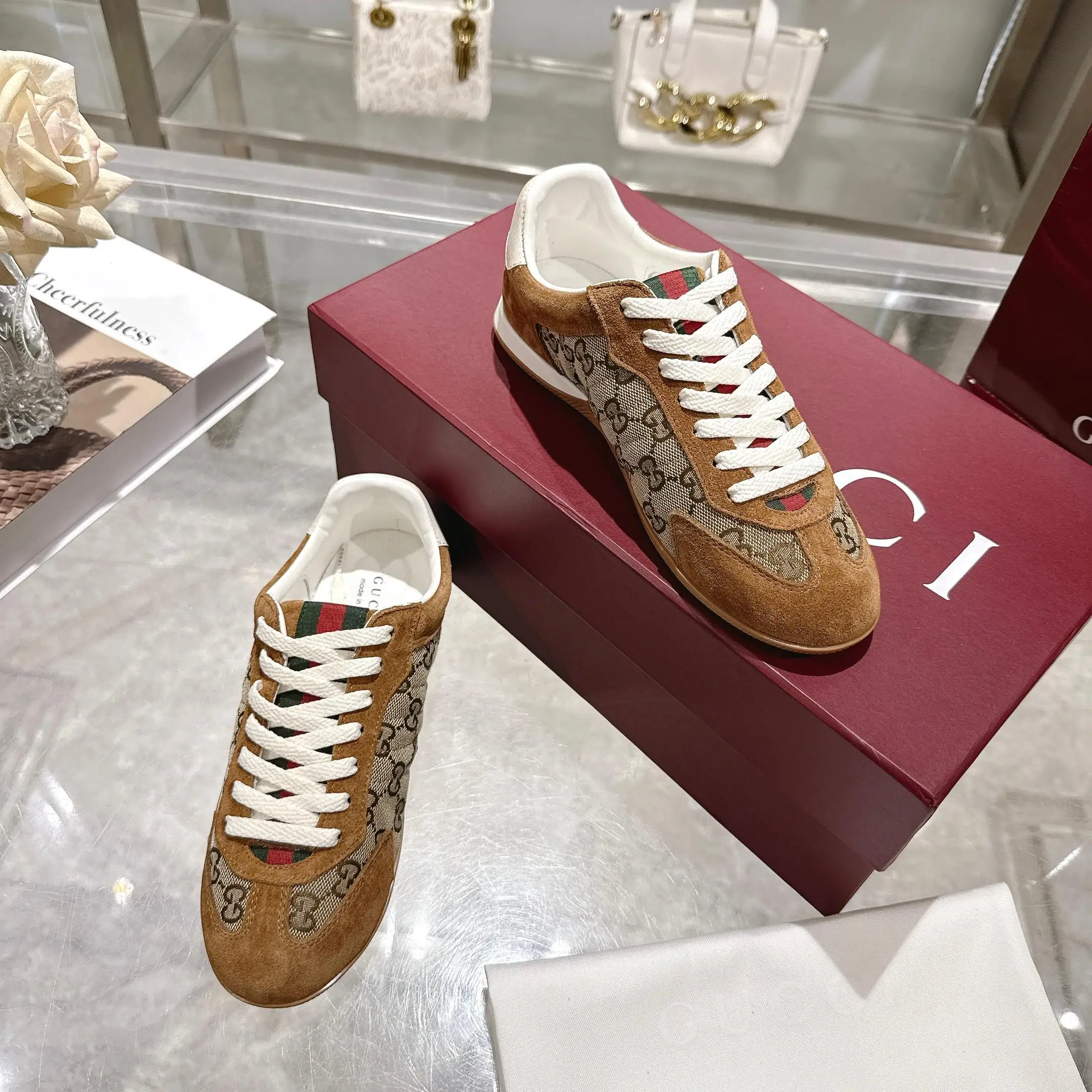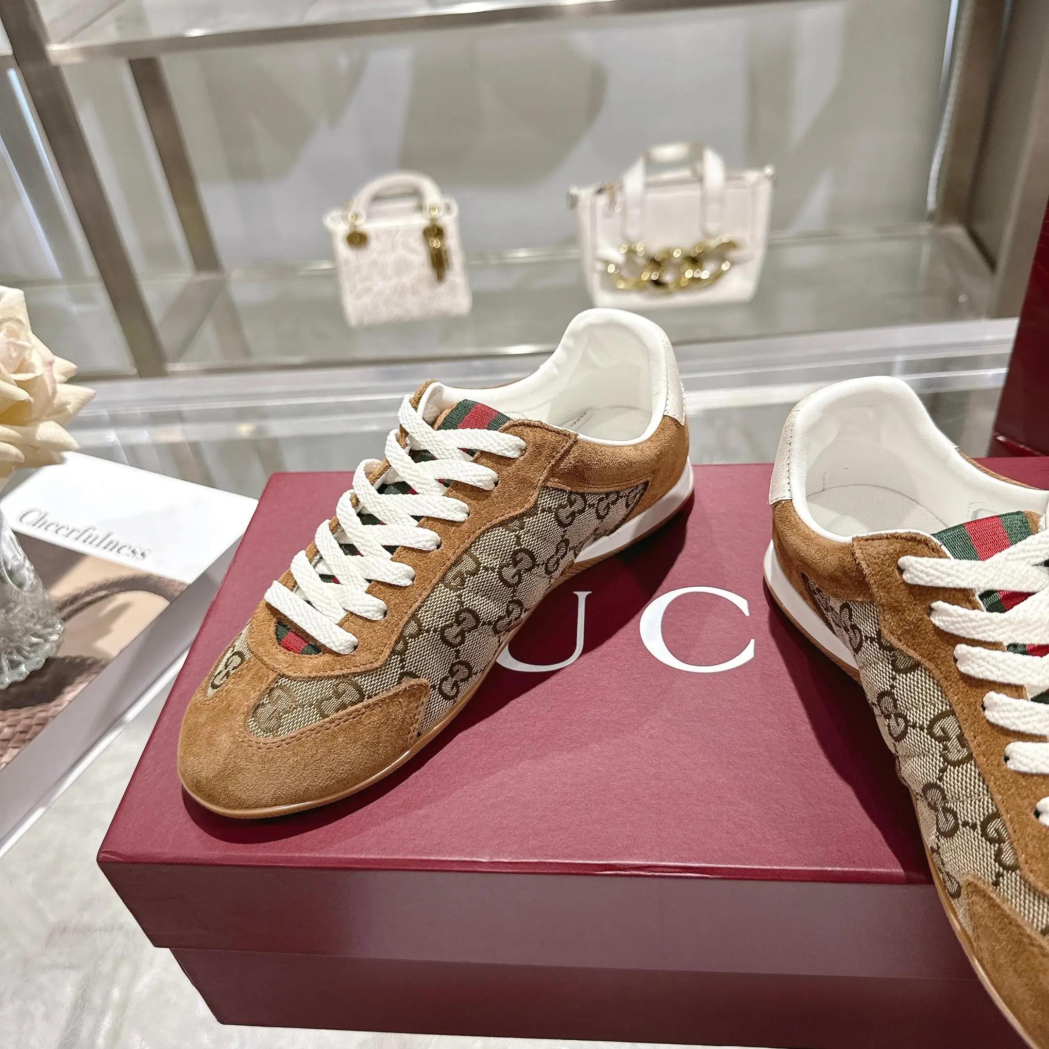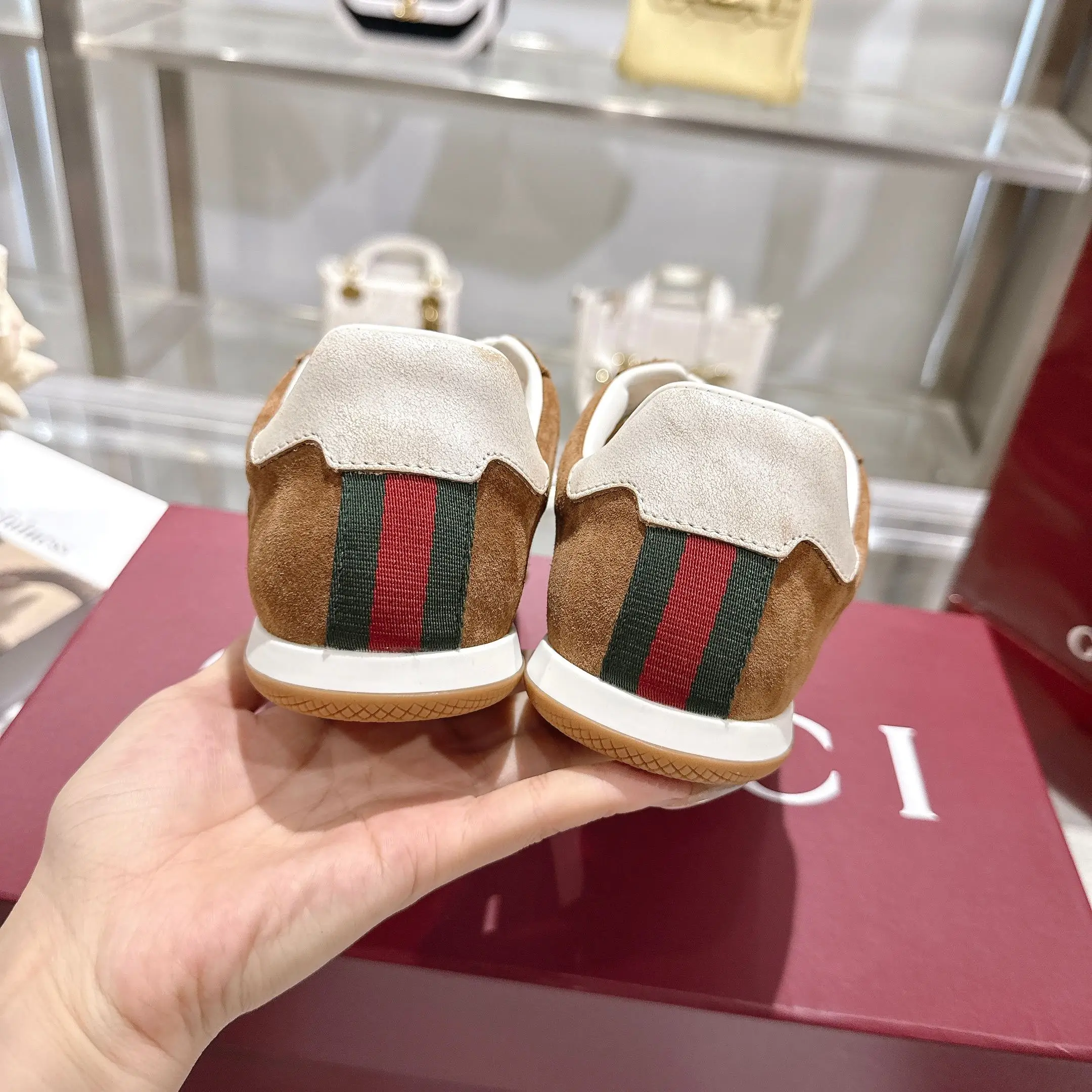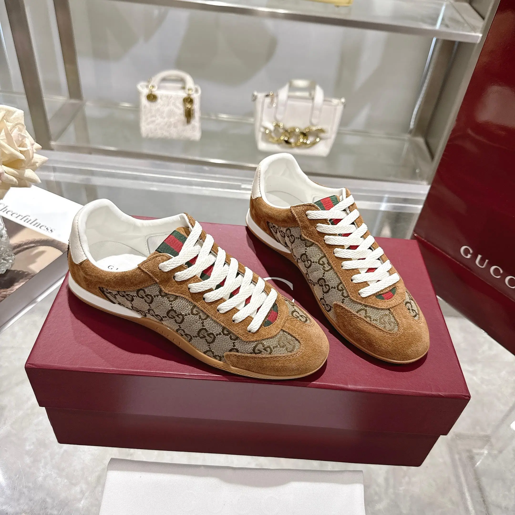 GG德训鞋 爆款 轻盈设计焕新诠释运动风尚 行动间彰显精致质感 侧边缝线细节增添点睛之笔 棕色牛反绒+老花GG帆布面料 白色牛皮里 乳胶一体成型垫脚 鞋舌与后跟饰标志性红绿色织带 双色橡胶鞋底 男女同款 女码35-40码 男款 39-45码